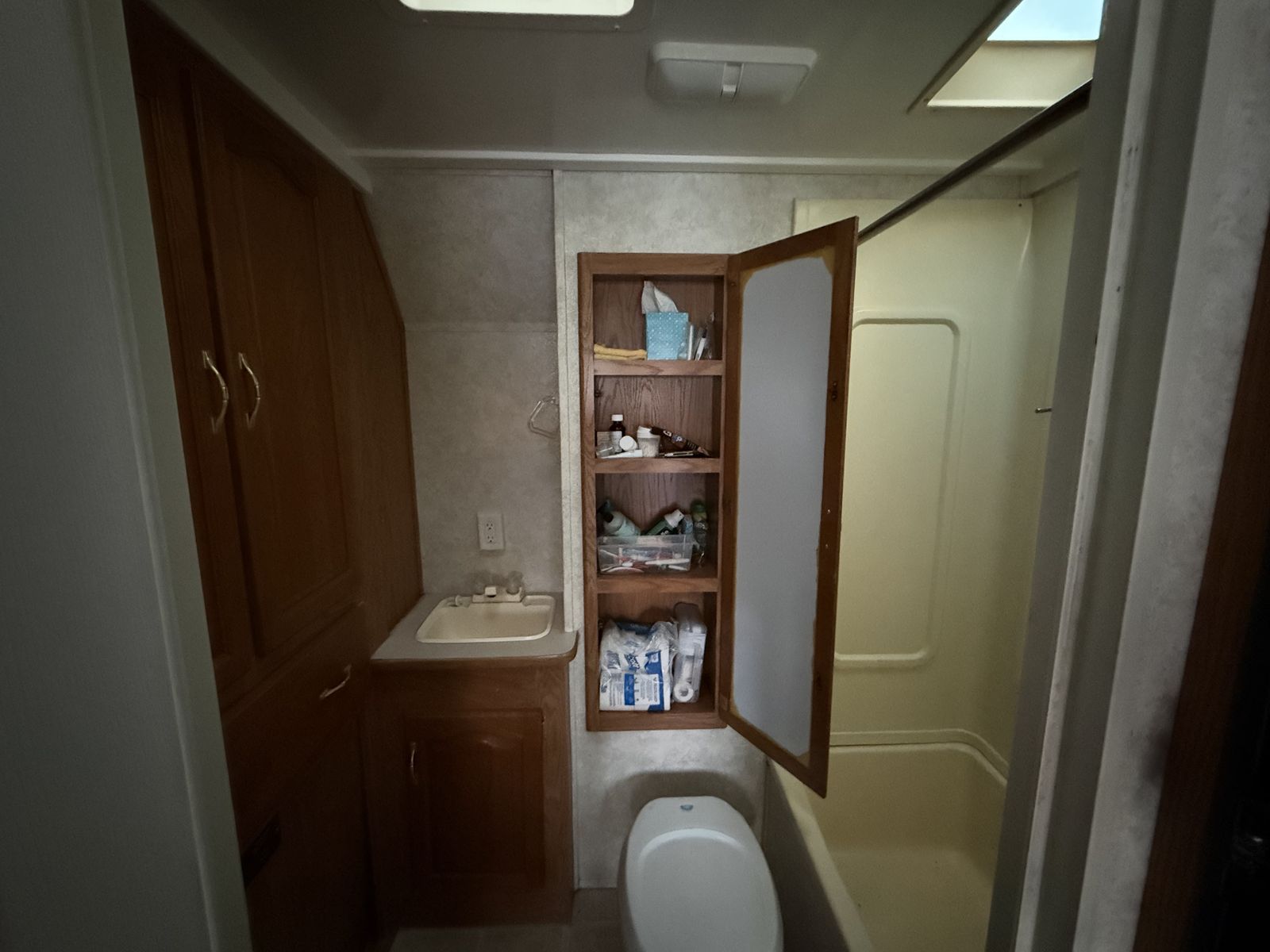 Features: -100 gallon fresh water tank -28 gallon black tank -32 gallon grey tank -25 gallon fuel station with pump -Onboard Onan 4000 generator -Electric tongue jack -Two 30 lb propane tanks -Furnace, A/C, stove, oven, microwave, water heater, fridge/freezer, all faucets/toilet/plumbing in great working condition -Sound system with interior and exterior speakers -Dry weight 5190 lbs -Exterior total length 24’ (21’ box)