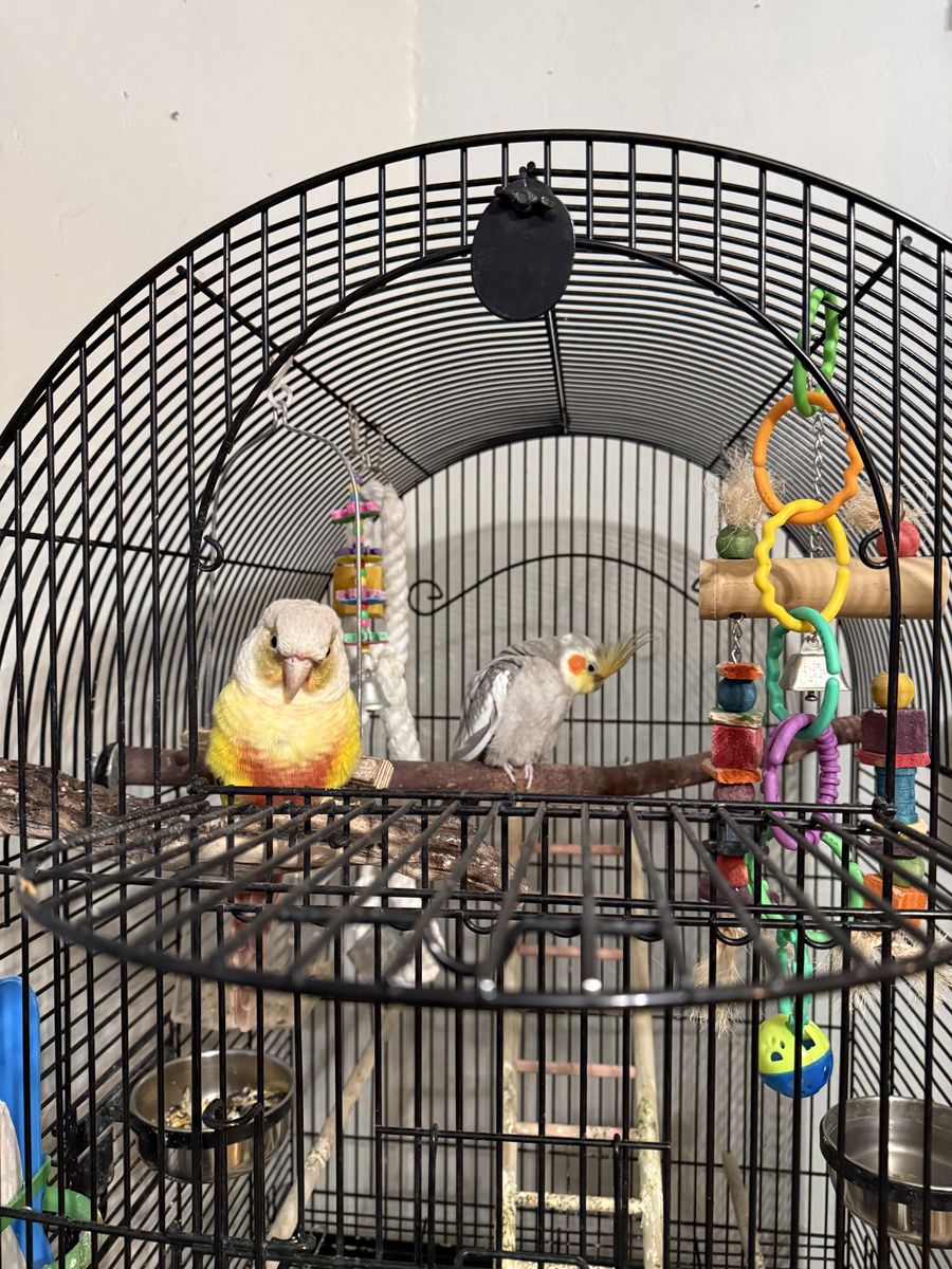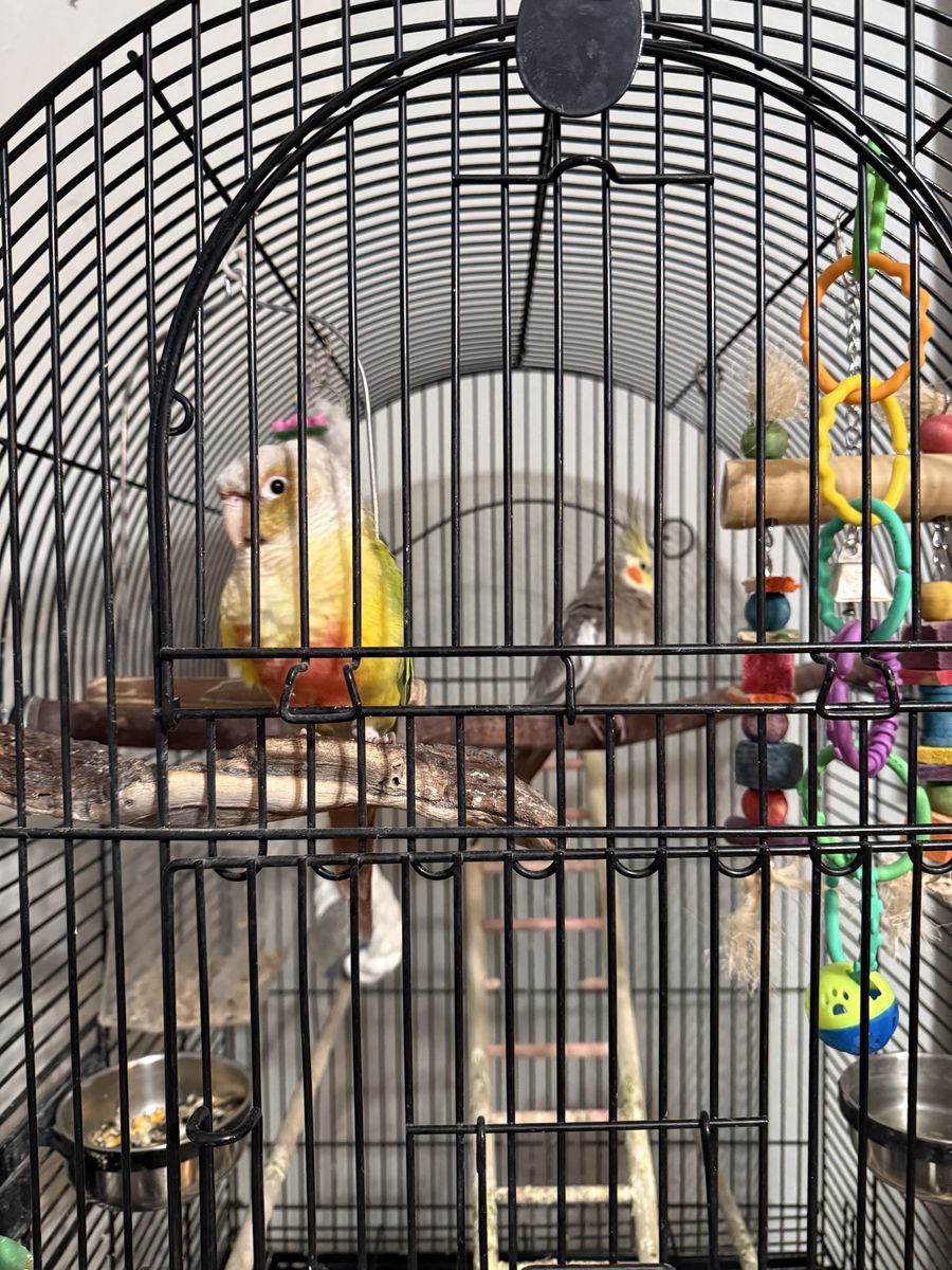 Rehoming a pineapple conure and a cockatiel. Ages are unknown. They haven’t been handled a ton, so they’re a bit shy at first, but with patience, time, and a few treats, they will warm up and make great companions.