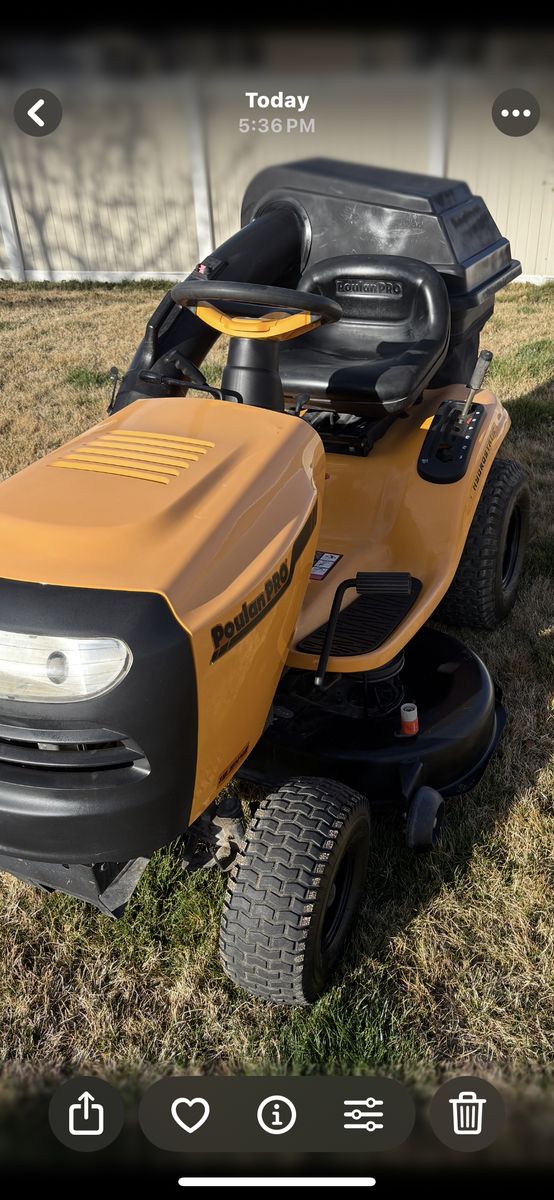 Excellent condition 42 inch deck 19.5 hp runs great Has double grass catcher Hydrostatic transmission All tires are good ready to use