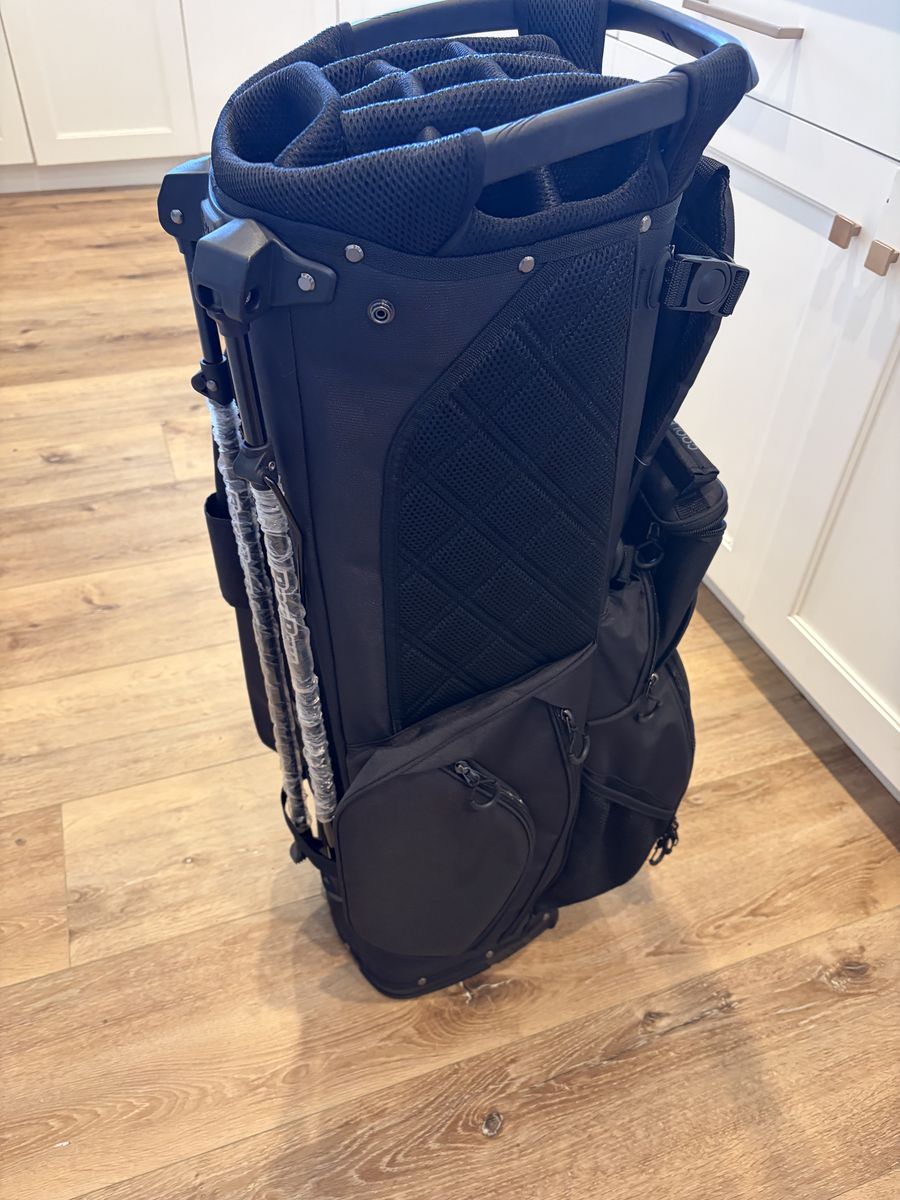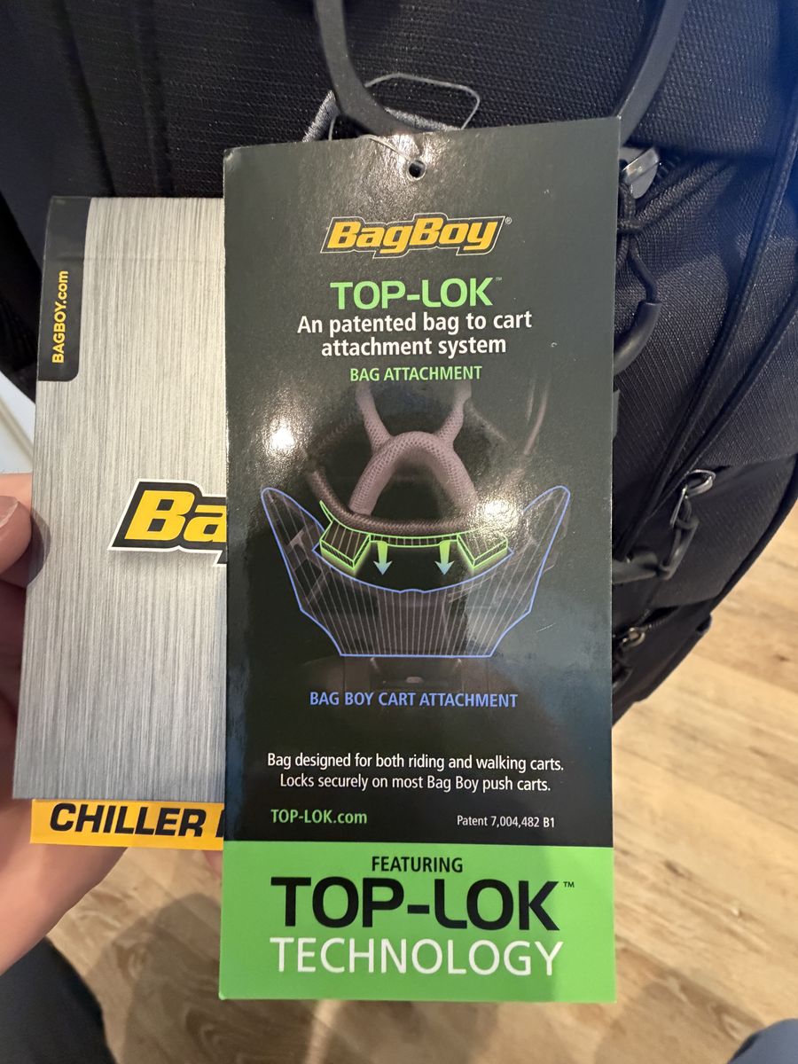 Removable cooler bag holds four 12-ounce cans High performance flex-base stand mechanism 15-way organizer top Full-length individual dividers via the Individual Divider System (IDS) Top-Lok® bag-to-cart attachment system Removable single shoulder strap on a swivel clip attachment system Cart strap pass-through 8 zippered pockets including a waterproof fleece-lined valuables pocket and two large garment pockets Rain hood included Easy grip zipper pulls