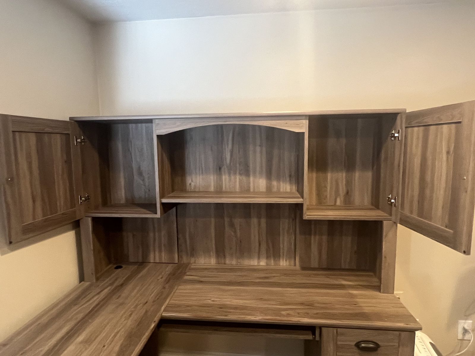 VenmoThis desk fits in a corner, it is square not an L shape. It has a cabinet with a door on one end (shelves inside) and on the other end is 3 drawers (the bottom one holds all your files). It has a very nice hutch that sits on top that has 2 more cabinets with doors as well as a large shelf for holding tons of things. It comes in 3 pieces that all fit together. Hardware included. This desk has it all and tons of storage space. Clean drawers and "like new" condition.