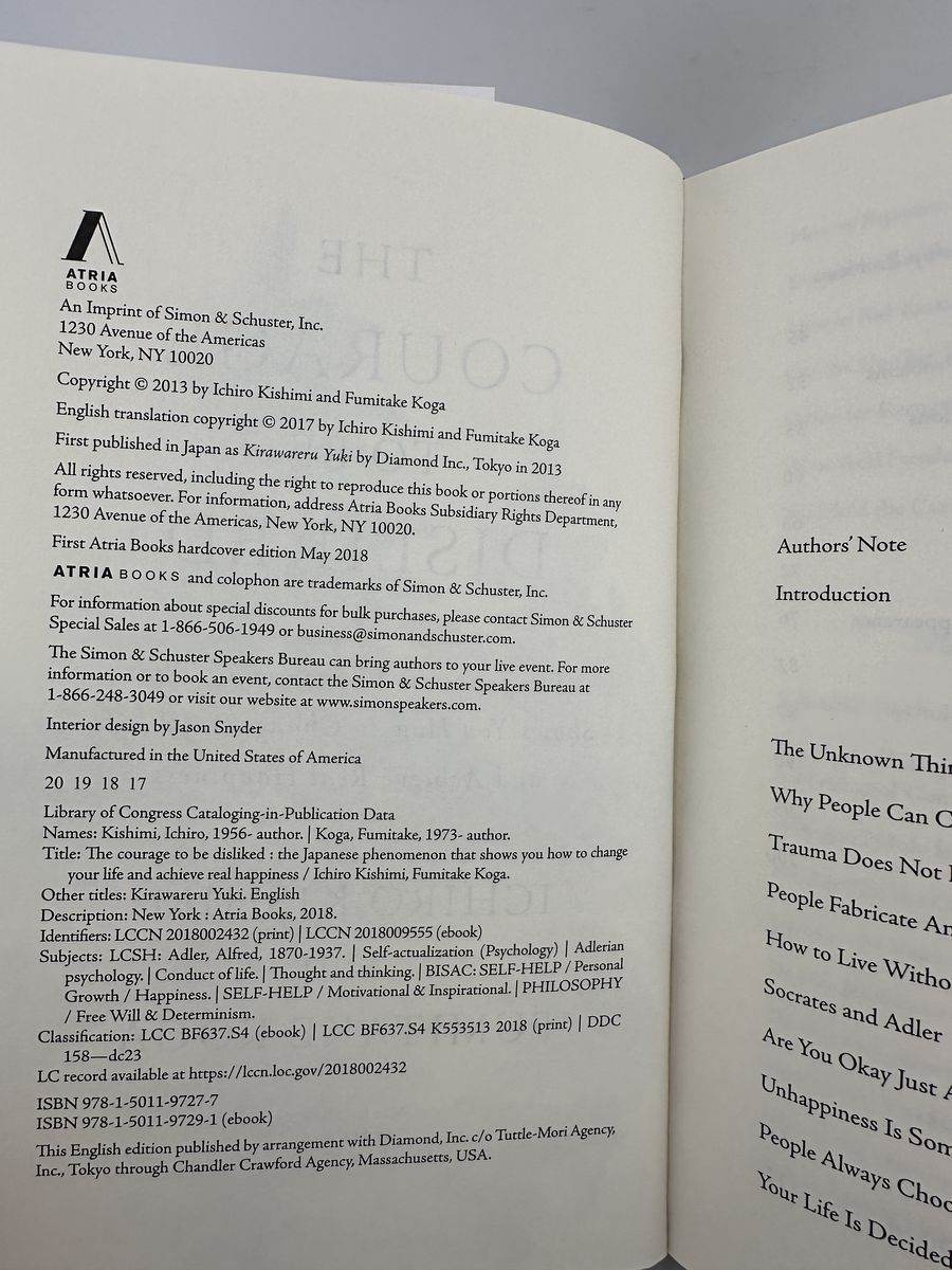 Book Details: • Title: The Courage to Be Disliked • Authors: Ichiro Kishimi & Fumitake Koga • Publisher: Atria Books • Publication Year: 2018 • Format: Paperback • ISBN: 9781501197277