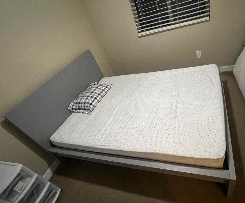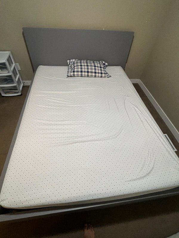 PayPalComfortable gray platform bed frame with a white mattress, both in great condition and very well maintained. Perfect for anyone looking for a sturdy and stylish bed setup. Dimensions: • Length: 82 inches (6.8 ft) • Width: 65 inches (5.4 ft) The bed frame is strong and modern, and the mattress is clean and comfortable.