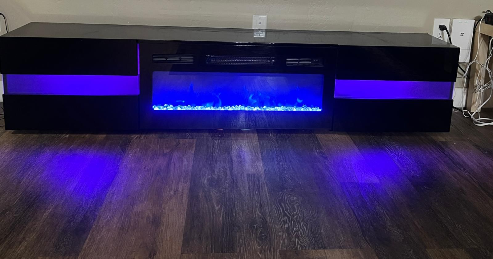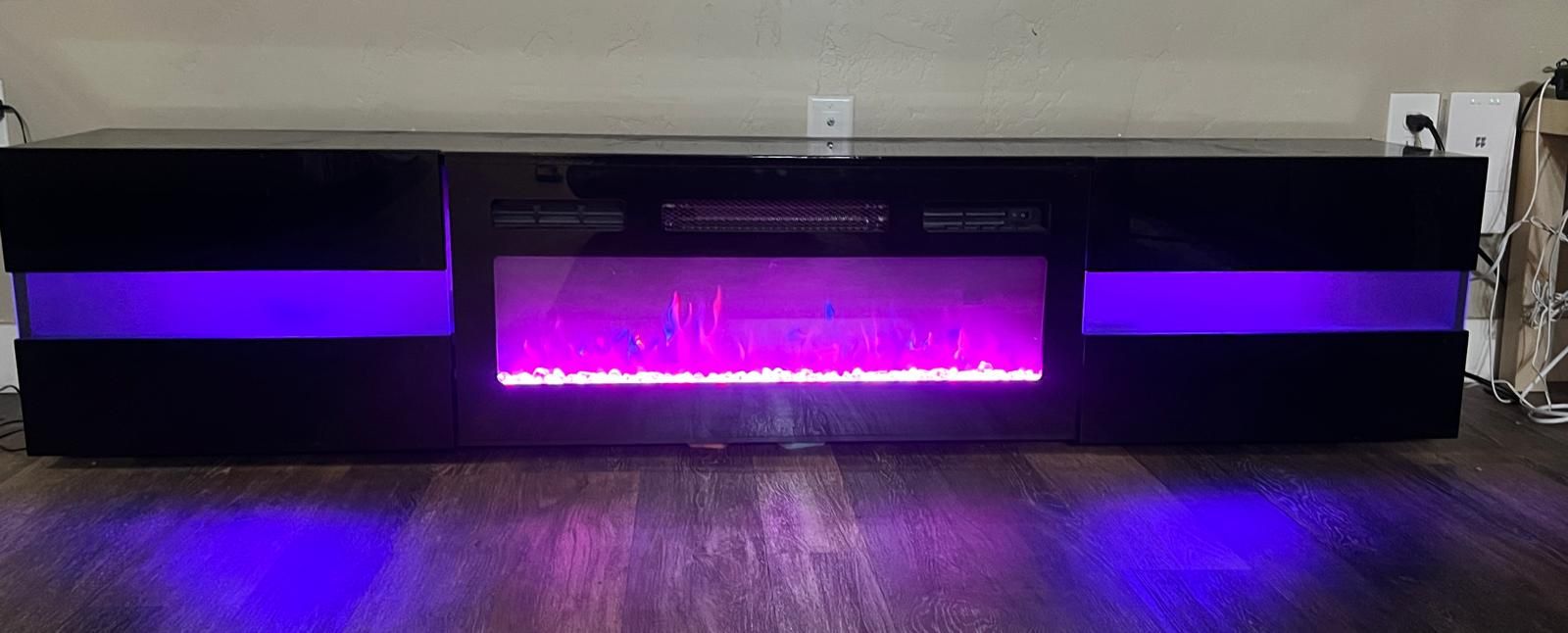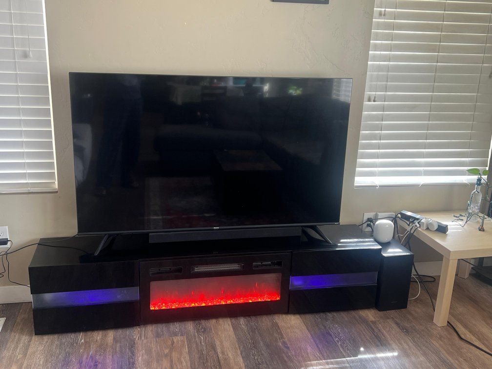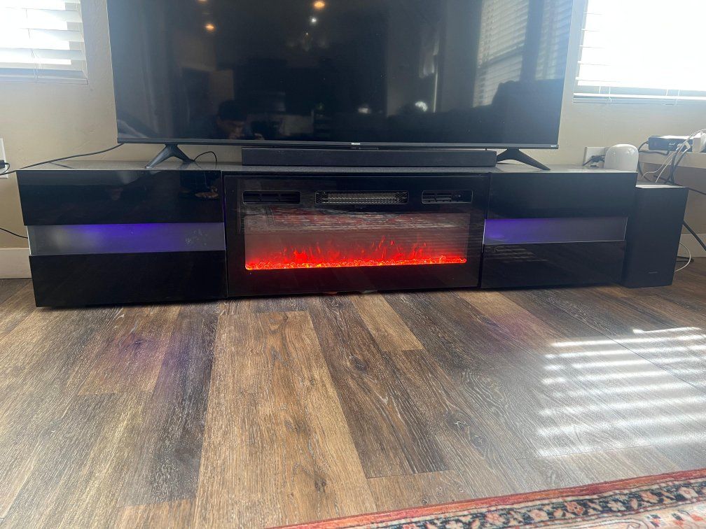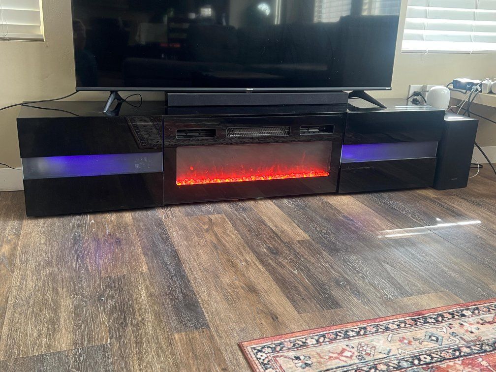 GooglePayModern black TV stand with built-in electric fireplace in excellent condition. • Sleek contemporary design • LED fireplace with adjustable flame settings • Optional heat function • Fits large TVs (approx. 65–75”) • No scratches or damage Works perfectly. Selling quickly due to move out. Message if interested.