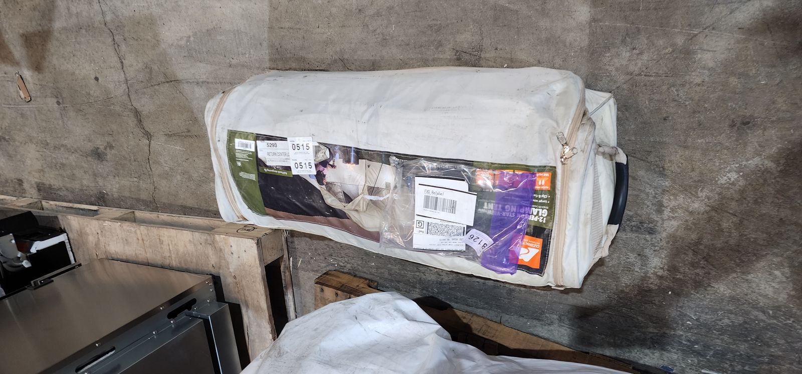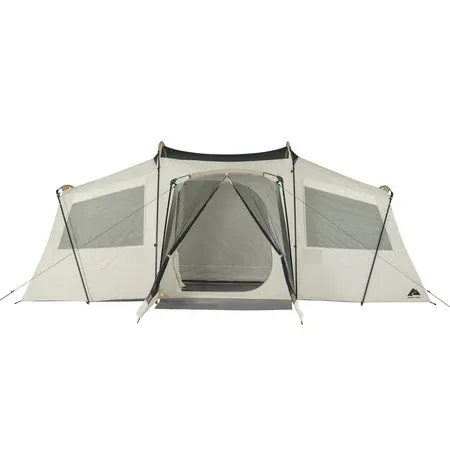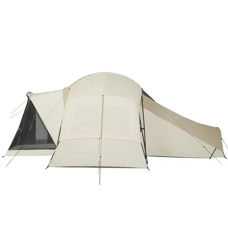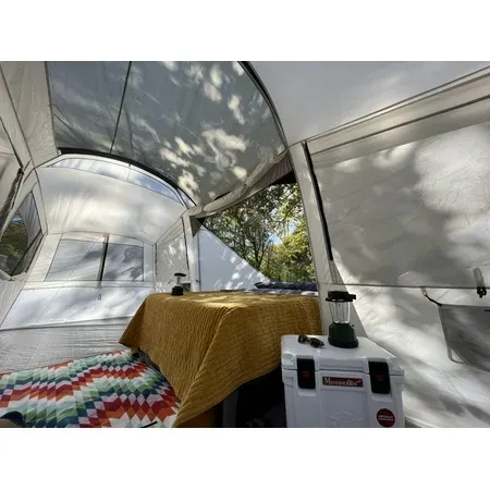 Spacious Glamping Tent for relaxing with family and friends Sleeps: 12 Large rear room with roll-back fly Large screen room sitting area 100 percent polyester with fiberglass frame. Chain corded free-standing frame system for easy set-up 6 windows and mesh roof for excellent ventilation Hanging shelves for storage Wheeled duffle carry bag.