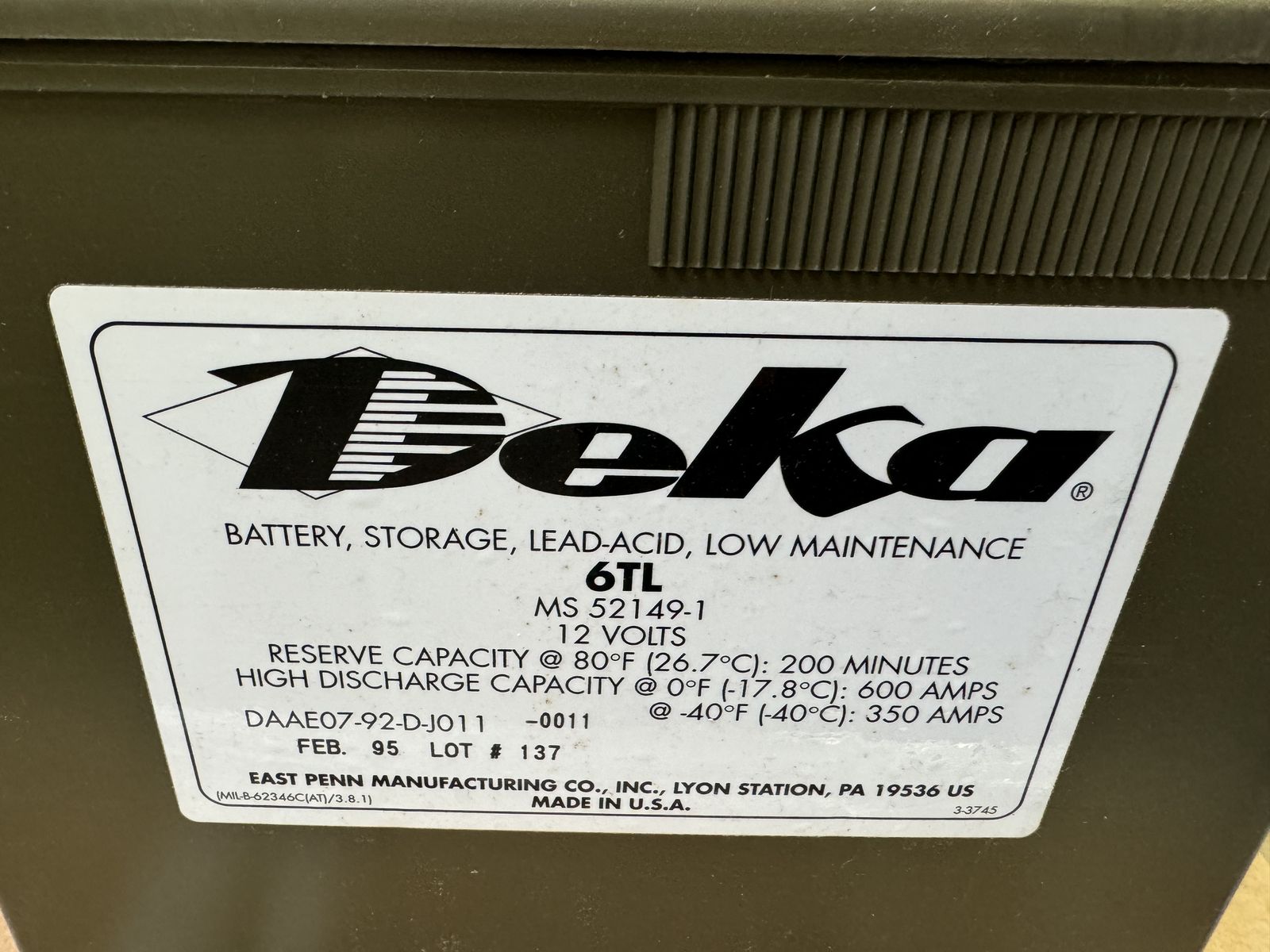 PayPalHard-to-find Deka 6TL military 12V batteries for sale. These are heavy-duty MS52149-1 battery made by East Penn Manufacturing / Deka, known for durable commercial and military-grade batteries.