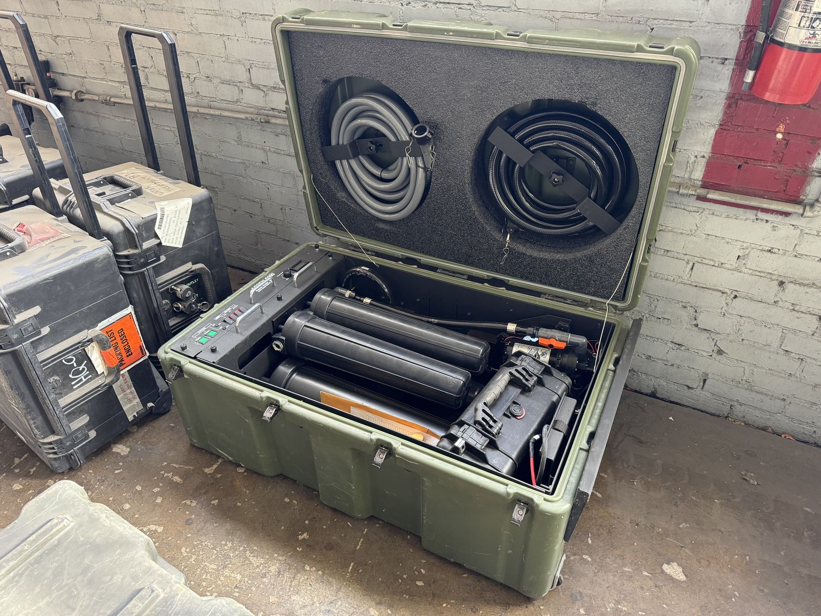 Heavy-duty portable military-style water purification system in a rugged protective case. Includes the main unit, internal components, and hoses shown in the photos.