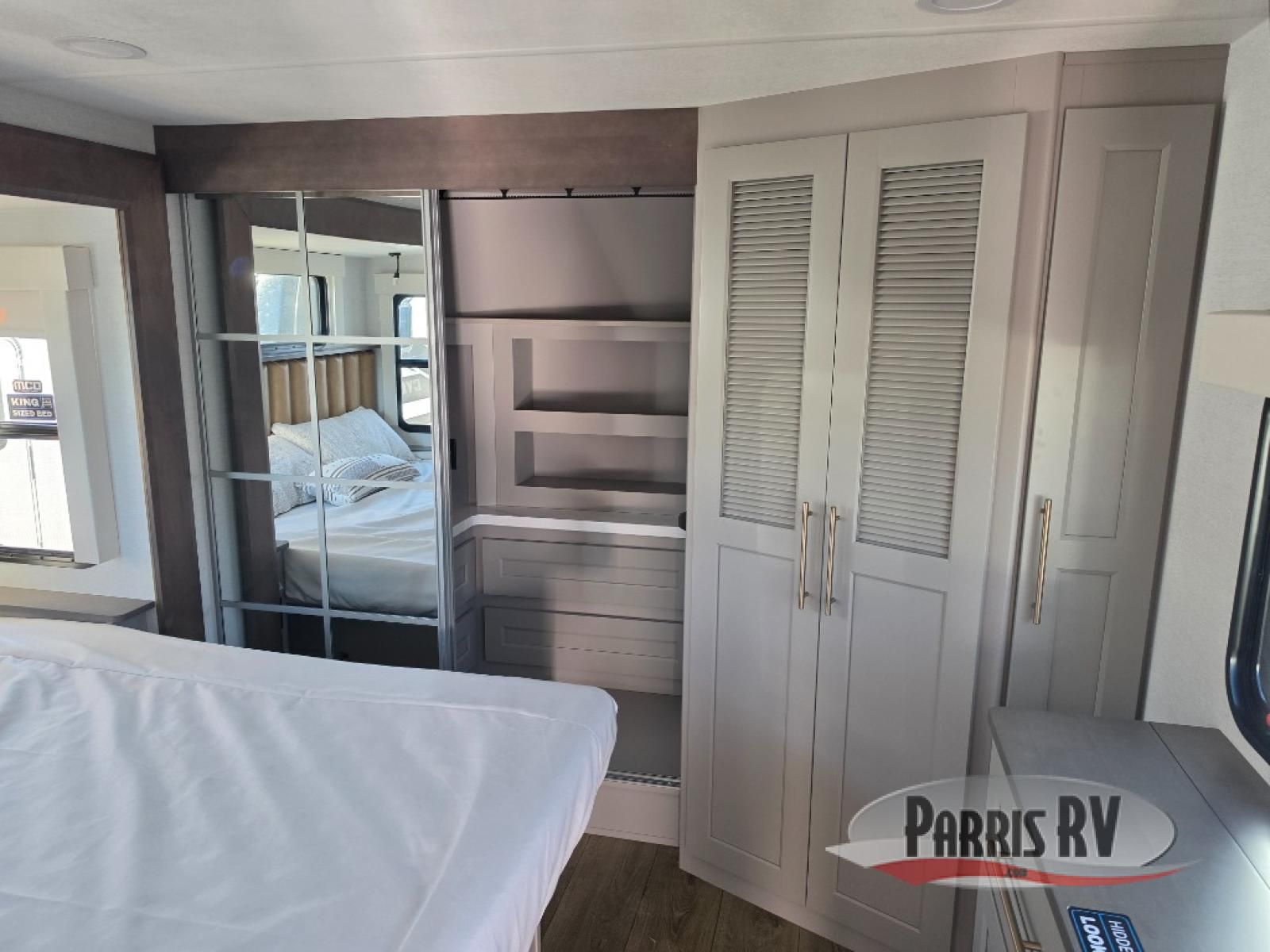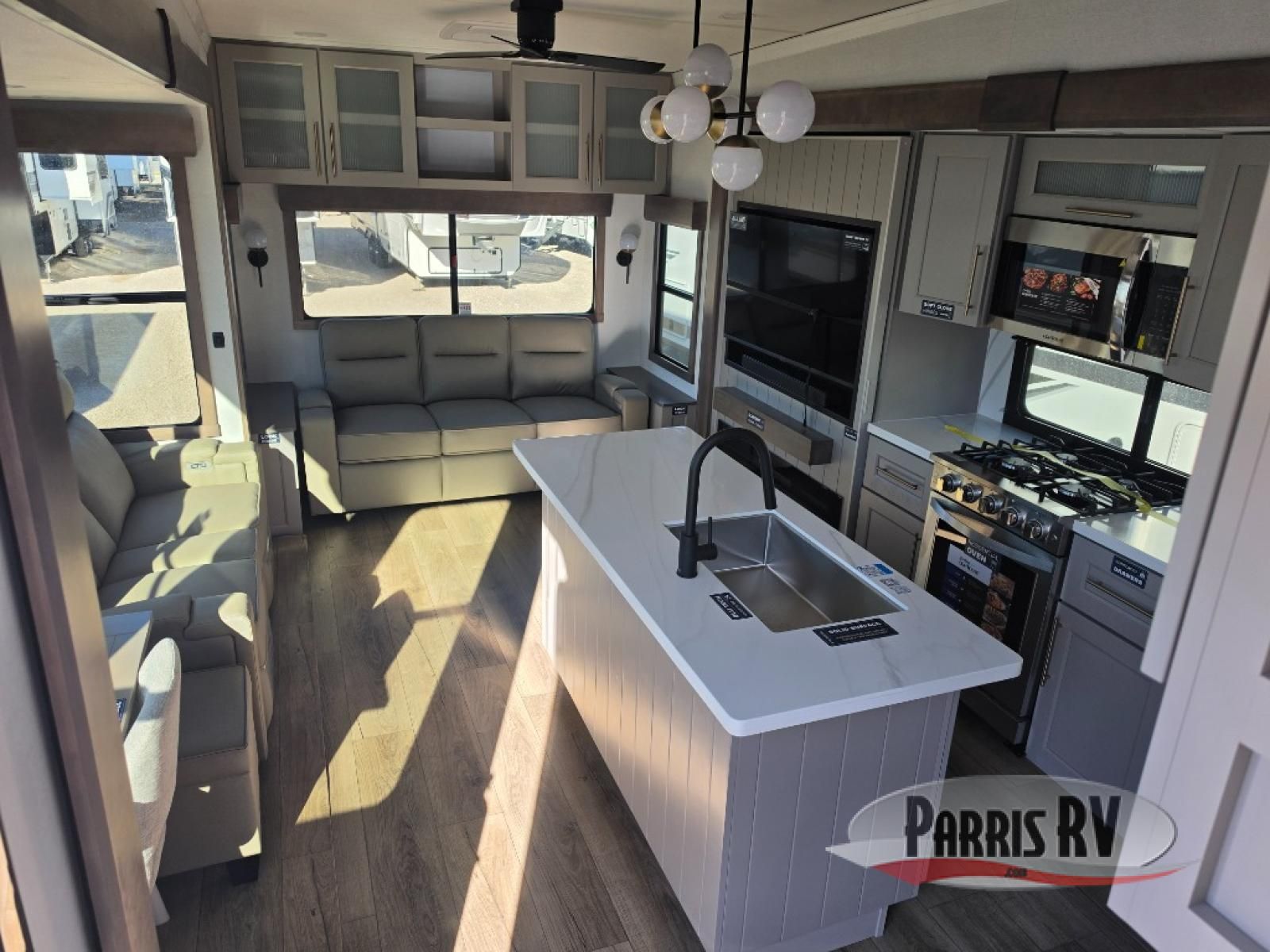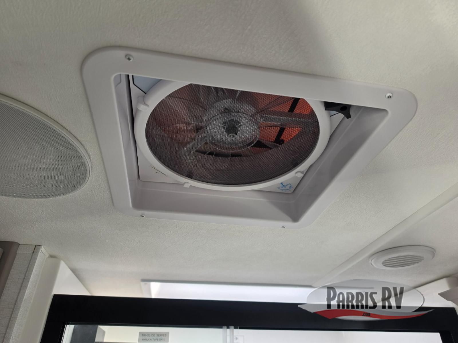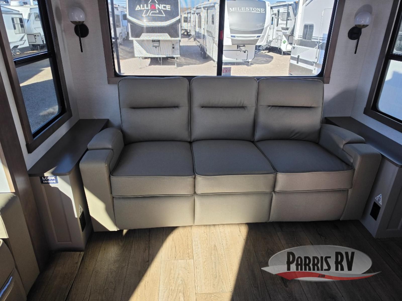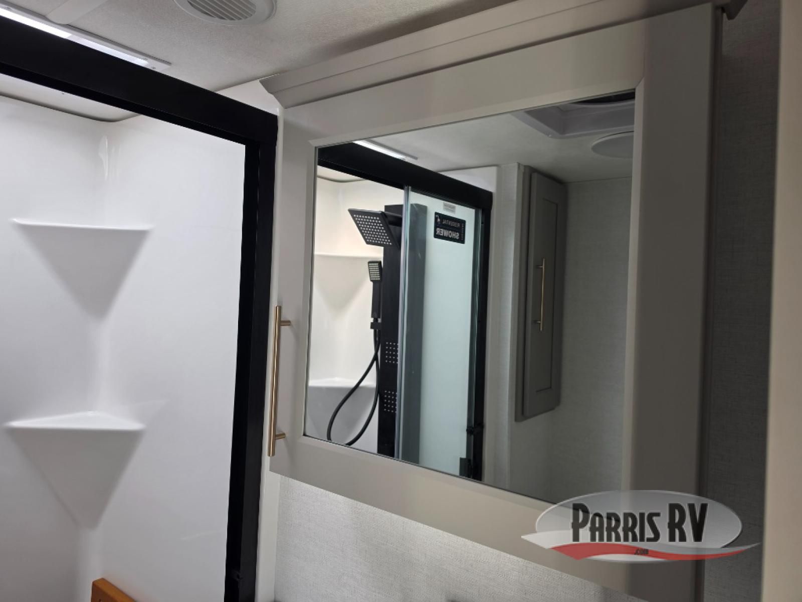 Search for the best views, the nicest RV park, or a place you haven't seen for years with this Paradigm in tow! There is a king bed slide in the master bedroom, a Smart TV, and a dresser with flip-up hidden storage for your belongings. The full bathroom offers a large residential shower, a porcelain toilet with a soft close seat, and storage for your linens, while the kitchen gives you two pantries, an island with a large undermount single basin sink and dishwasher prep if you want the option for easy clean up. You will also have a residential microwave and range, plus a 3.73 cu. ft. oven to make meals. When you're ready to relax for the evening, head to the rear living area to enjoy the dual recliner love seat across from the 50" Smart TV and fireplace!