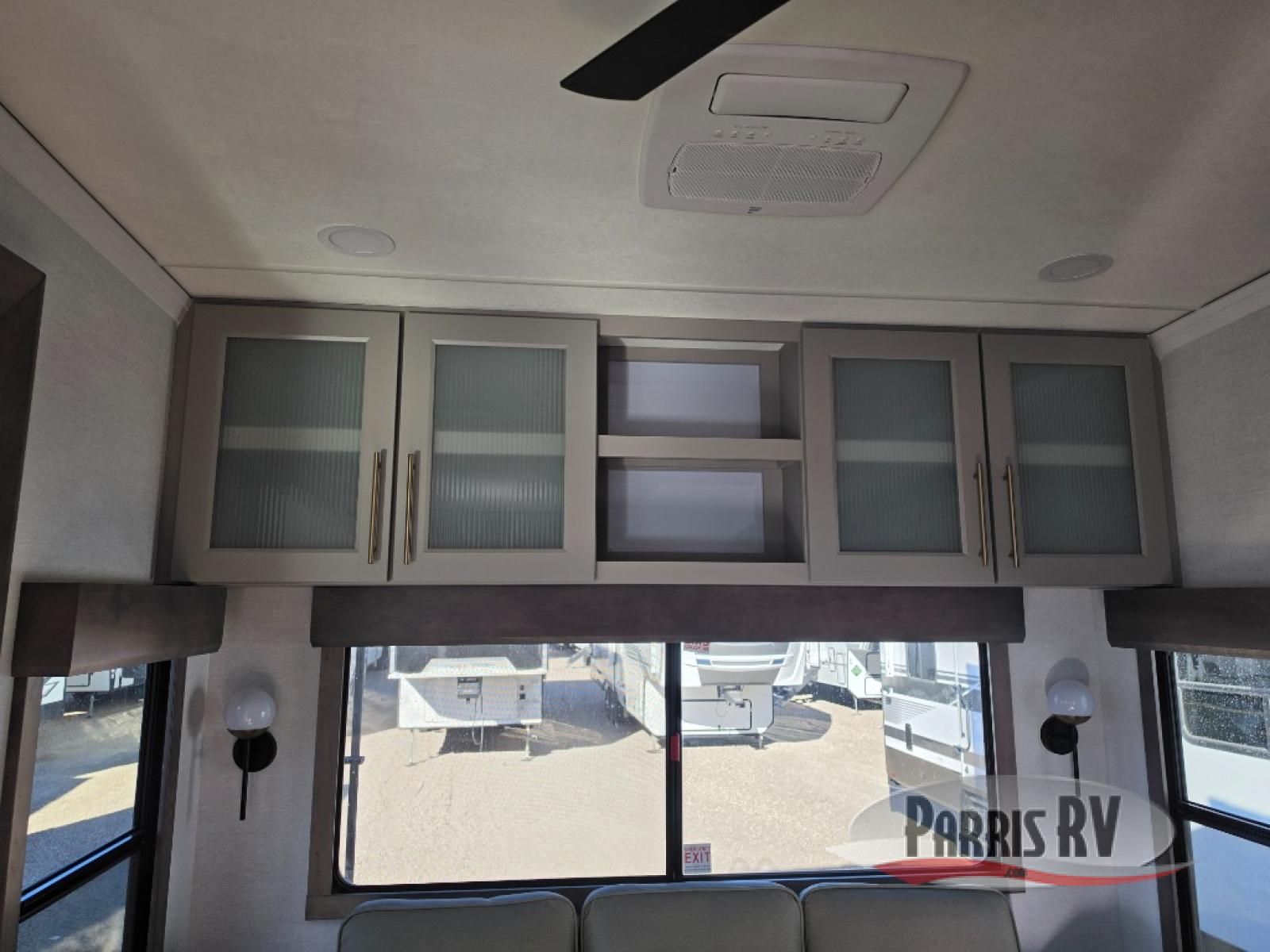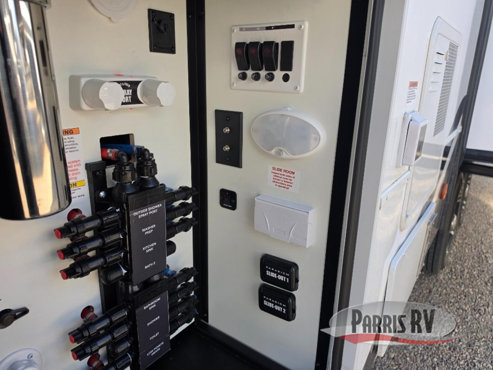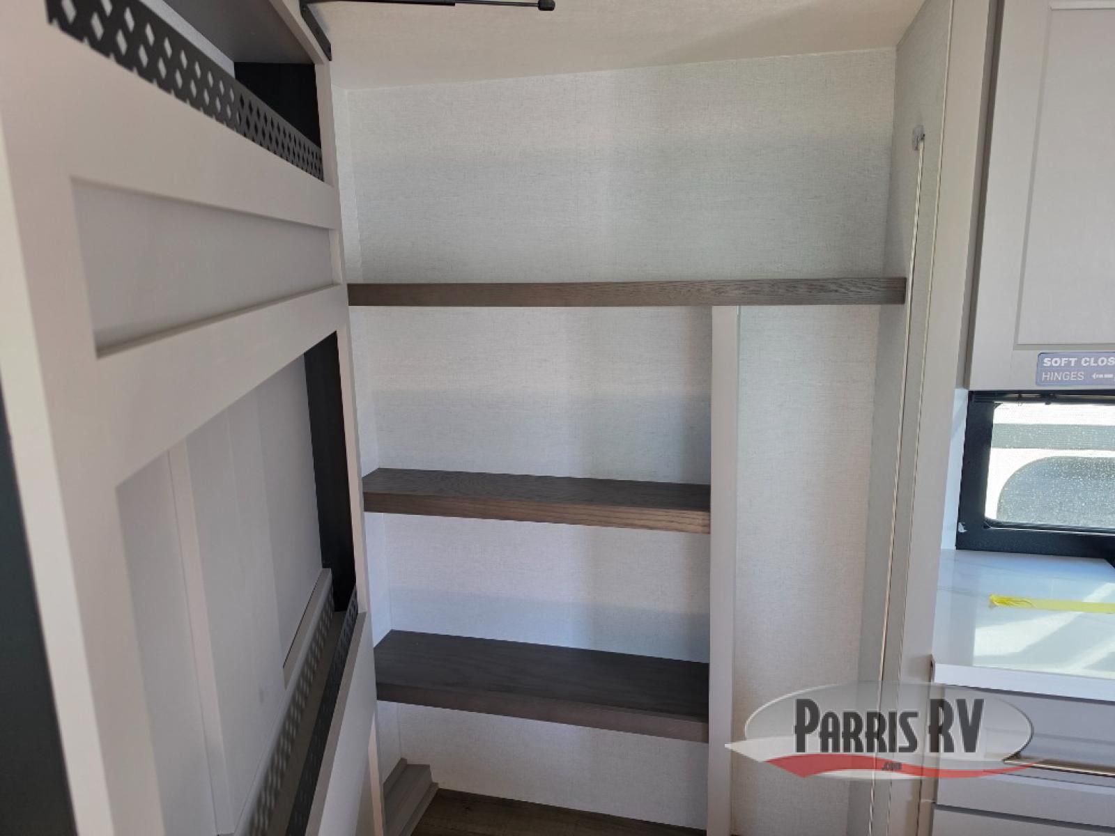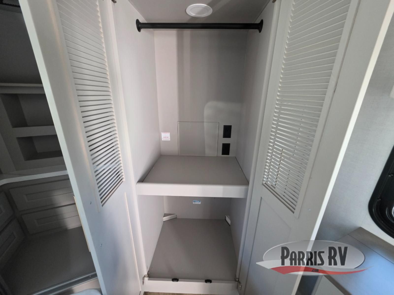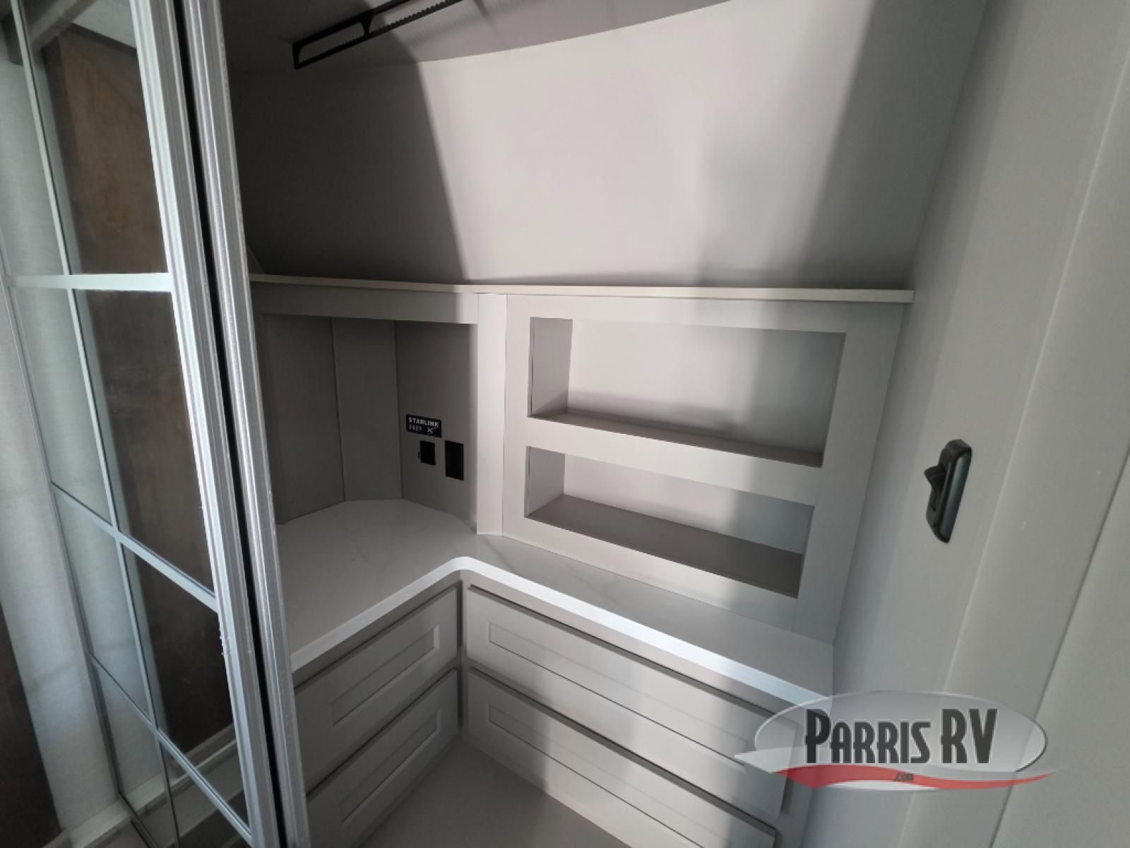 Search for the best views, the nicest RV park, or a place you haven't seen for years with this Paradigm in tow! There is a king bed slide in the master bedroom, a Smart TV, and a dresser with flip-up hidden storage for your belongings. The full bathroom offers a large residential shower, a porcelain toilet with a soft close seat, and storage for your linens, while the kitchen gives you two pantries, an island with a large undermount single basin sink and dishwasher prep if you want the option for easy clean up. You will also have a residential microwave and range, plus a 3.73 cu. ft. oven to make meals. When you're ready to relax for the evening, head to the rear living area to enjoy the dual recliner love seat across from the 50" Smart TV and fireplace!