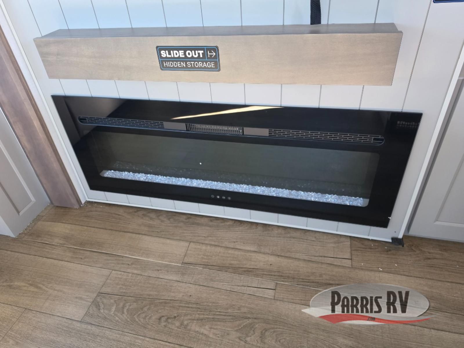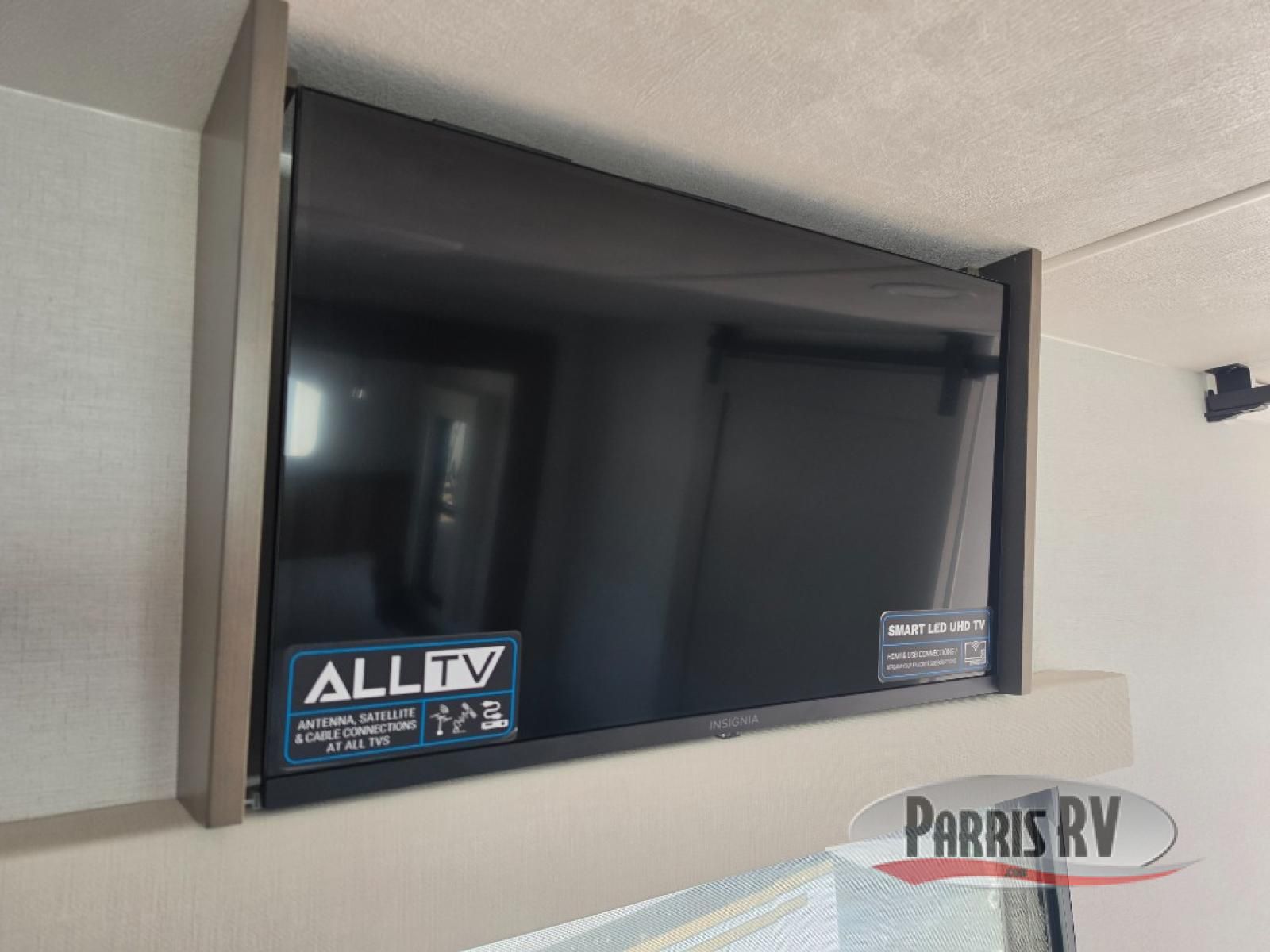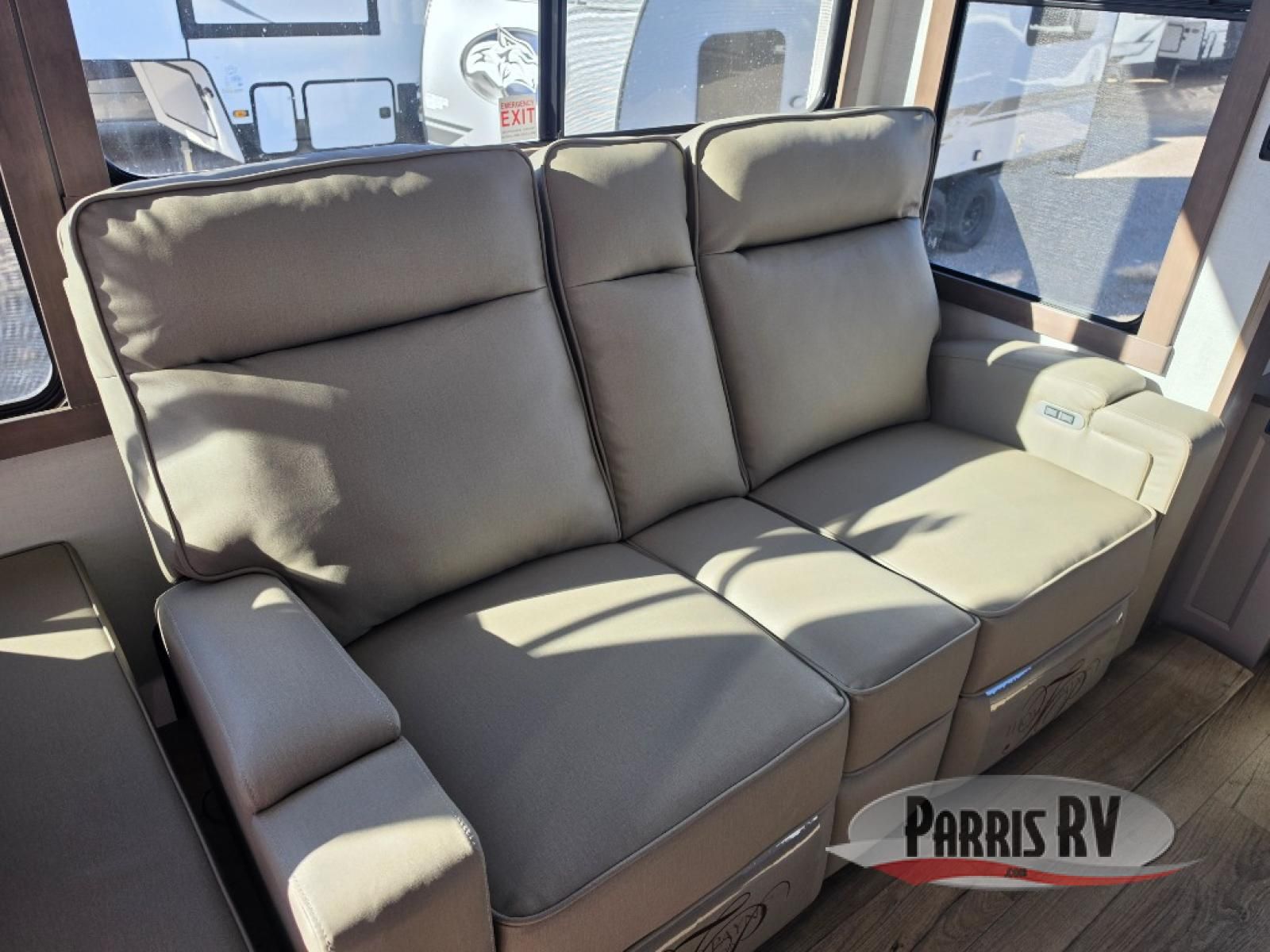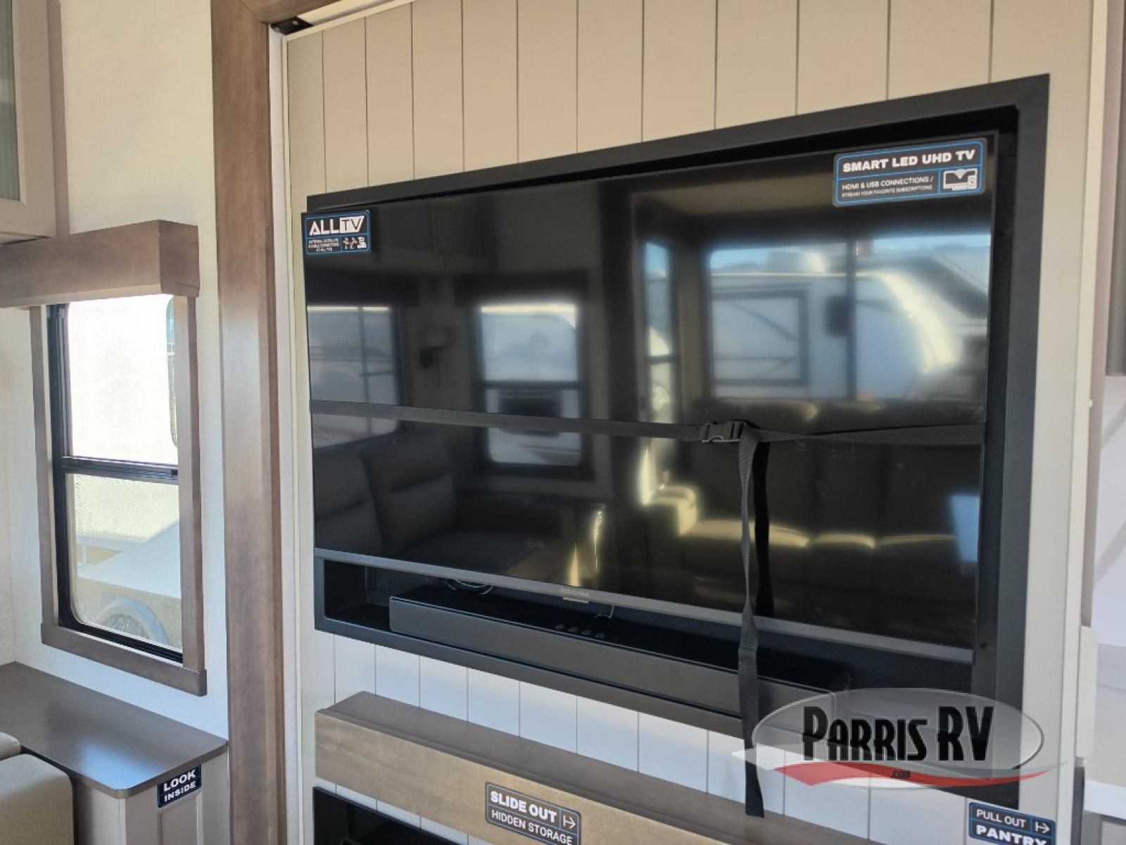 Search for the best views, the nicest RV park, or a place you haven't seen for years with this Paradigm in tow! There is a king bed slide in the master bedroom, a Smart TV, and a dresser with flip-up hidden storage for your belongings. The full bathroom offers a large residential shower, a porcelain toilet with a soft close seat, and storage for your linens, while the kitchen gives you two pantries, an island with a large undermount single basin sink and dishwasher prep if you want the option for easy clean up. You will also have a residential microwave and range, plus a 3.73 cu. ft. oven to make meals. When you're ready to relax for the evening, head to the rear living area to enjoy the dual recliner love seat across from the 50" Smart TV and fireplace!