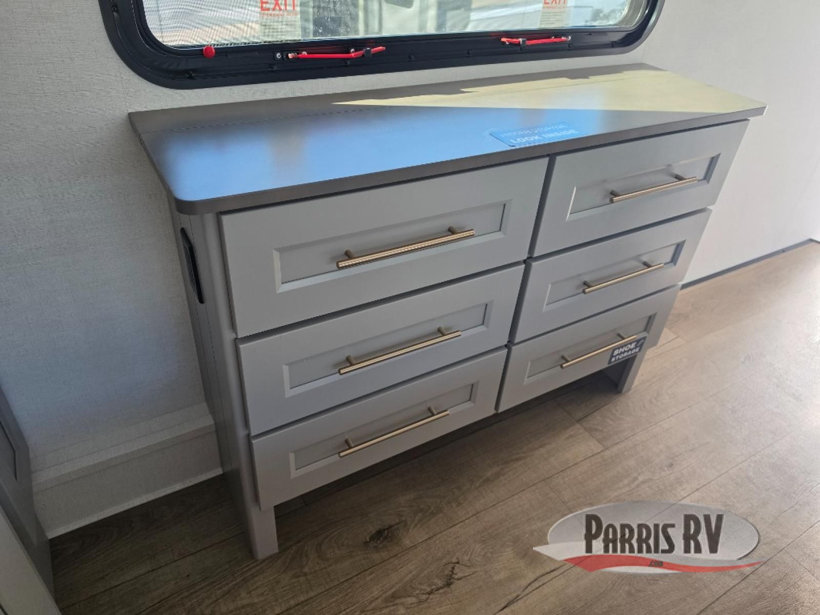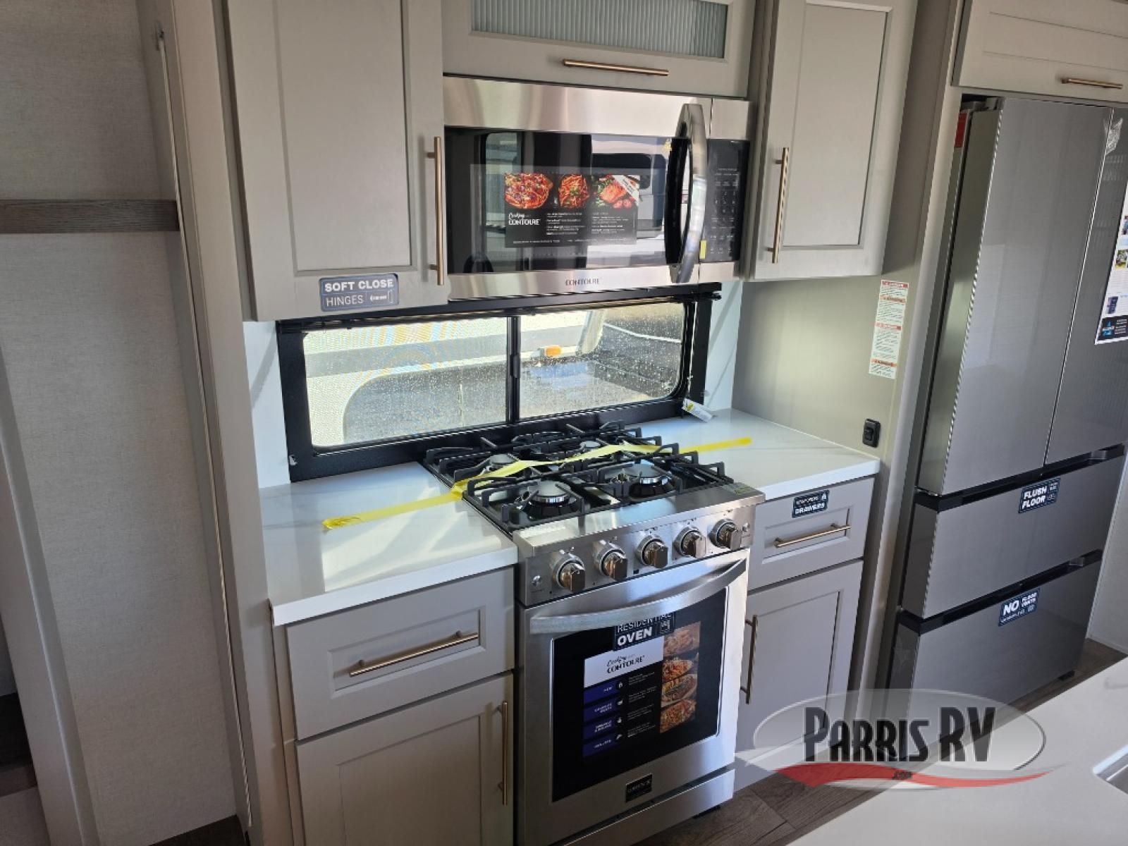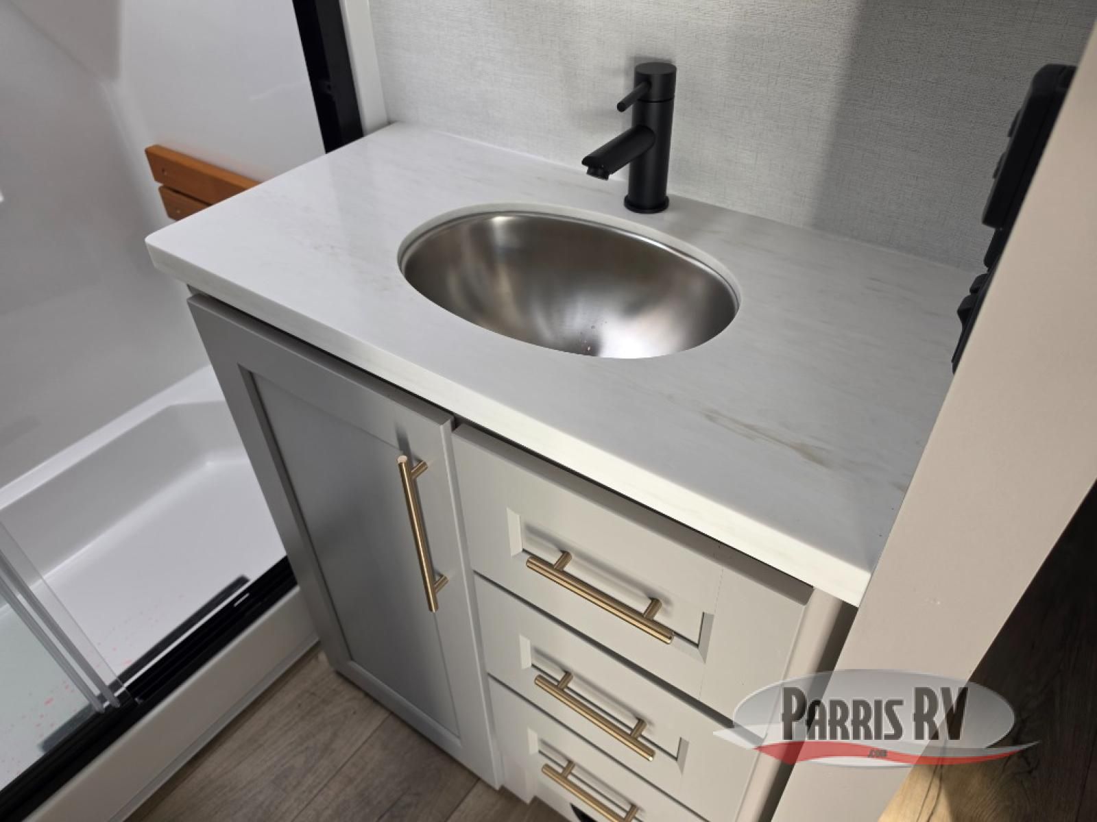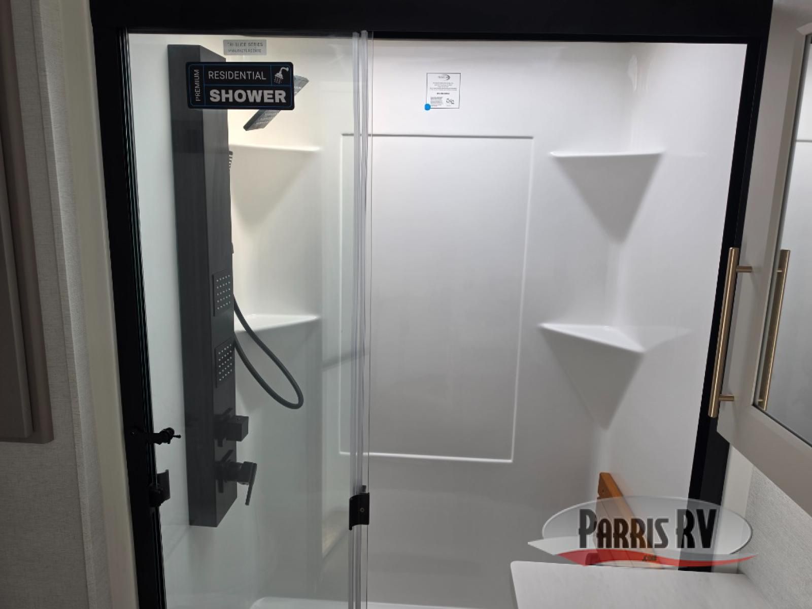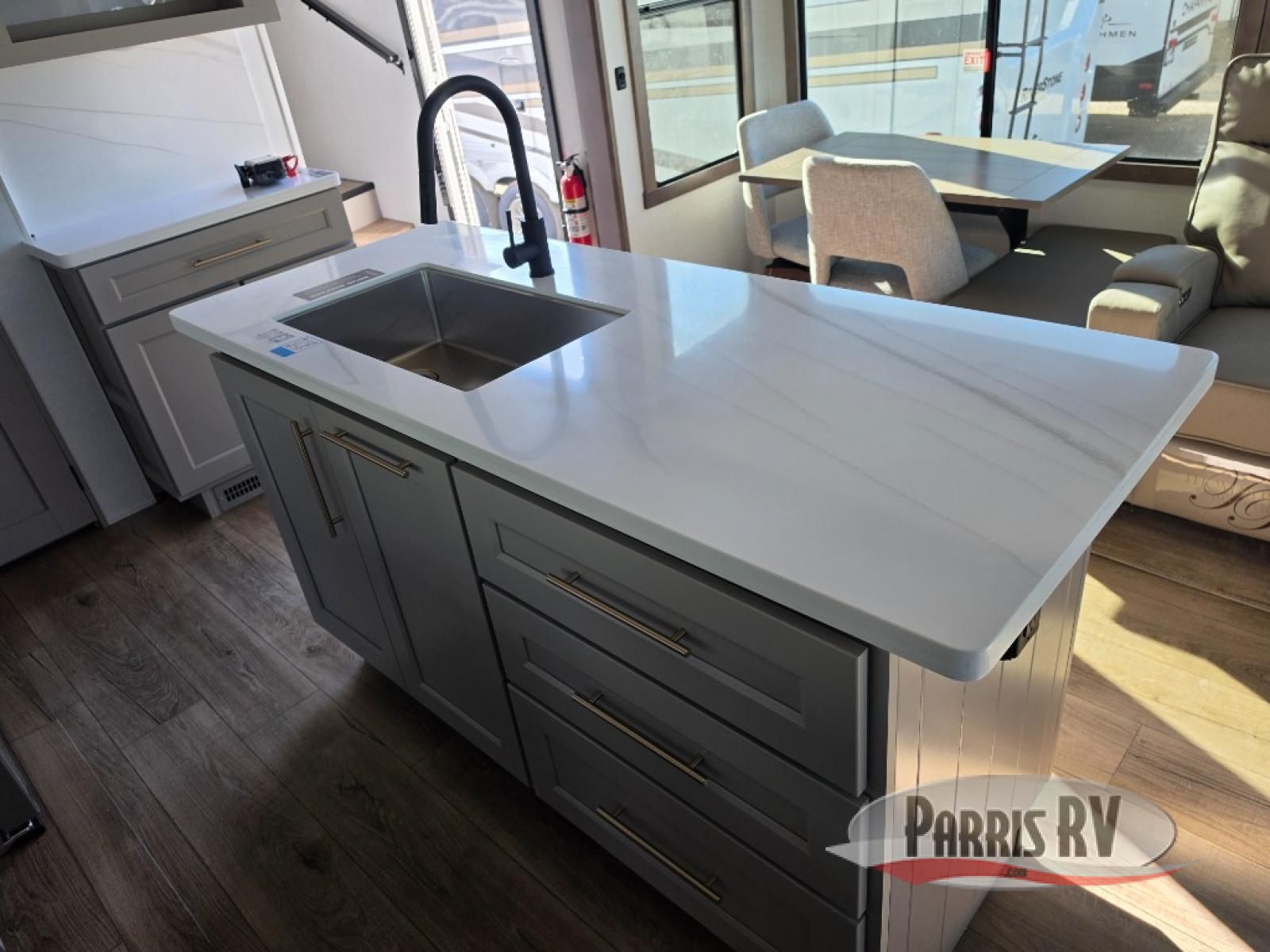 Search for the best views, the nicest RV park, or a place you haven't seen for years with this Paradigm in tow! There is a king bed slide in the master bedroom, a Smart TV, and a dresser with flip-up hidden storage for your belongings. The full bathroom offers a large residential shower, a porcelain toilet with a soft close seat, and storage for your linens, while the kitchen gives you two pantries, an island with a large undermount single basin sink and dishwasher prep if you want the option for easy clean up. You will also have a residential microwave and range, plus a 3.73 cu. ft. oven to make meals. When you're ready to relax for the evening, head to the rear living area to enjoy the dual recliner love seat across from the 50" Smart TV and fireplace!