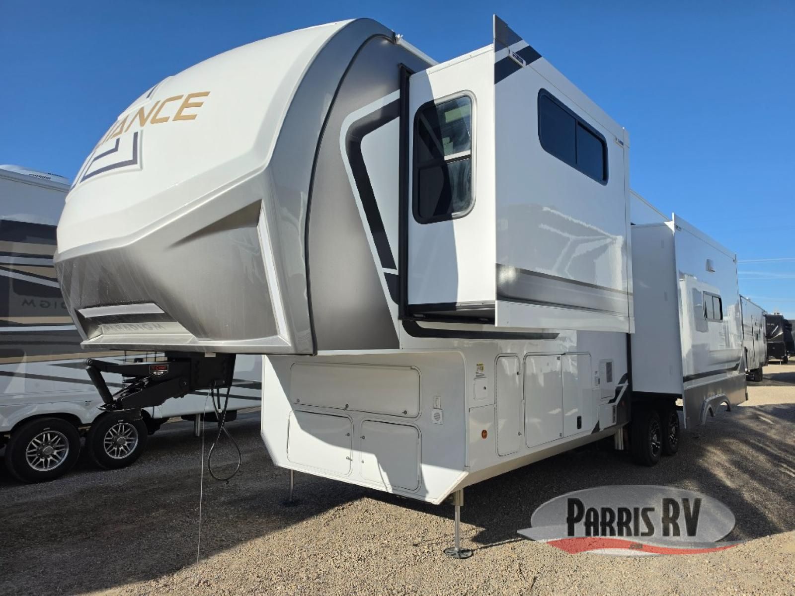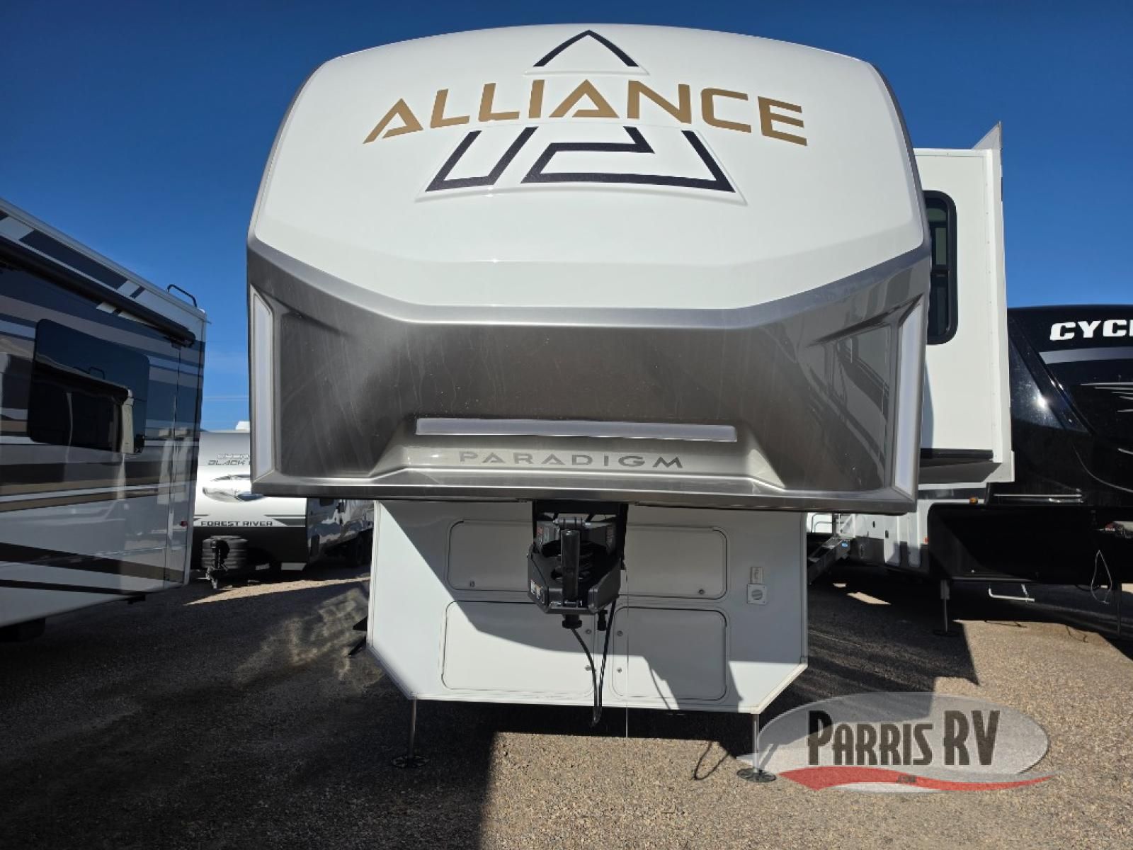 The Paradigm fifth wheels by Alliance RV are functional, high-quality, and luxurious for an unforgettable camping experience. There are three A/C units and a 40K BTU furnace to keep you comfortable year around, and you'll appreciate additional convenient amenities, like the all-in-one enclosed/heated utility center and the color coded and numbered wiring. A Helux Series coil spring pin box comes standard for hassle-free towing, along with Curt 8,000 lb. axles. You'll love the kitchen with its LG solid surface countertops and Lusso range, plus there is LED motion lighting in the pantry and a Maxx fan with a rain sensor to keep everything fresh when making dinner. Each model also includes an HD Smart TV in the living room and bedroom. And of course there are a variety of options you can choose from to further customize your fifth wheel; dual pane windows, Super Solar Plus, slide out awning toppers, and generator prep or a generator to name a few!