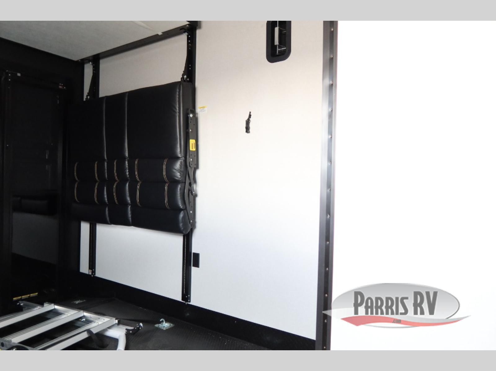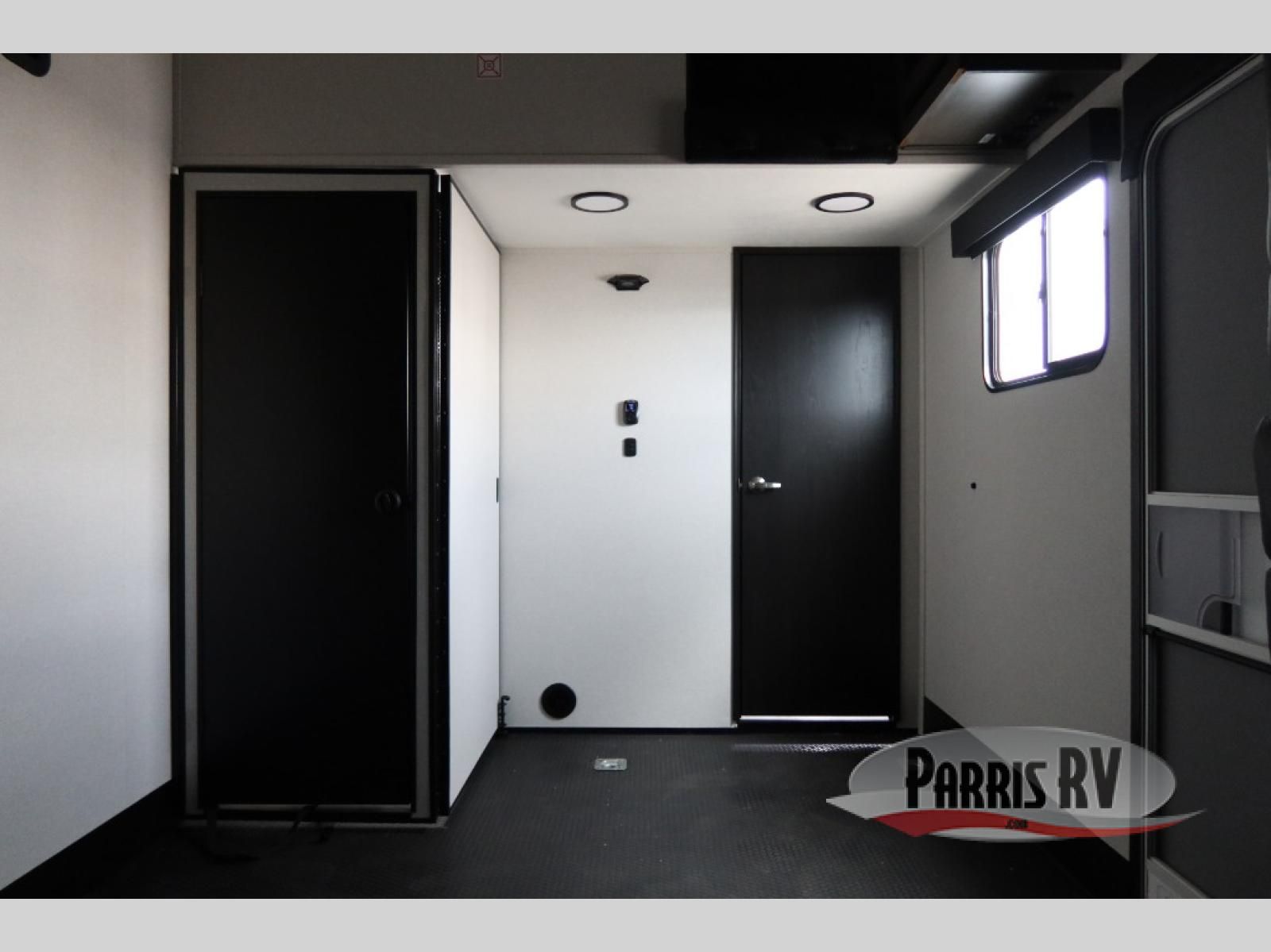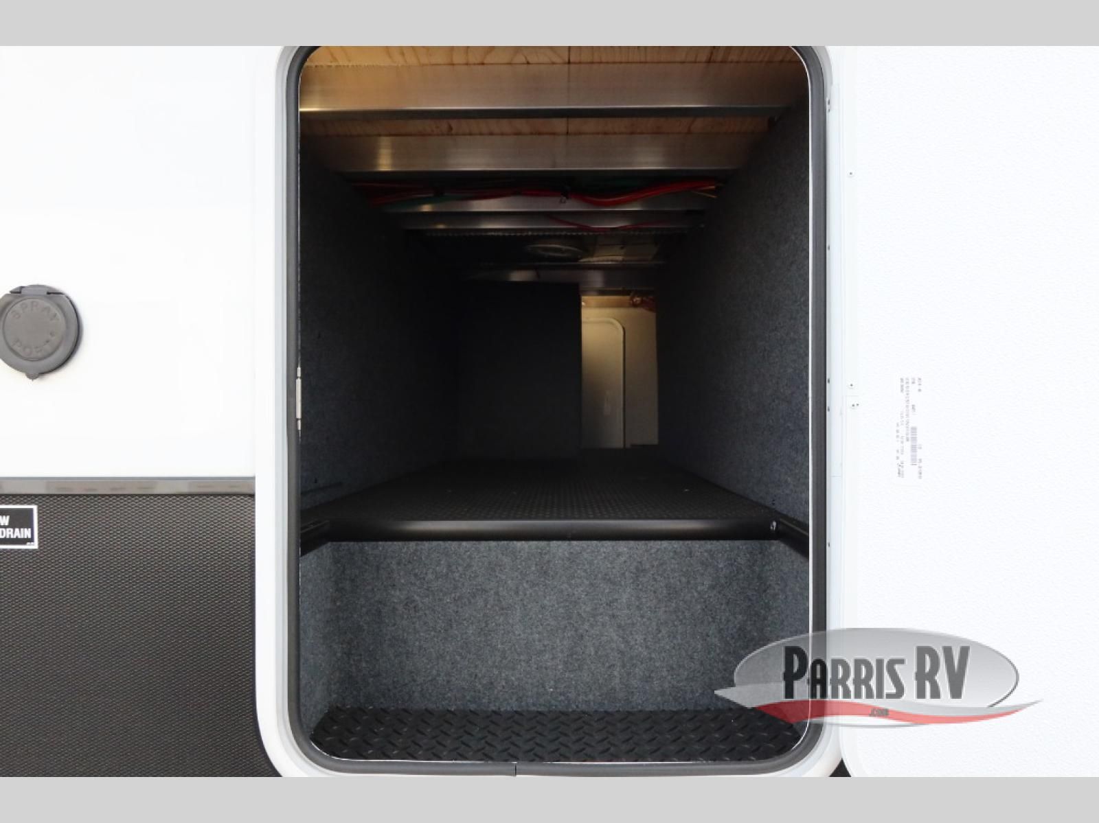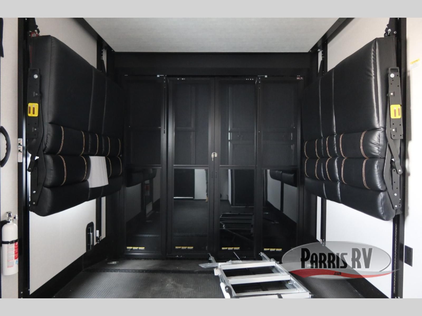 The 13' 6" garage is the perfect space for your toys, with enough room for your ATV, motorcycle, or other gear. Plus, the electric queen bed provides a comfortable spot to rest after a long day. The overhead loft with storage provides additional space for your gear, keeping it out of the way but still accessible. The kitchen is fully equipped with a microwave, sink, overhead cabinets, pantry, and coffee bar. The L-shaped sofa provides ample seating for relaxation, and the TV is perfectly positioned for viewing. The full bathroom is a welcome convenience, providing a private space to freshen up. Also, the front bedroom is a luxurious retreat, featuring a king bed, a walk-in closet, and drawers, and on the exterior, the two entry/exit doors provide easy access to the outside, making it perfect for loading and unloading your gear.