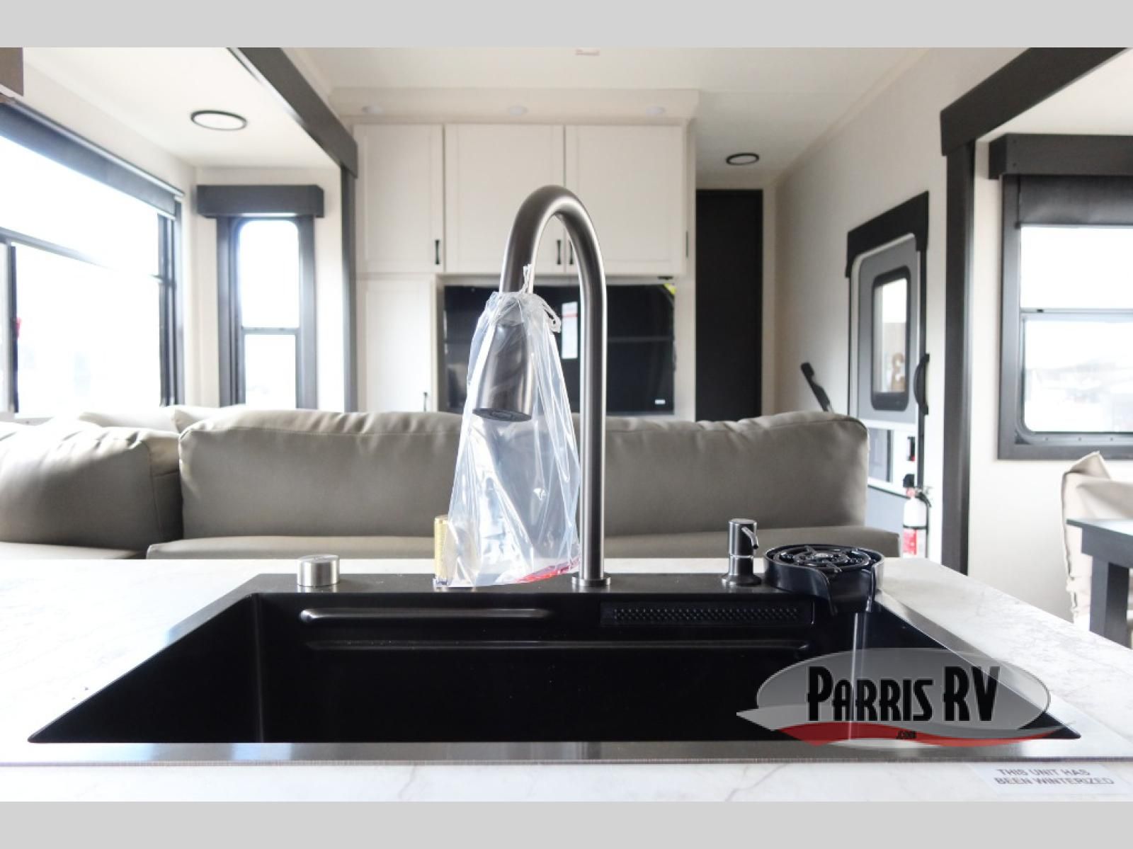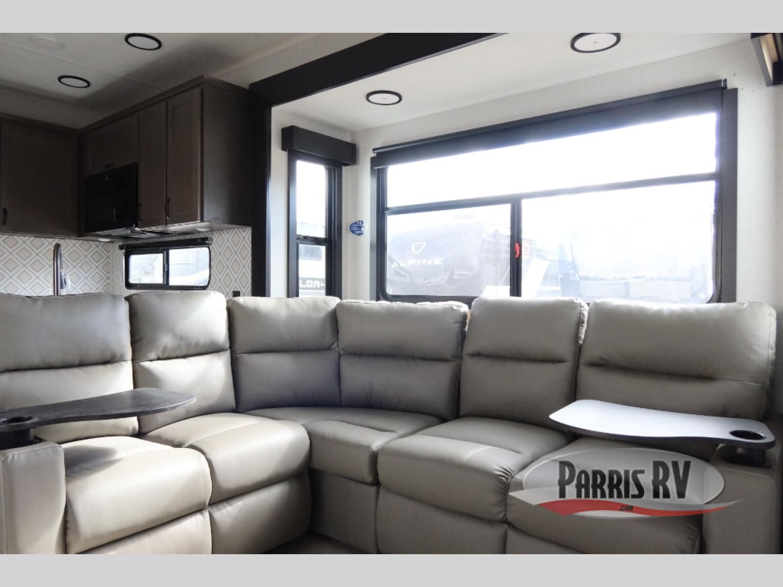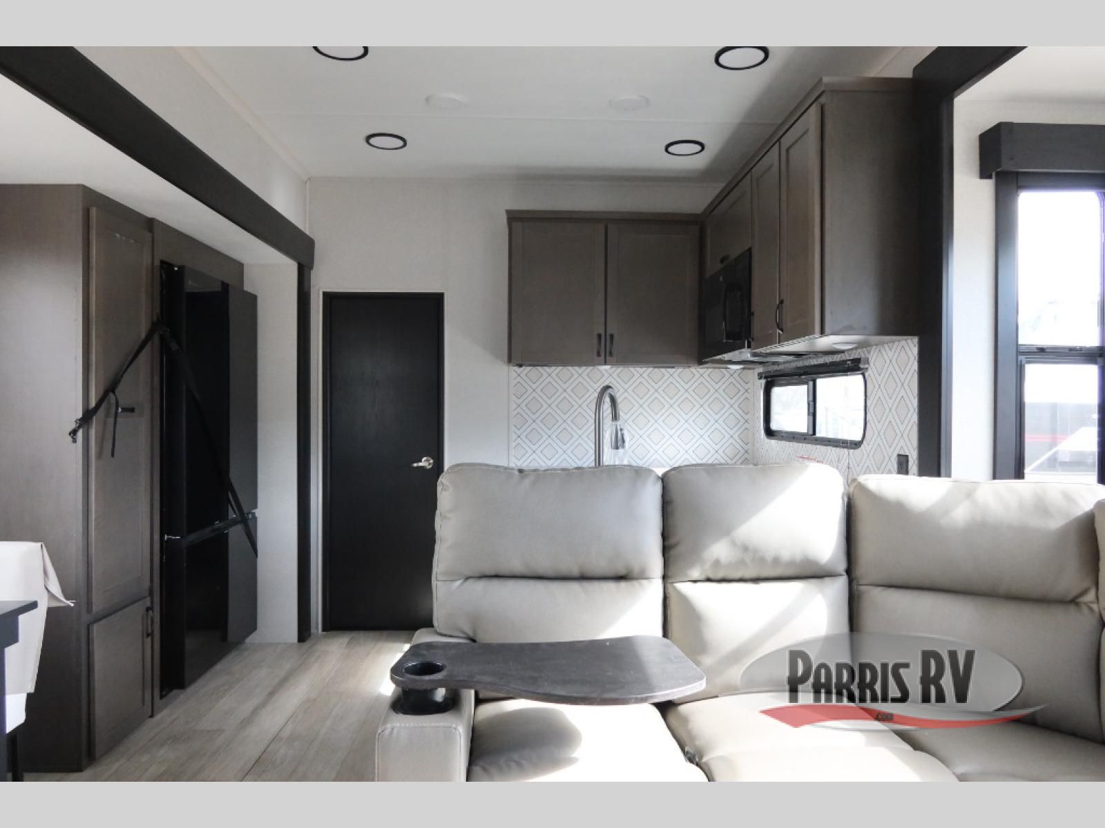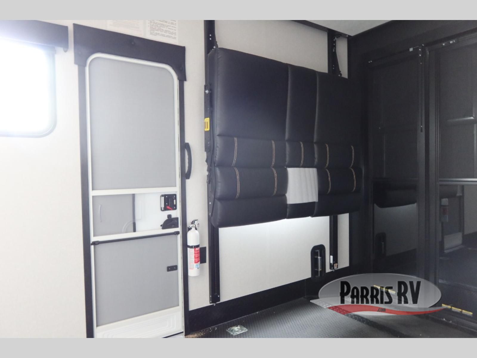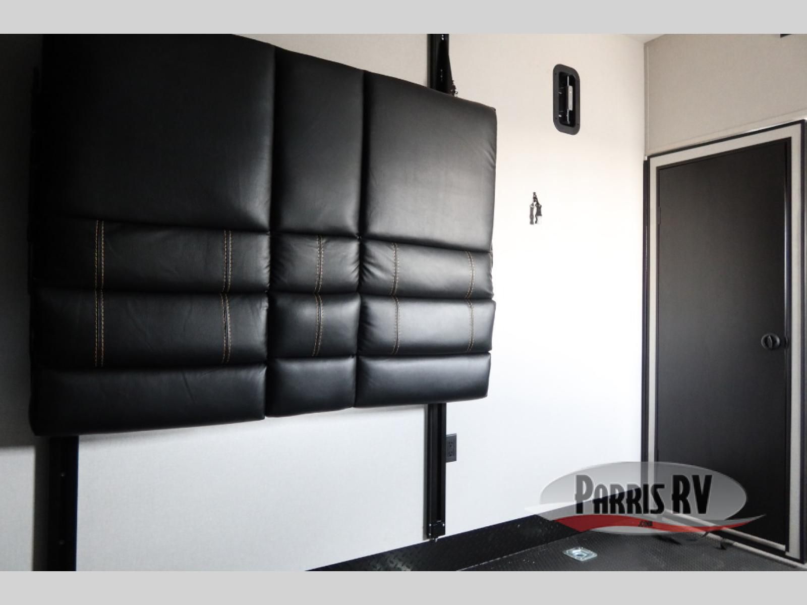 The 13' 6" garage is the perfect space for your toys, with enough room for your ATV, motorcycle, or other gear. Plus, the electric queen bed provides a comfortable spot to rest after a long day. The overhead loft with storage provides additional space for your gear, keeping it out of the way but still accessible. The kitchen is fully equipped with a microwave, sink, overhead cabinets, pantry, and coffee bar. The L-shaped sofa provides ample seating for relaxation, and the TV is perfectly positioned for viewing. The full bathroom is a welcome convenience, providing a private space to freshen up. Also, the front bedroom is a luxurious retreat, featuring a king bed, a walk-in closet, and drawers, and on the exterior, the two entry/exit doors provide easy access to the outside, making it perfect for loading and unloading your gear.
