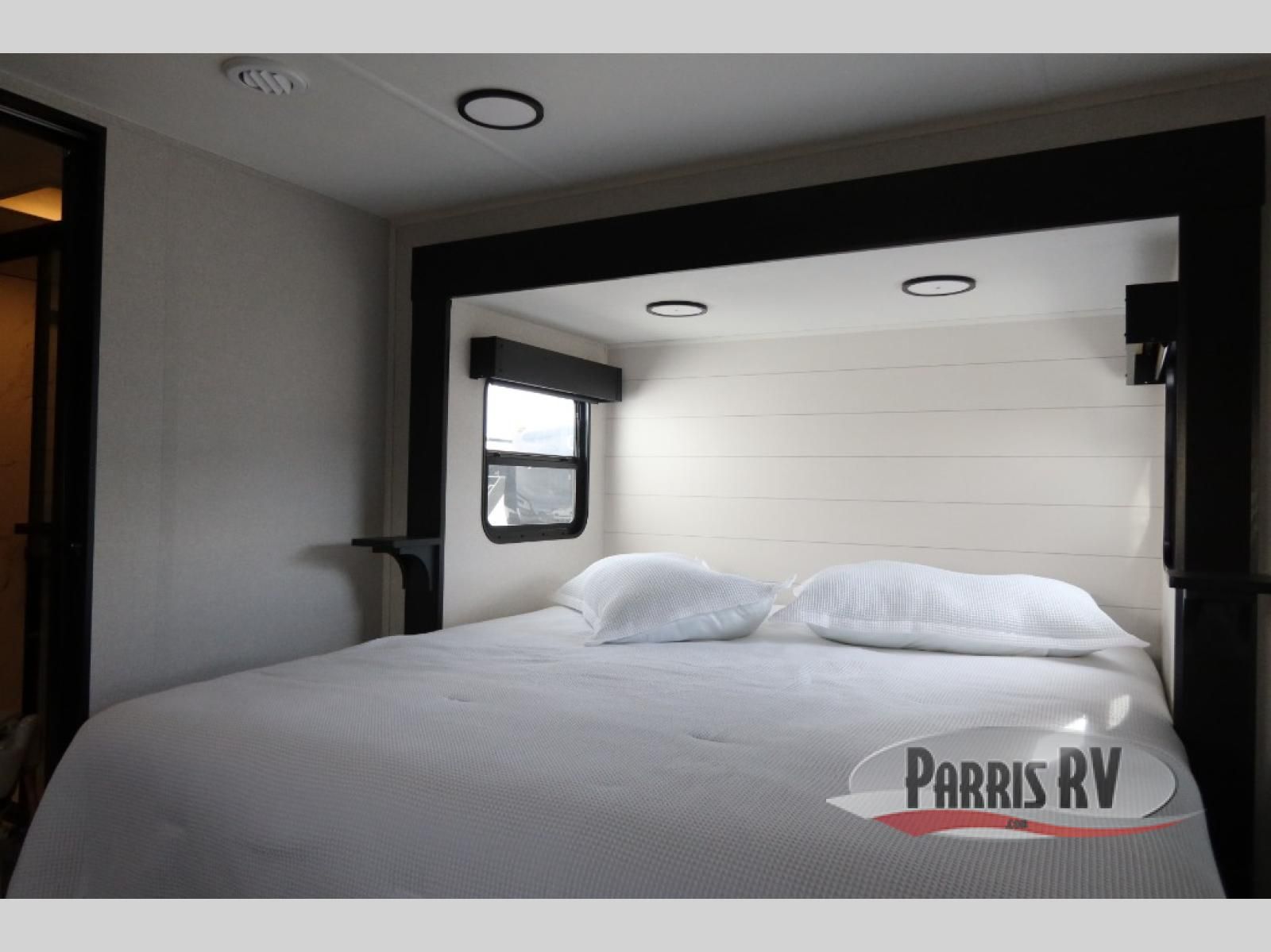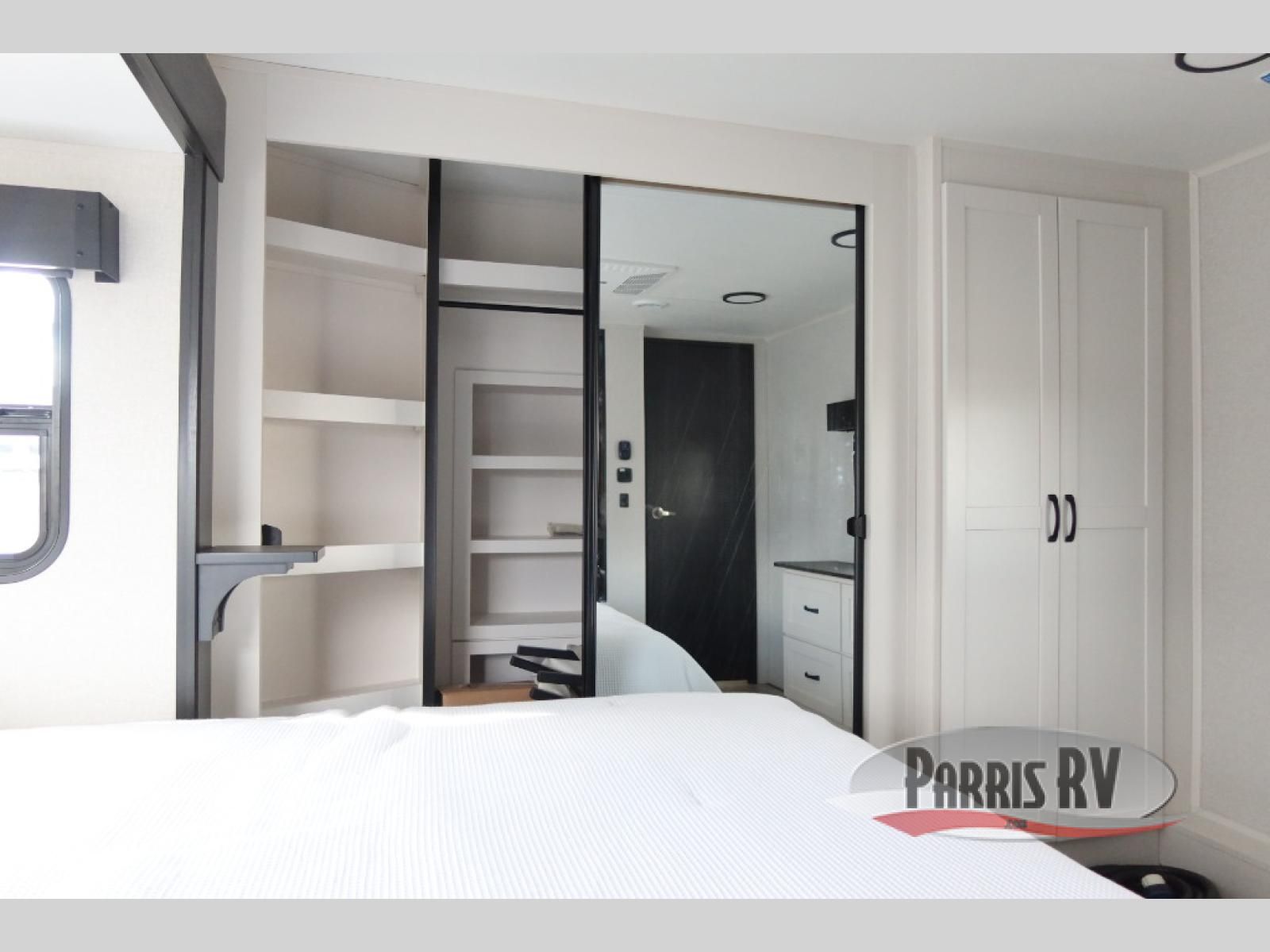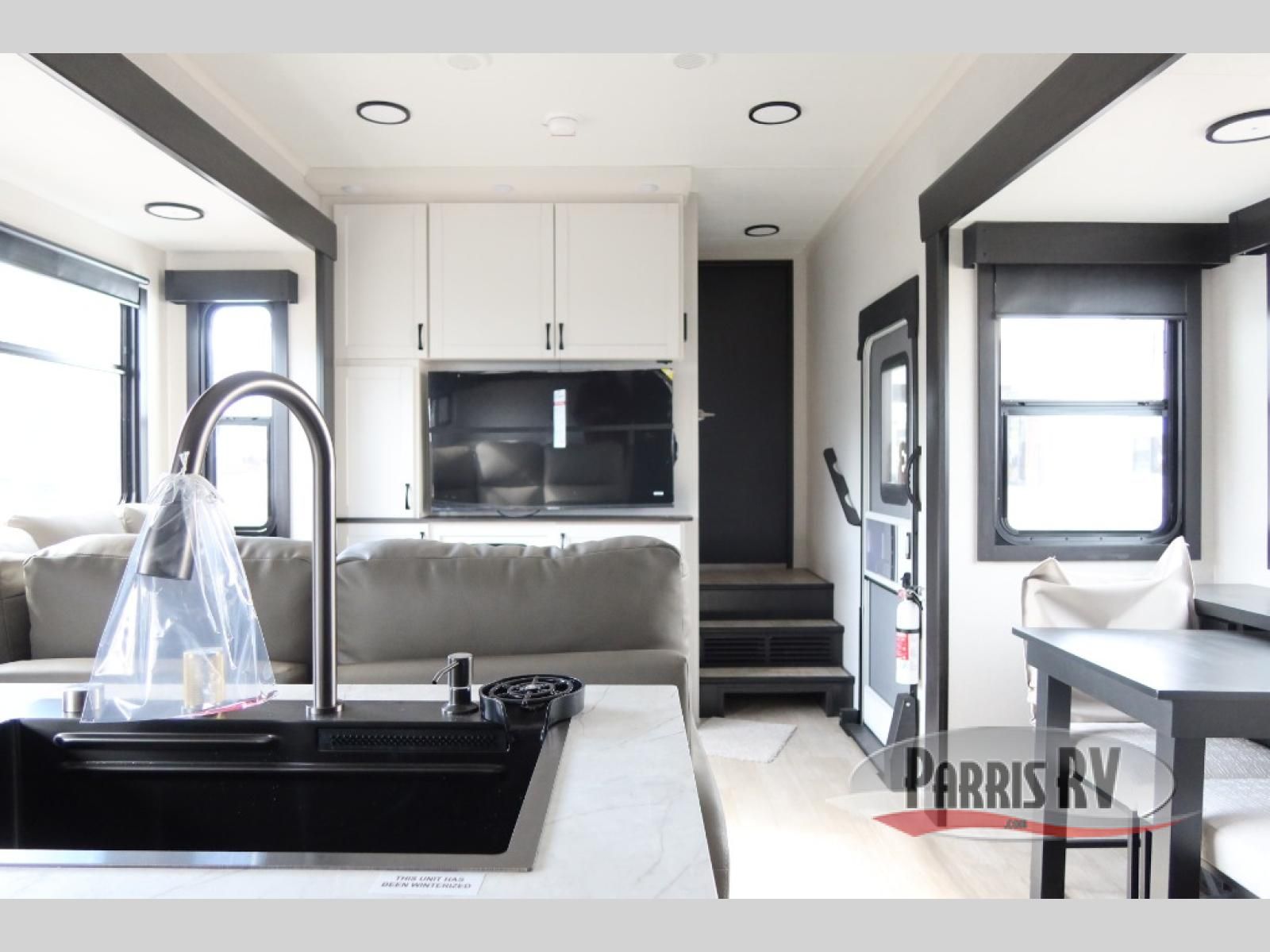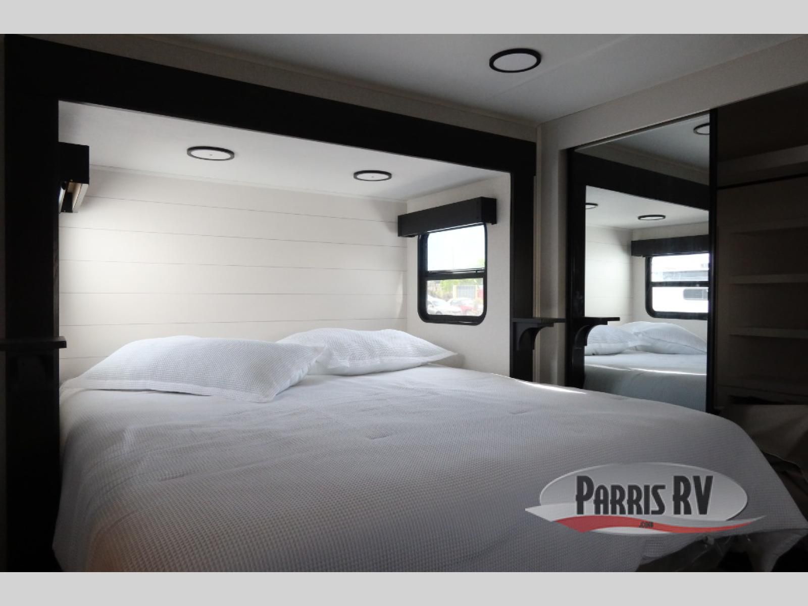 The 13' 6" garage is the perfect space for your toys, with enough room for your ATV, motorcycle, or other gear. Plus, the electric queen bed provides a comfortable spot to rest after a long day. The overhead loft with storage provides additional space for your gear, keeping it out of the way but still accessible. The kitchen is fully equipped with a microwave, sink, overhead cabinets, pantry, and coffee bar. The L-shaped sofa provides ample seating for relaxation, and the TV is perfectly positioned for viewing. The full bathroom is a welcome convenience, providing a private space to freshen up. Also, the front bedroom is a luxurious retreat, featuring a king bed, a walk-in closet, and drawers, and on the exterior, the two entry/exit doors provide easy access to the outside, making it perfect for loading and unloading your gear.