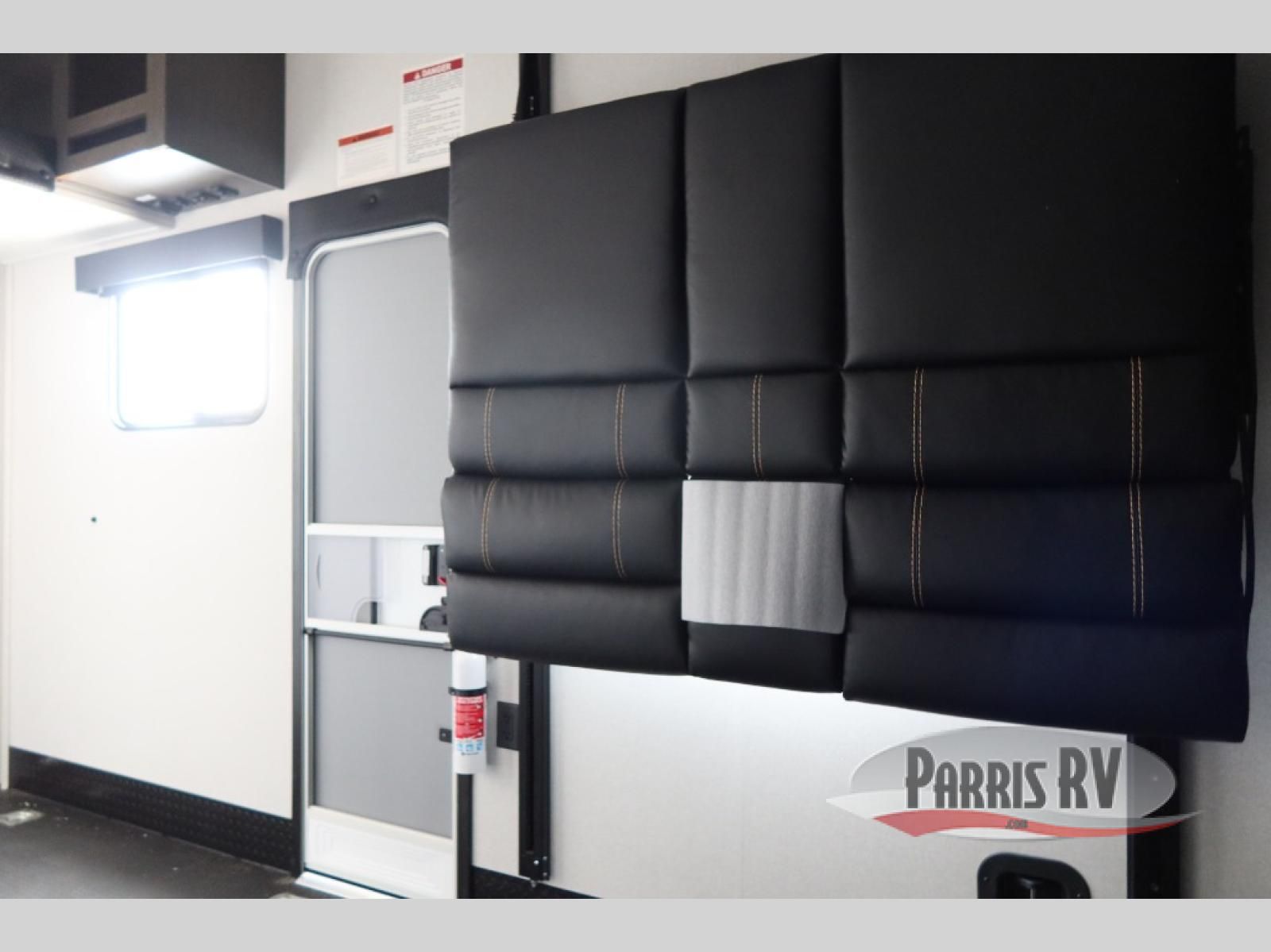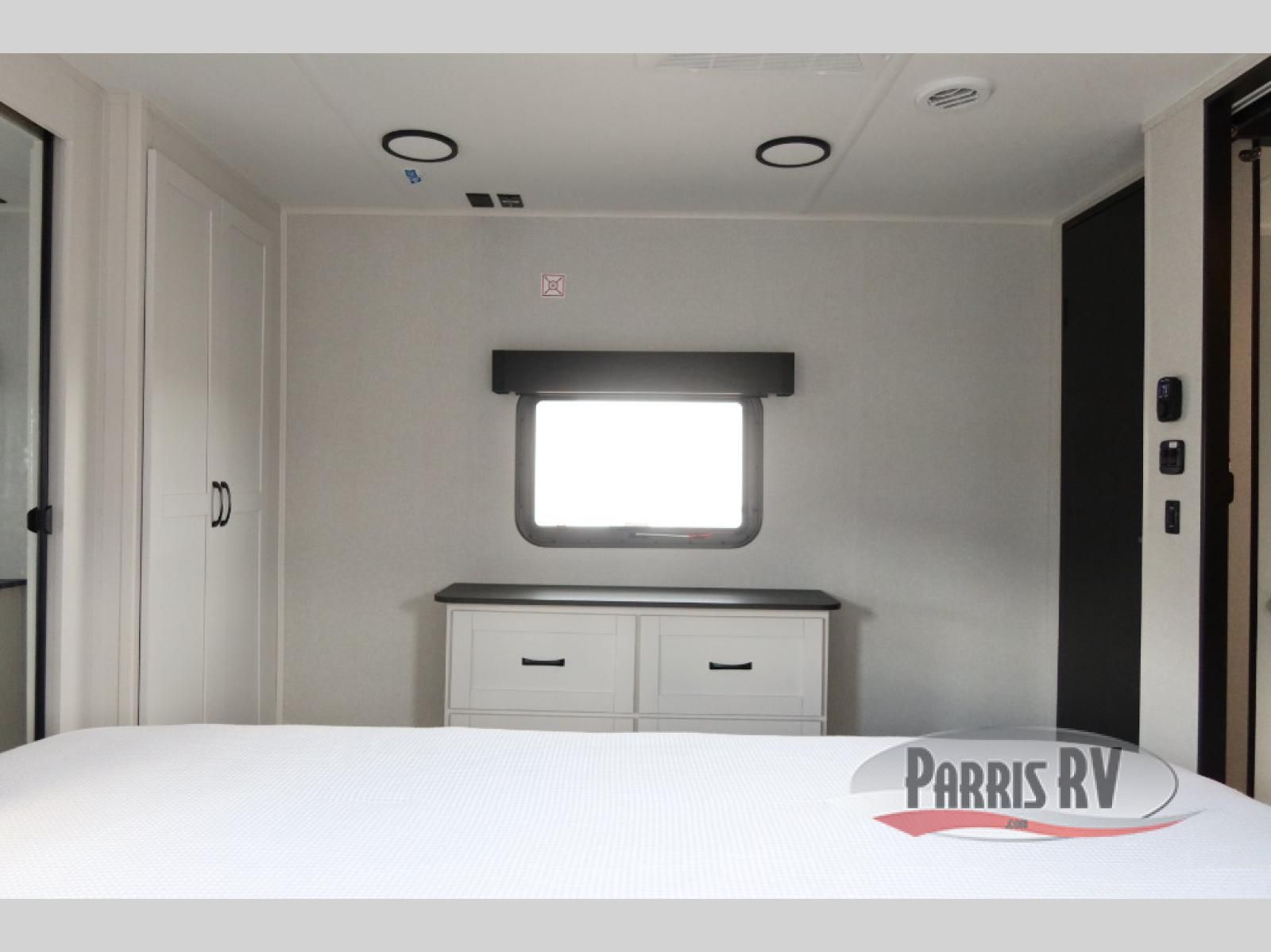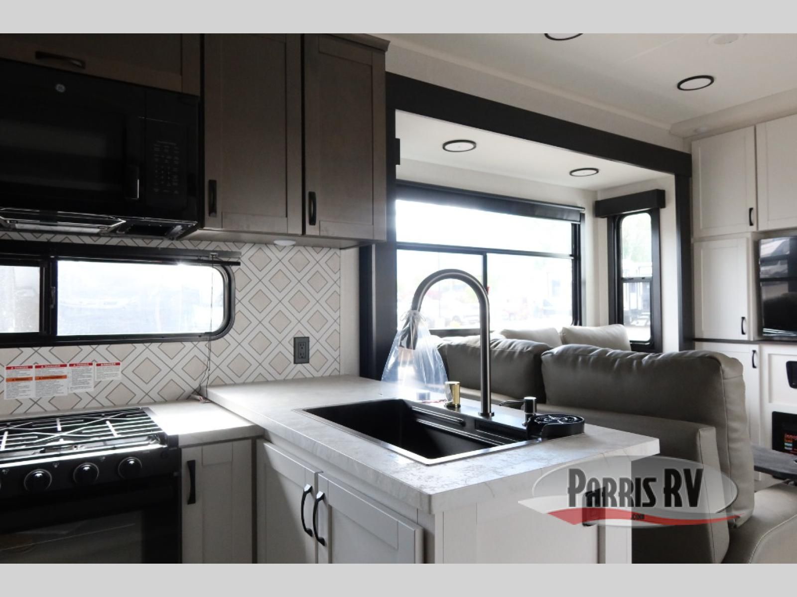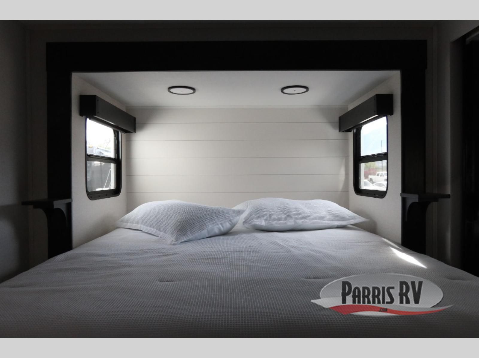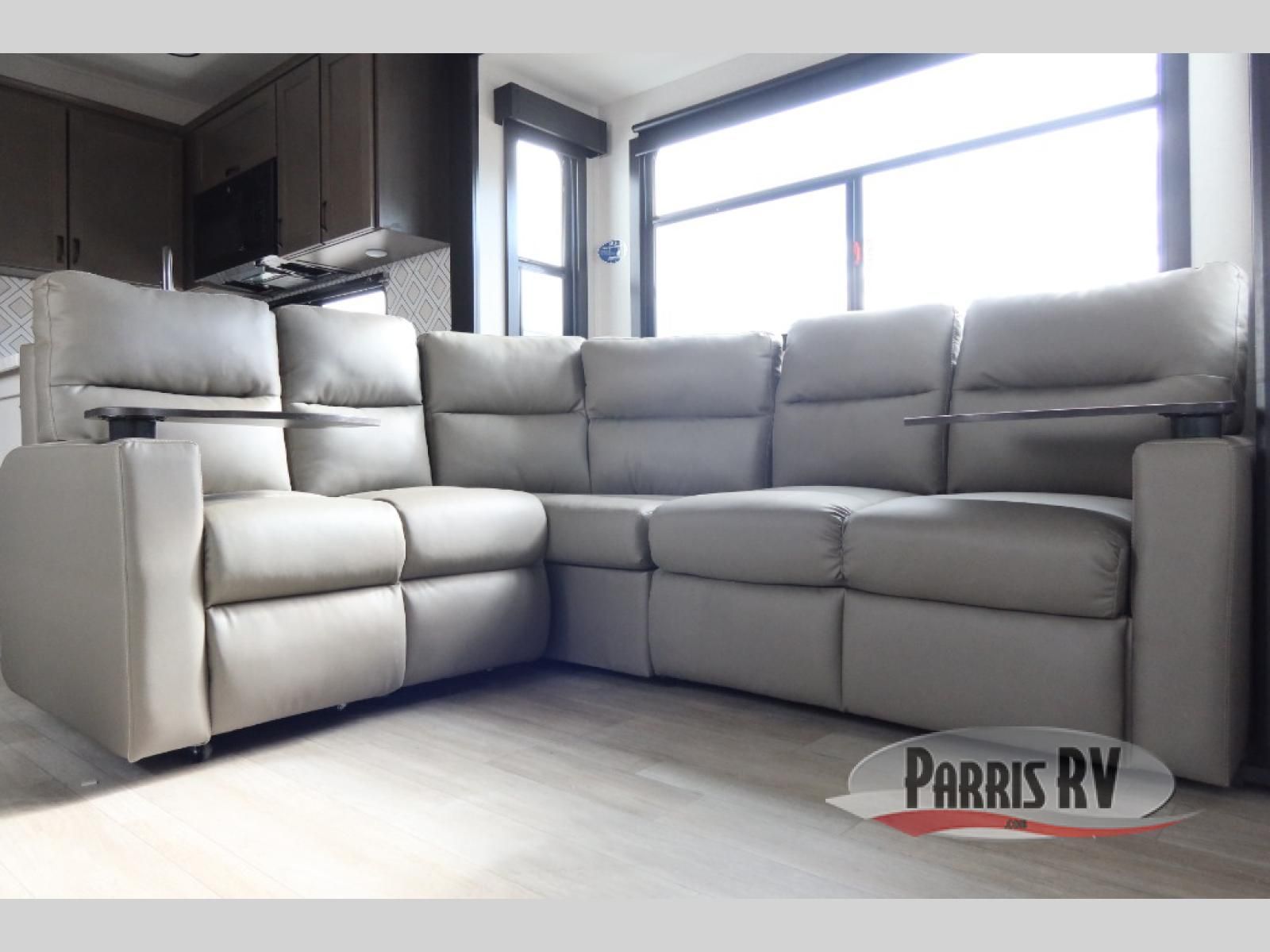 The 13' 6" garage is the perfect space for your toys, with enough room for your ATV, motorcycle, or other gear. Plus, the electric queen bed provides a comfortable spot to rest after a long day. The overhead loft with storage provides additional space for your gear, keeping it out of the way but still accessible. The kitchen is fully equipped with a microwave, sink, overhead cabinets, pantry, and coffee bar. The L-shaped sofa provides ample seating for relaxation, and the TV is perfectly positioned for viewing. The full bathroom is a welcome convenience, providing a private space to freshen up. Also, the front bedroom is a luxurious retreat, featuring a king bed, a walk-in closet, and drawers, and on the exterior, the two entry/exit doors provide easy access to the outside, making it perfect for loading and unloading your gear.