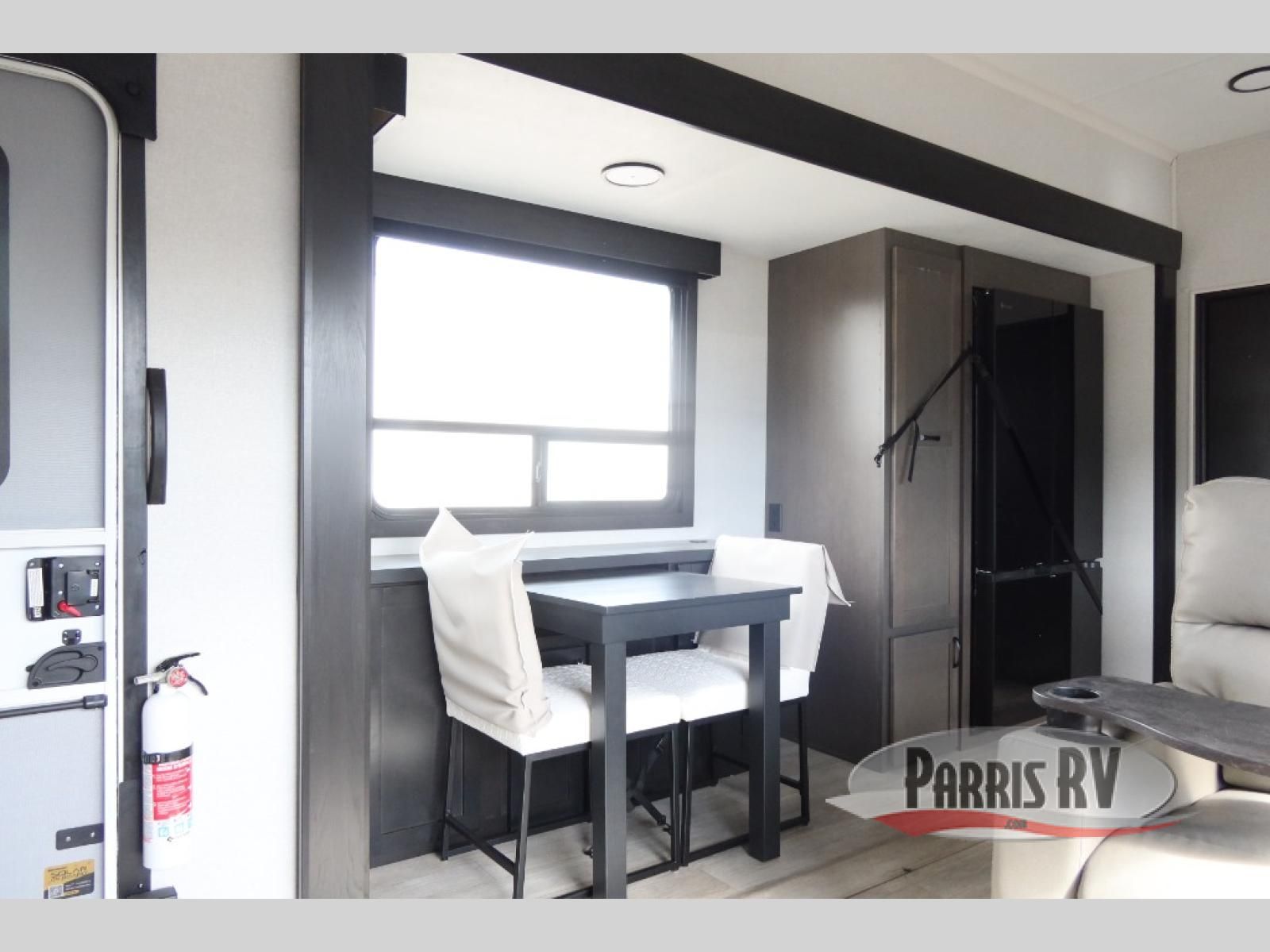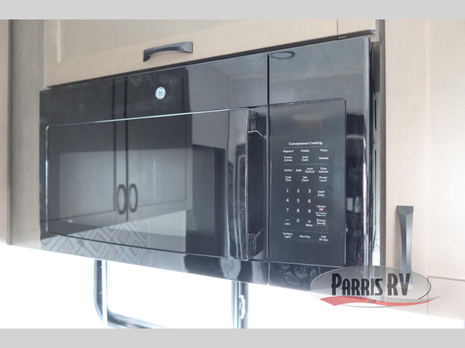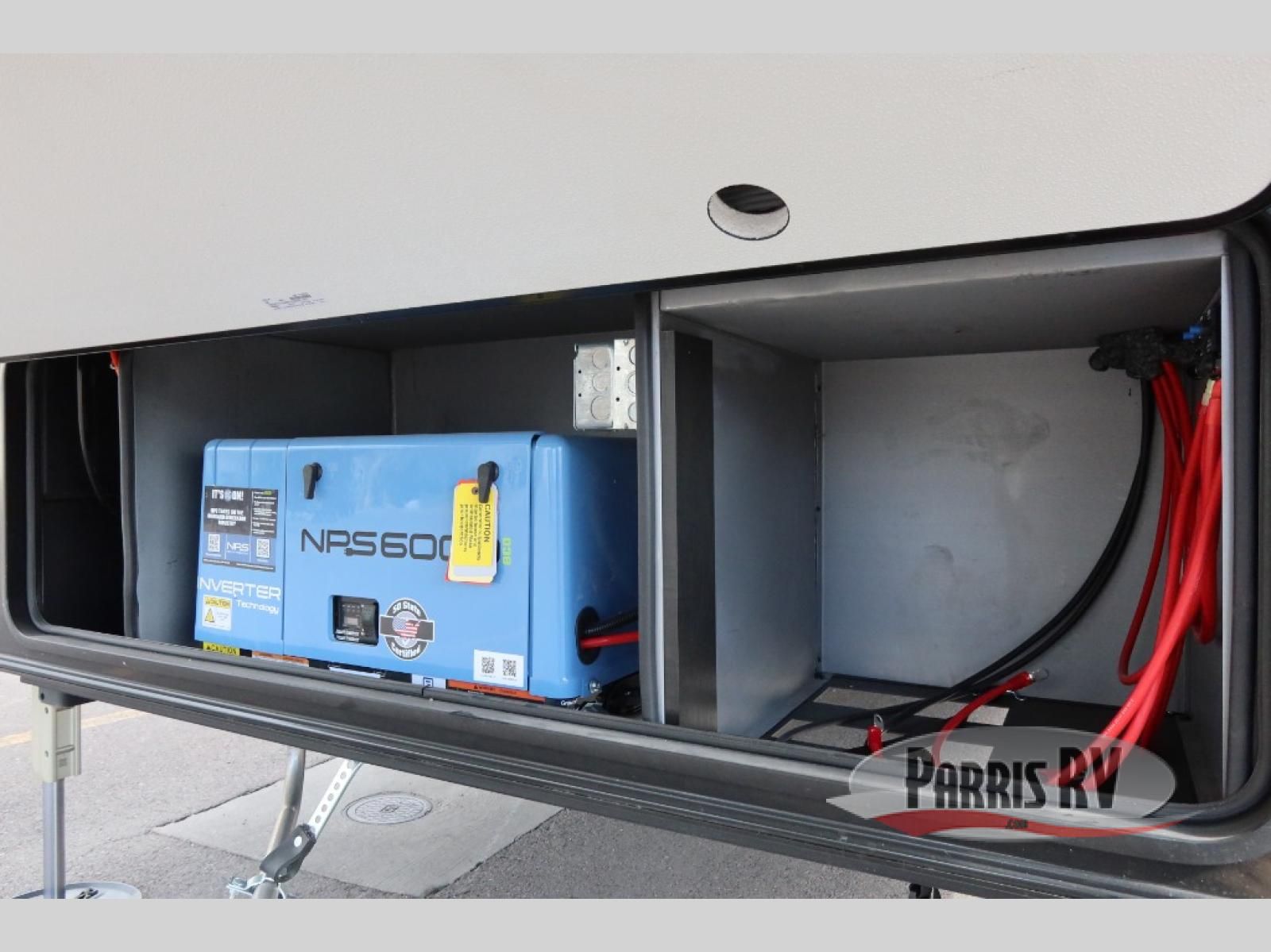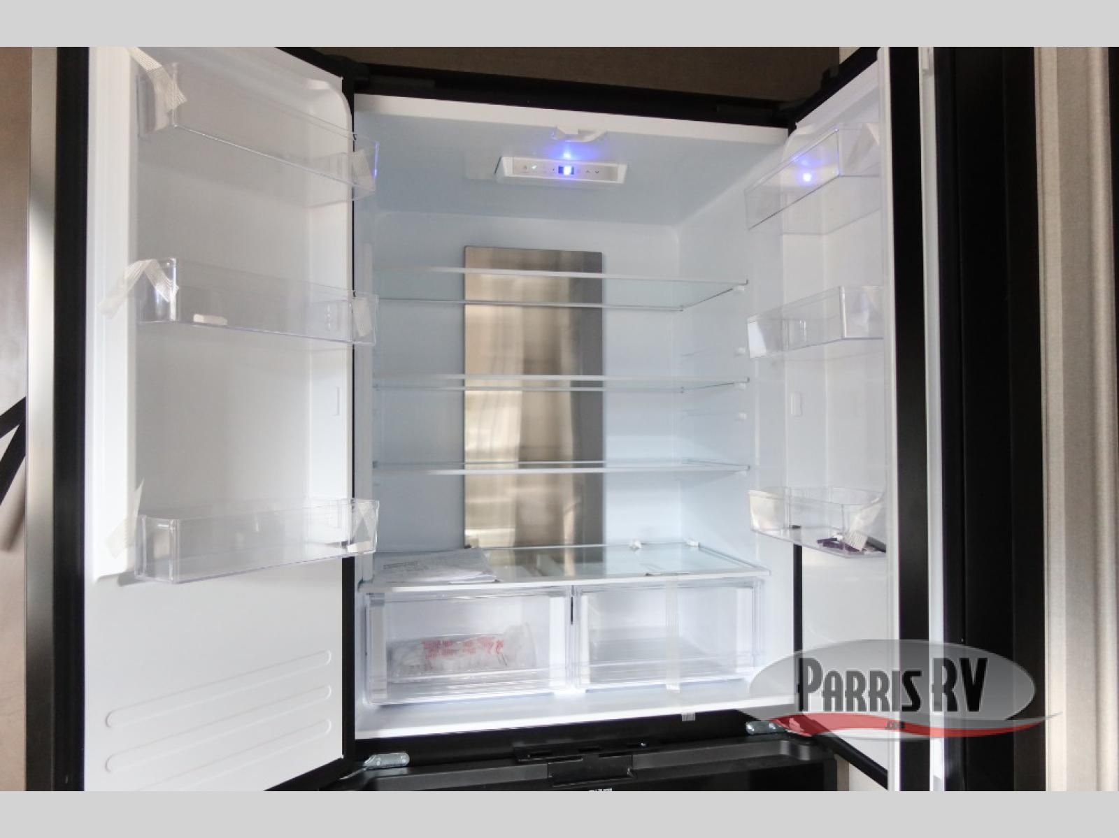 The 13' 6" garage is the perfect space for your toys, with enough room for your ATV, motorcycle, or other gear. Plus, the electric queen bed provides a comfortable spot to rest after a long day. The overhead loft with storage provides additional space for your gear, keeping it out of the way but still accessible. The kitchen is fully equipped with a microwave, sink, overhead cabinets, pantry, and coffee bar. The L-shaped sofa provides ample seating for relaxation, and the TV is perfectly positioned for viewing. The full bathroom is a welcome convenience, providing a private space to freshen up. Also, the front bedroom is a luxurious retreat, featuring a king bed, a walk-in closet, and drawers, and on the exterior, the two entry/exit doors provide easy access to the outside, making it perfect for loading and unloading your gear.