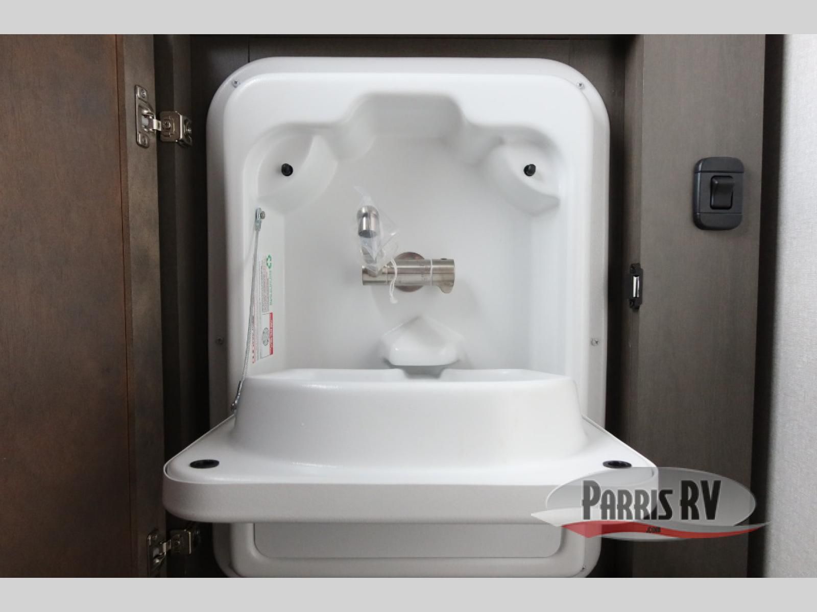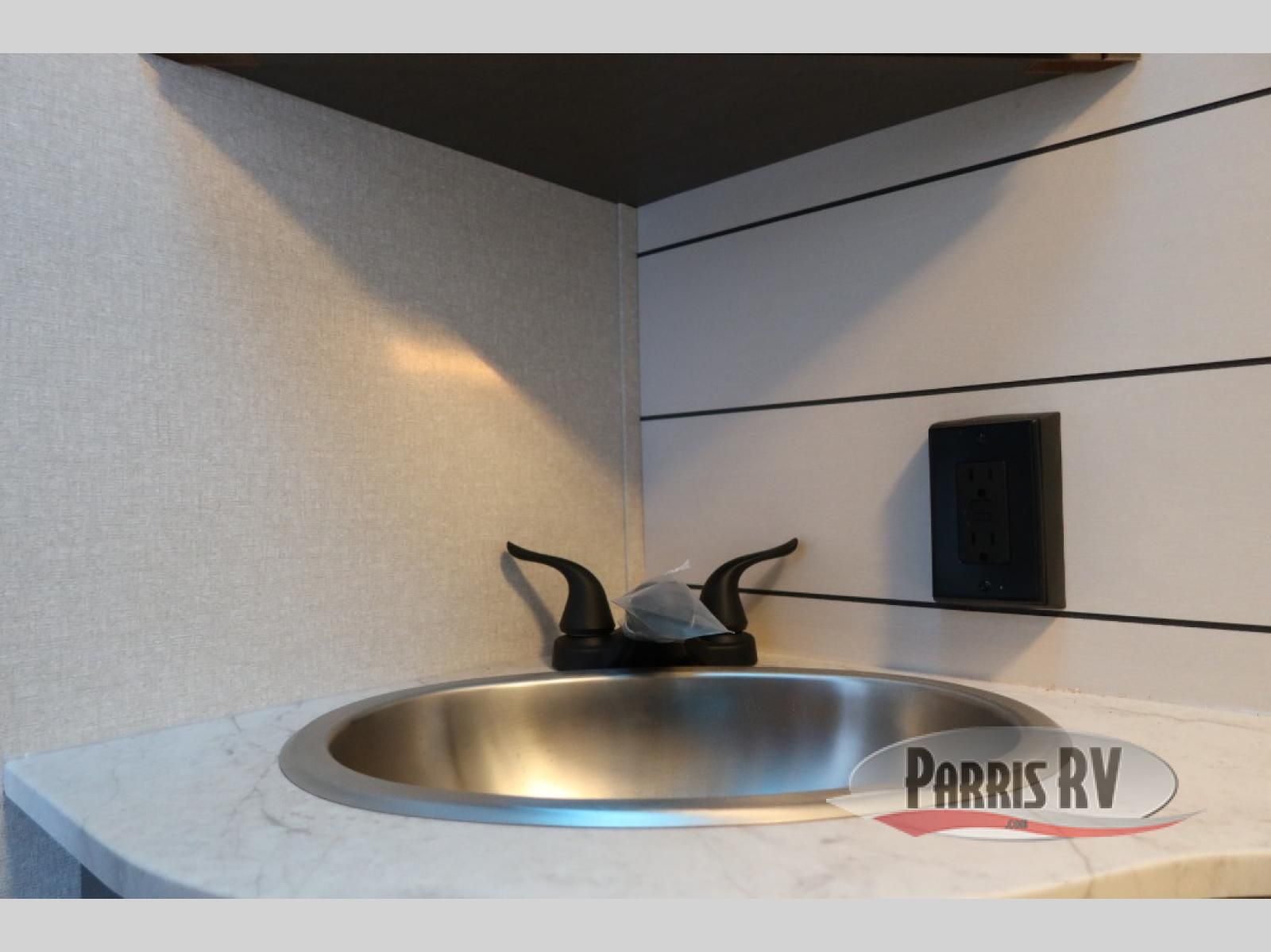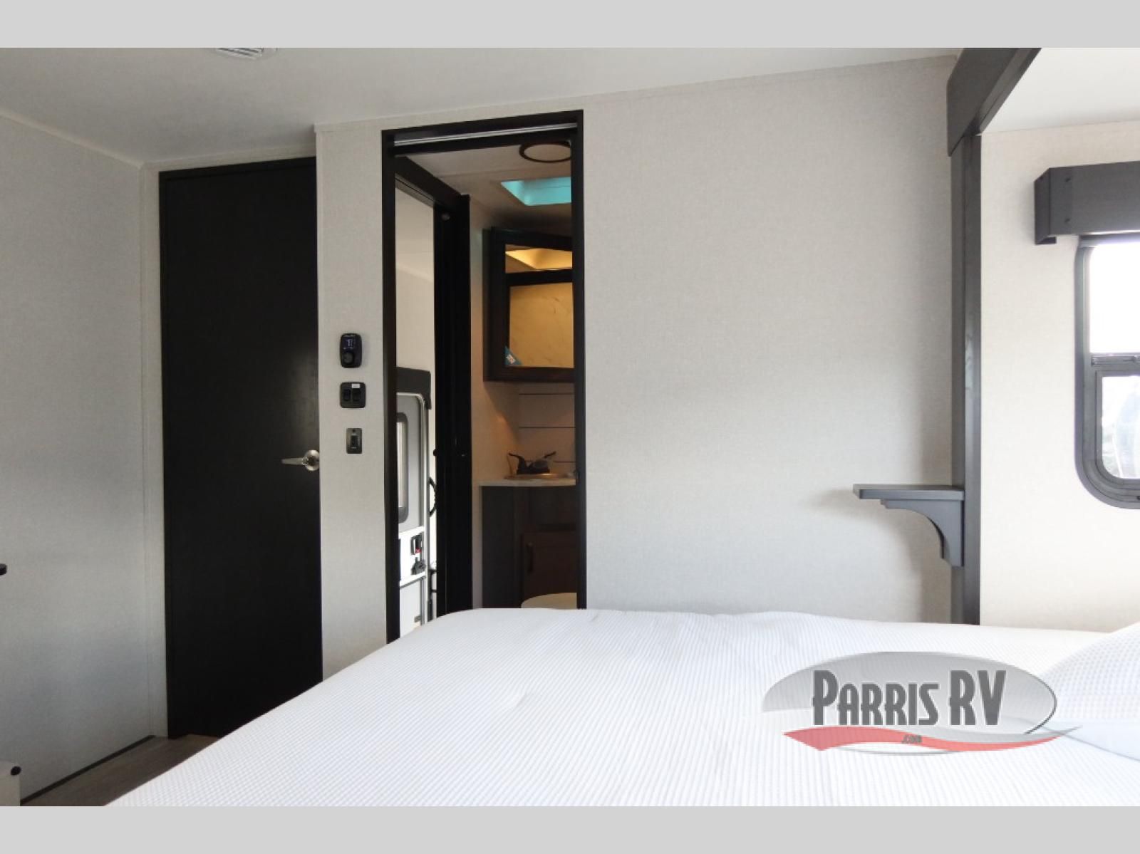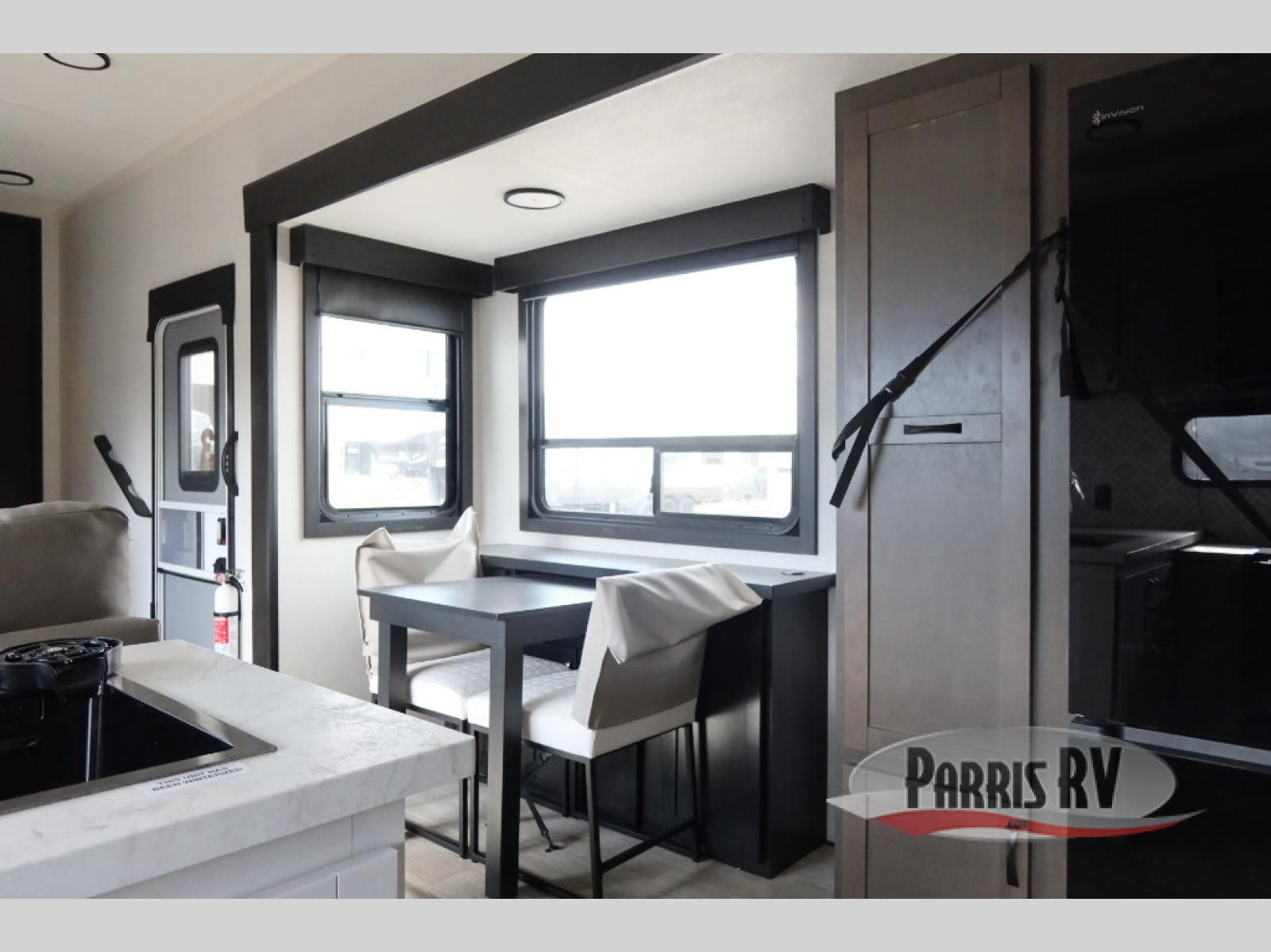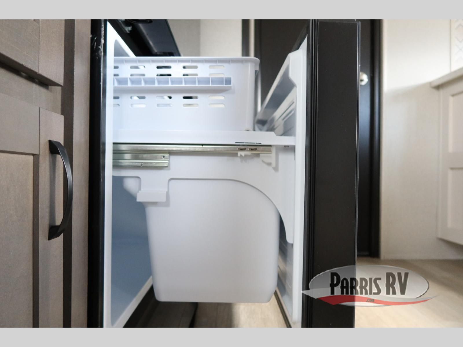The 13' 6" garage is the perfect space for your toys, with enough room for your ATV, motorcycle, or other gear. Plus, the electric queen bed provides a comfortable spot to rest after a long day. The overhead loft with storage provides additional space for your gear, keeping it out of the way but still accessible. The kitchen is fully equipped with a microwave, sink, overhead cabinets, pantry, and coffee bar. The L-shaped sofa provides ample seating for relaxation, and the TV is perfectly positioned for viewing. The full bathroom is a welcome convenience, providing a private space to freshen up. Also, the front bedroom is a luxurious retreat, featuring a king bed, a walk-in closet, and drawers, and on the exterior, the two entry/exit doors provide easy access to the outside, making it perfect for loading and unloading your gear.