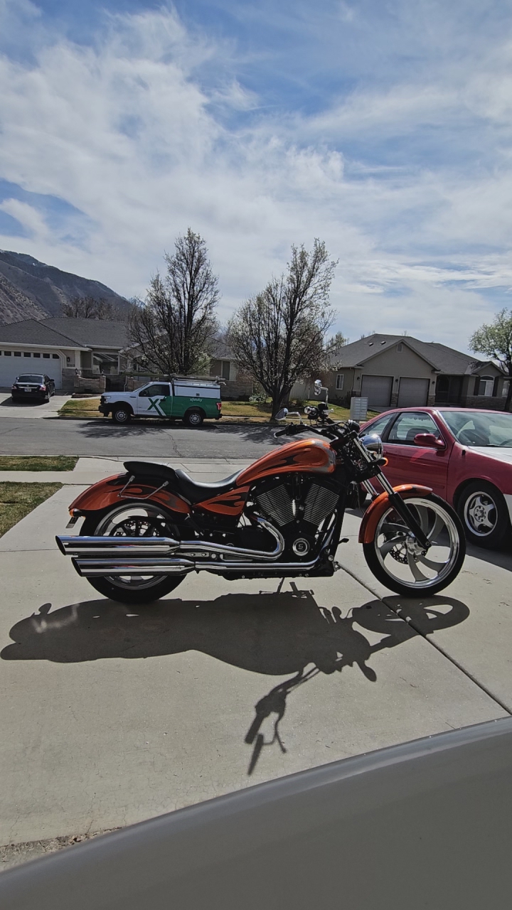 Nuclear Sunset Flames 100Ci fuel injected motor (1639cc) 13600 miles Lowered 1.5"(can put back if needed) Orange windshield (not installed) Highway bar (not installed) Orange flame saddle bags (not installed) Sissy Bar Back Rest (not installed) Cover for bike included