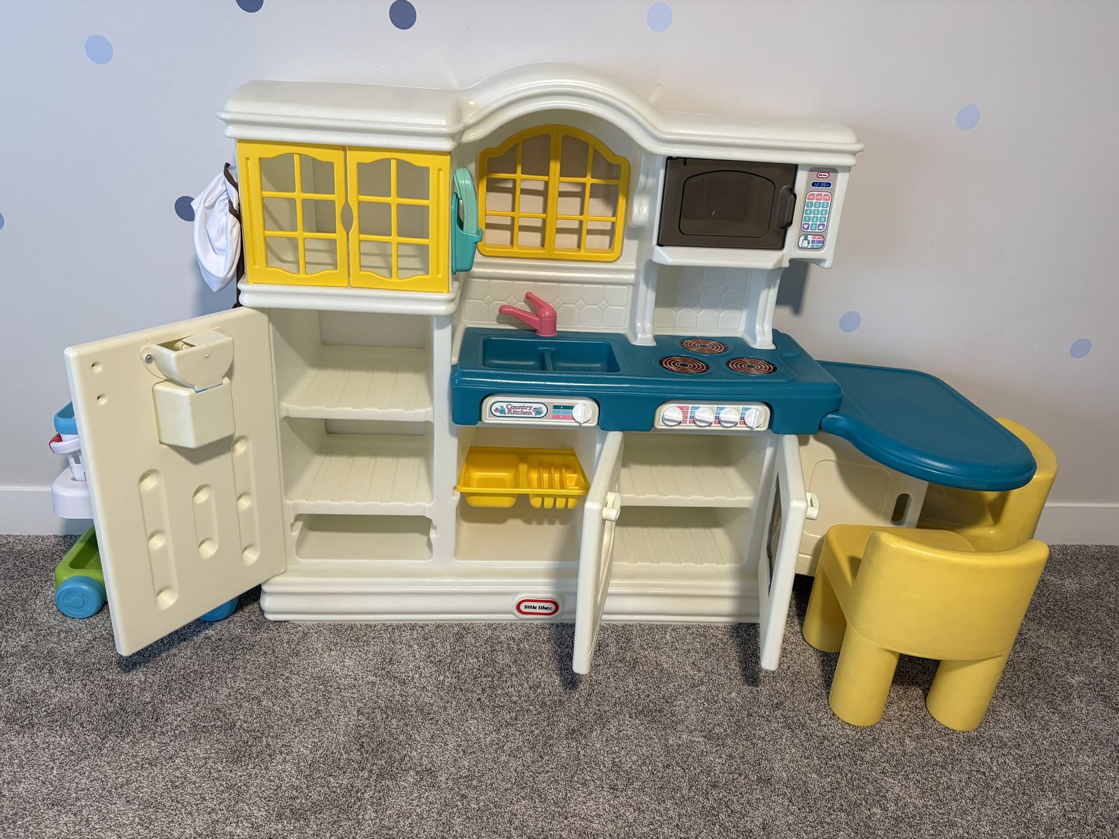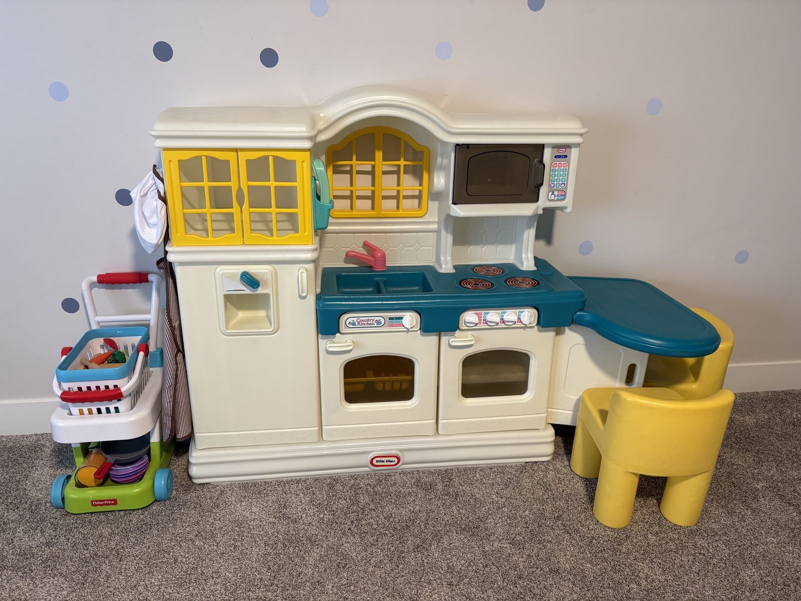 VenmoNostalgic Little Tikes Counrty Kitchen in really good condition. Comes with a shopping cart and fake food. Still has the original phone and chairs.