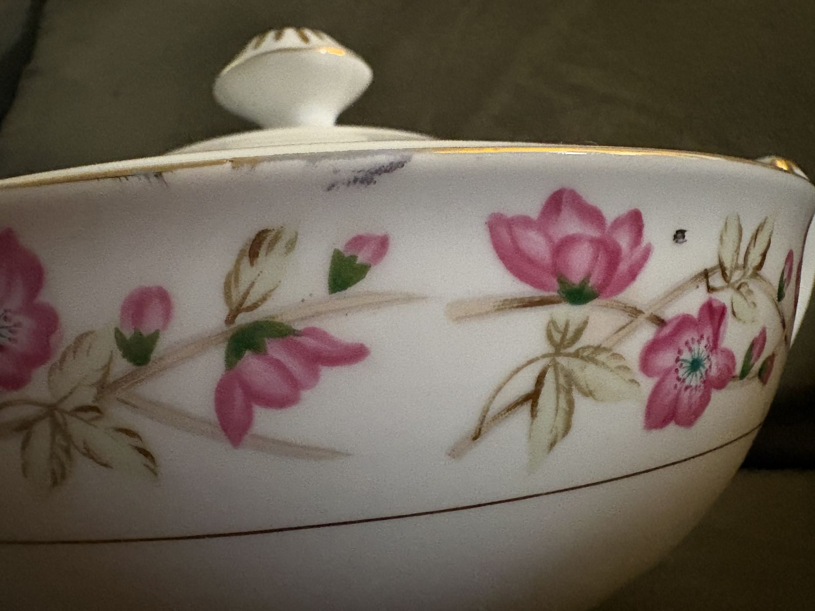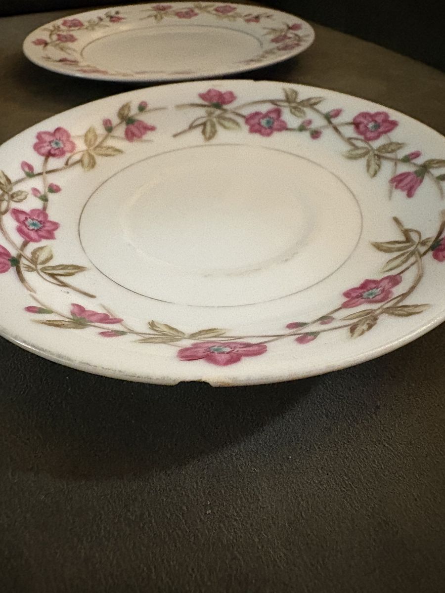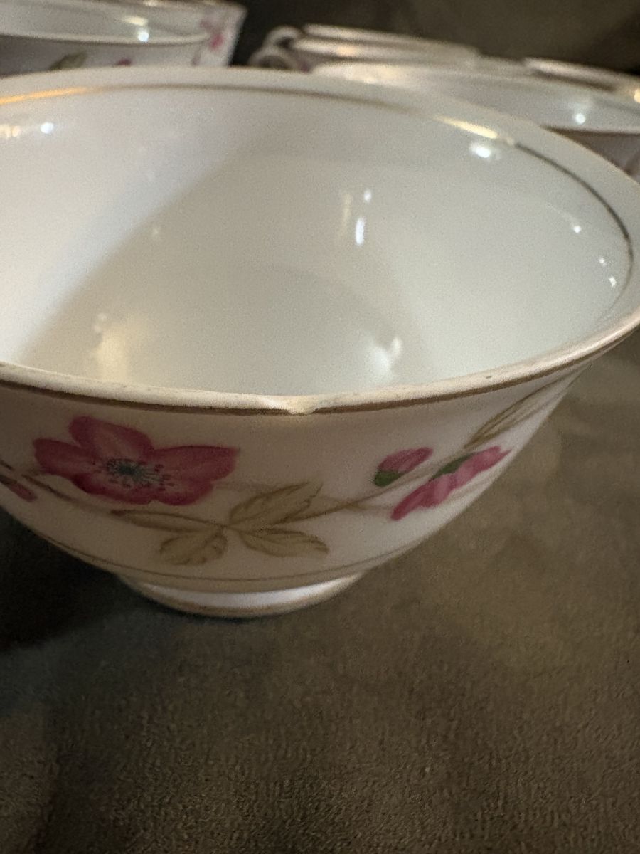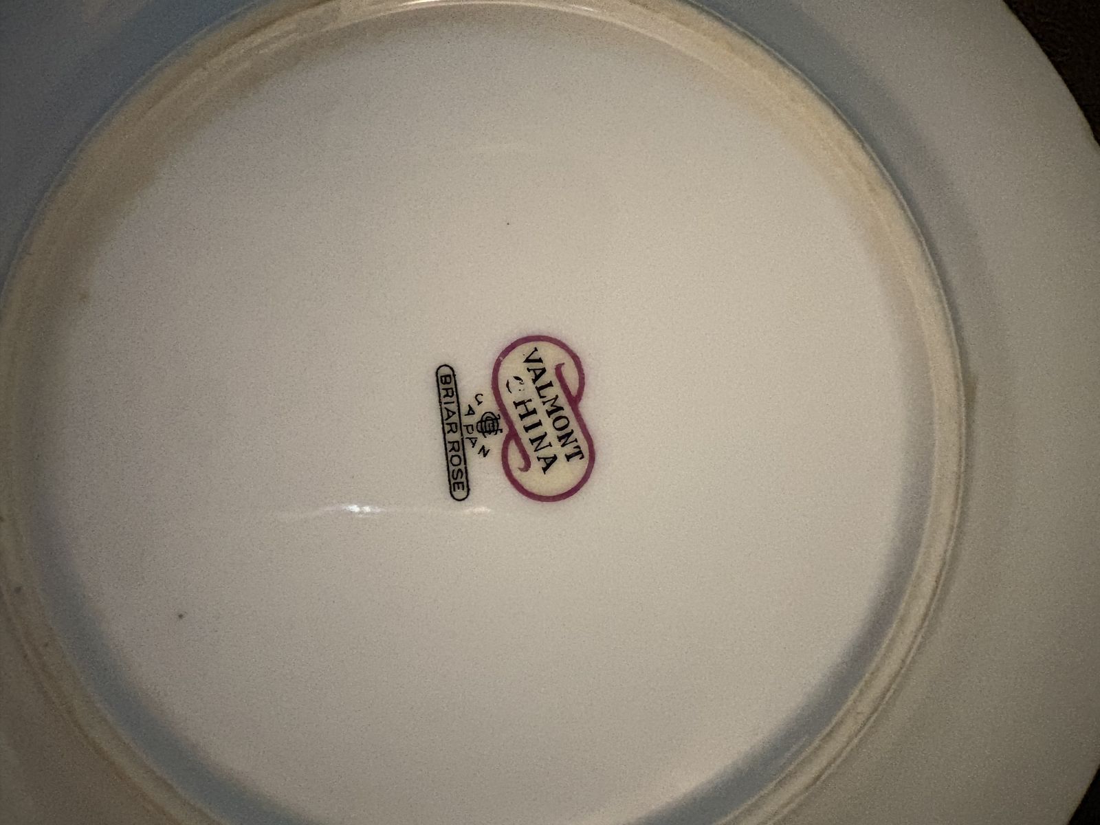 VenmoMixed Lot of Valmont China Briar Rose Series. -1 dinner plate -1 salad plate -2 saucers ( 1 saucer has 2 little chips, see pics) -1 bowl -5 dessert bowls -10 teacups (2 cups have a chip, 1 has chip on top edge and the other is on the bottom edge, see pics) -1 lg serving bowls with handles & a lid (this serving bowl has flaw where the paint has come off and it’s a silver ish black underneath, it’s right on the front top edge, see pic)