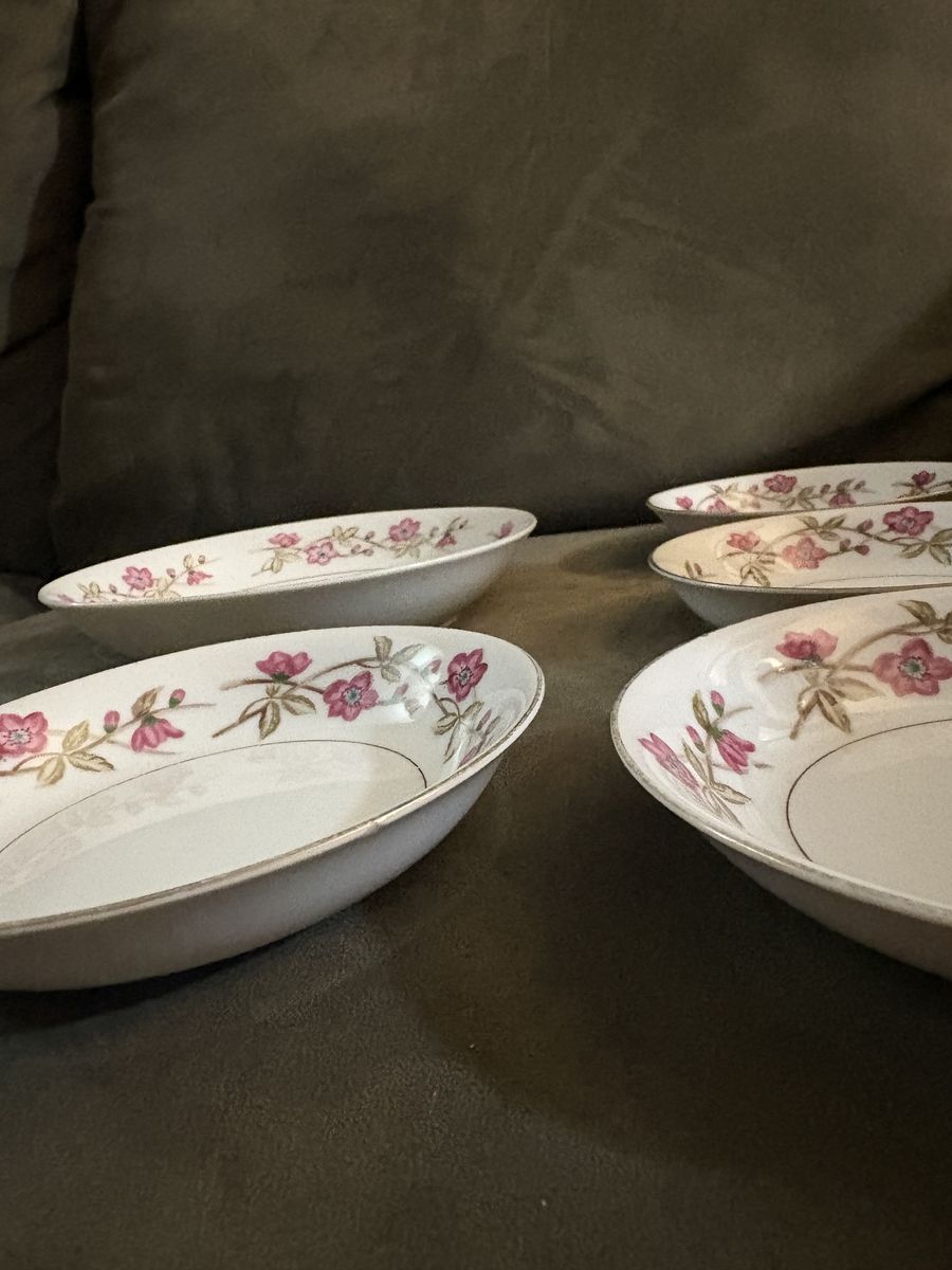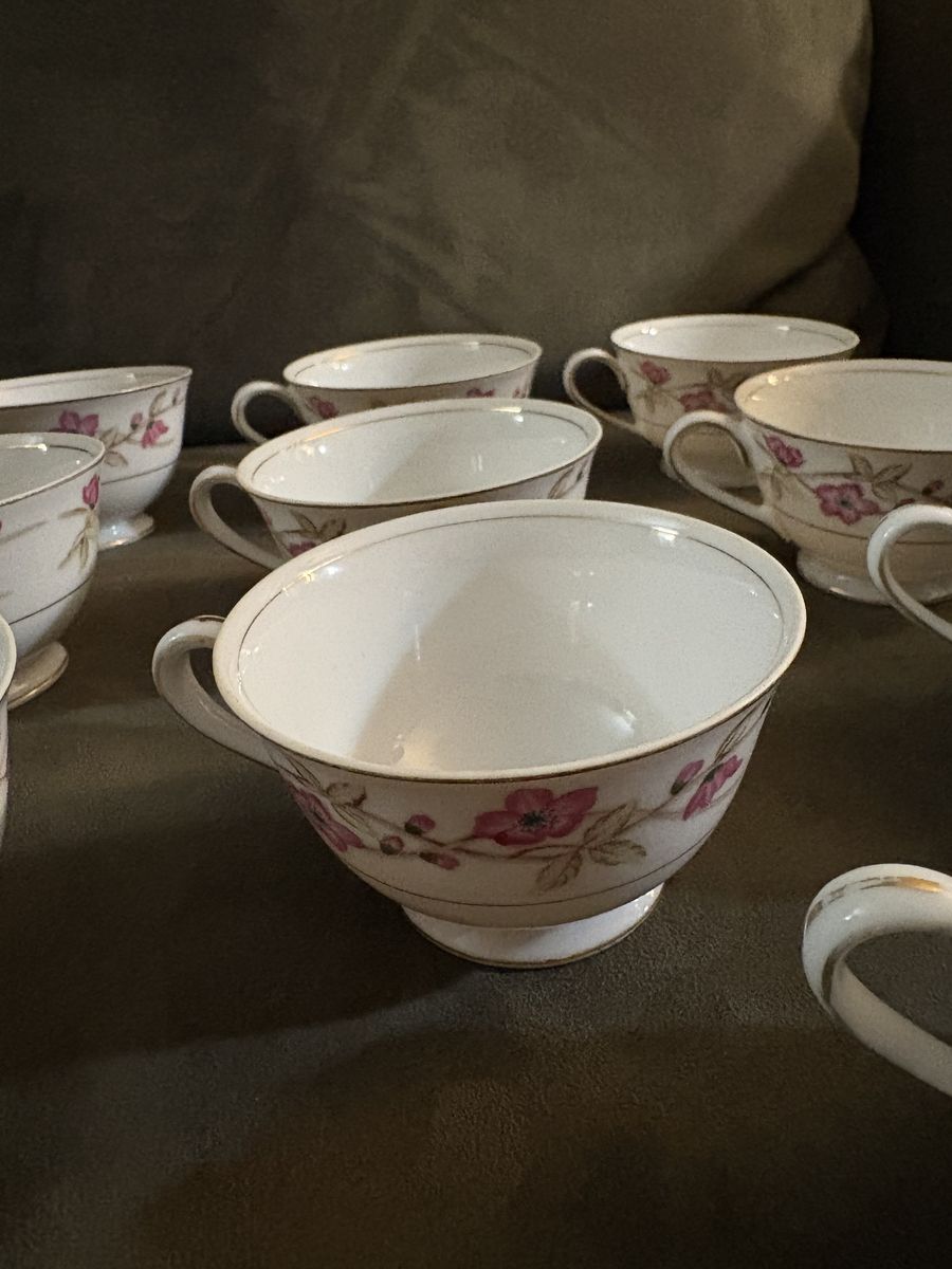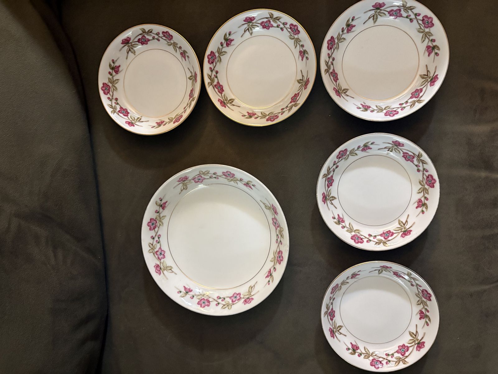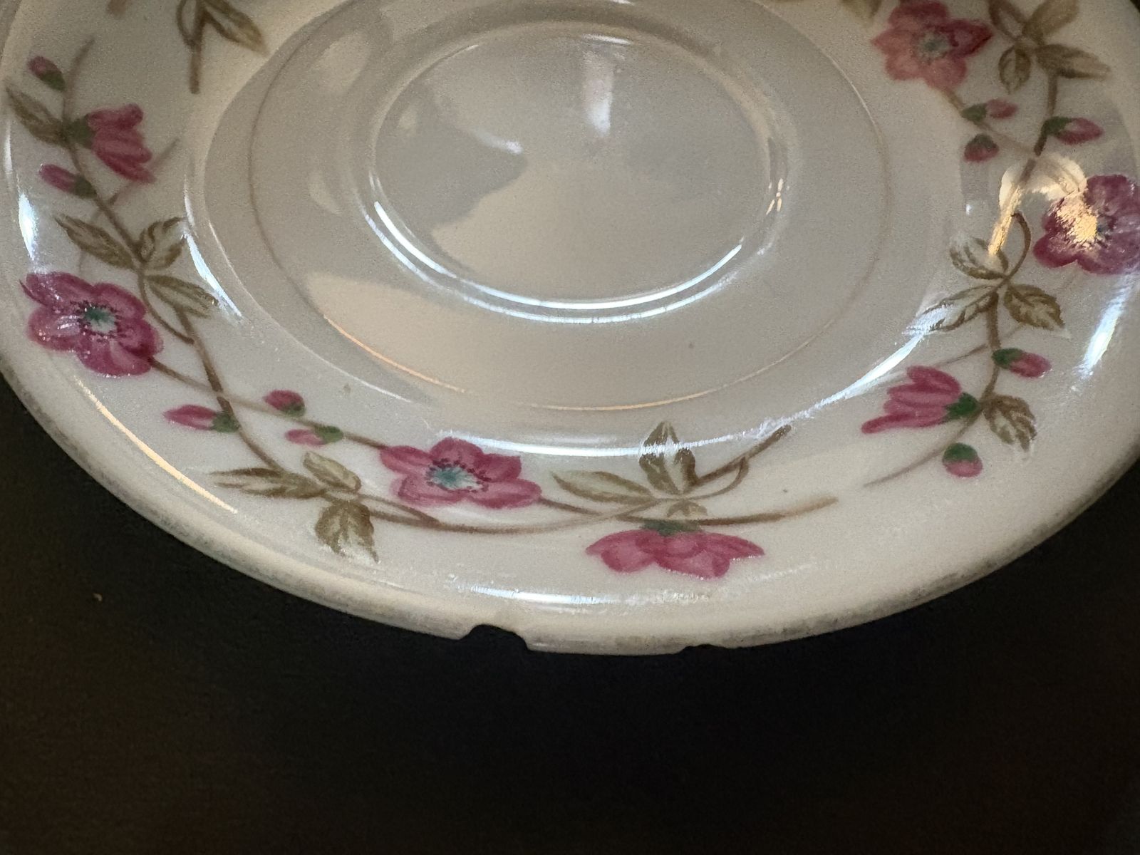 VenmoMixed Lot of Valmont China Briar Rose Series. -1 dinner plate -1 salad plate -2 saucers ( 1 saucer has 2 little chips, see pics) -1 bowl -5 dessert bowls -10 teacups (2 cups have a chip, 1 has chip on top edge and the other is on the bottom edge, see pics) -1 lg serving bowls with handles & a lid (this serving bowl has flaw where the paint has come off and it’s a silver ish black underneath, it’s right on the front top edge, see pic)