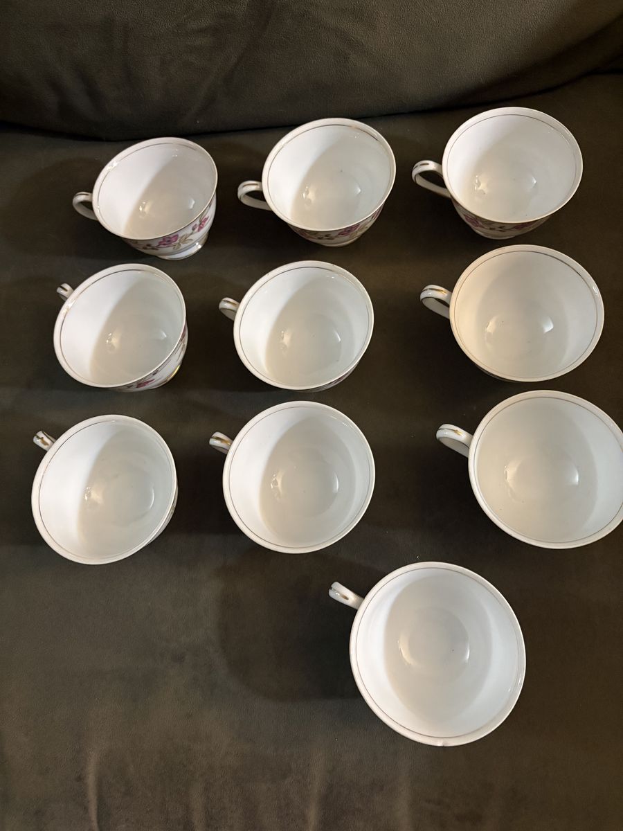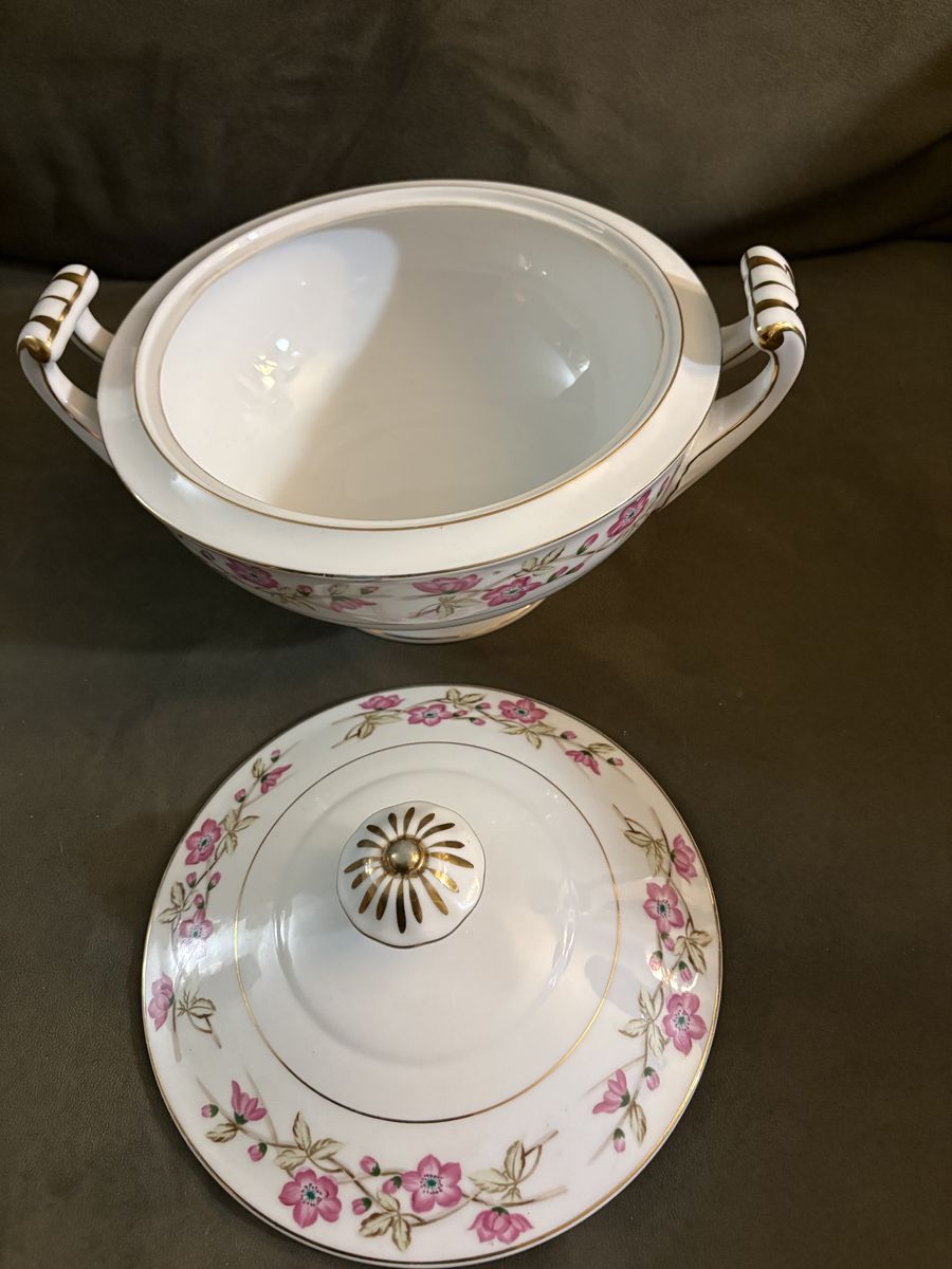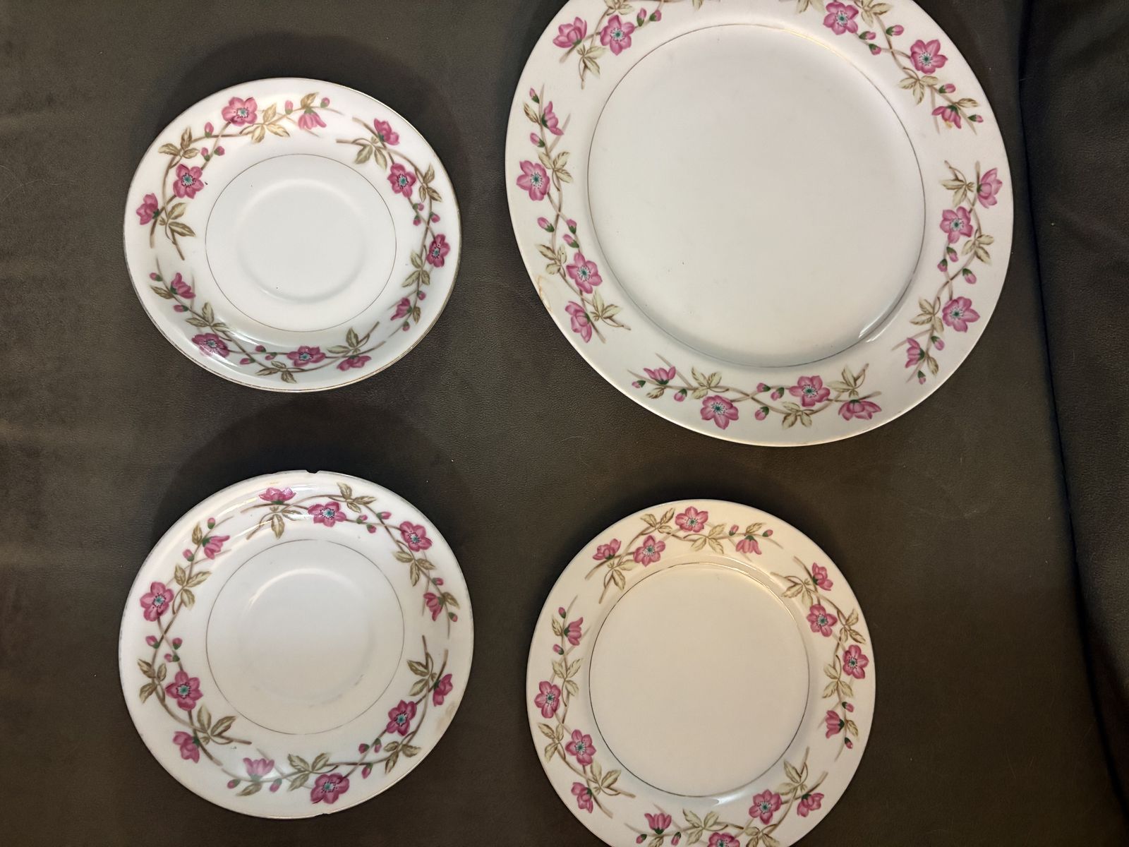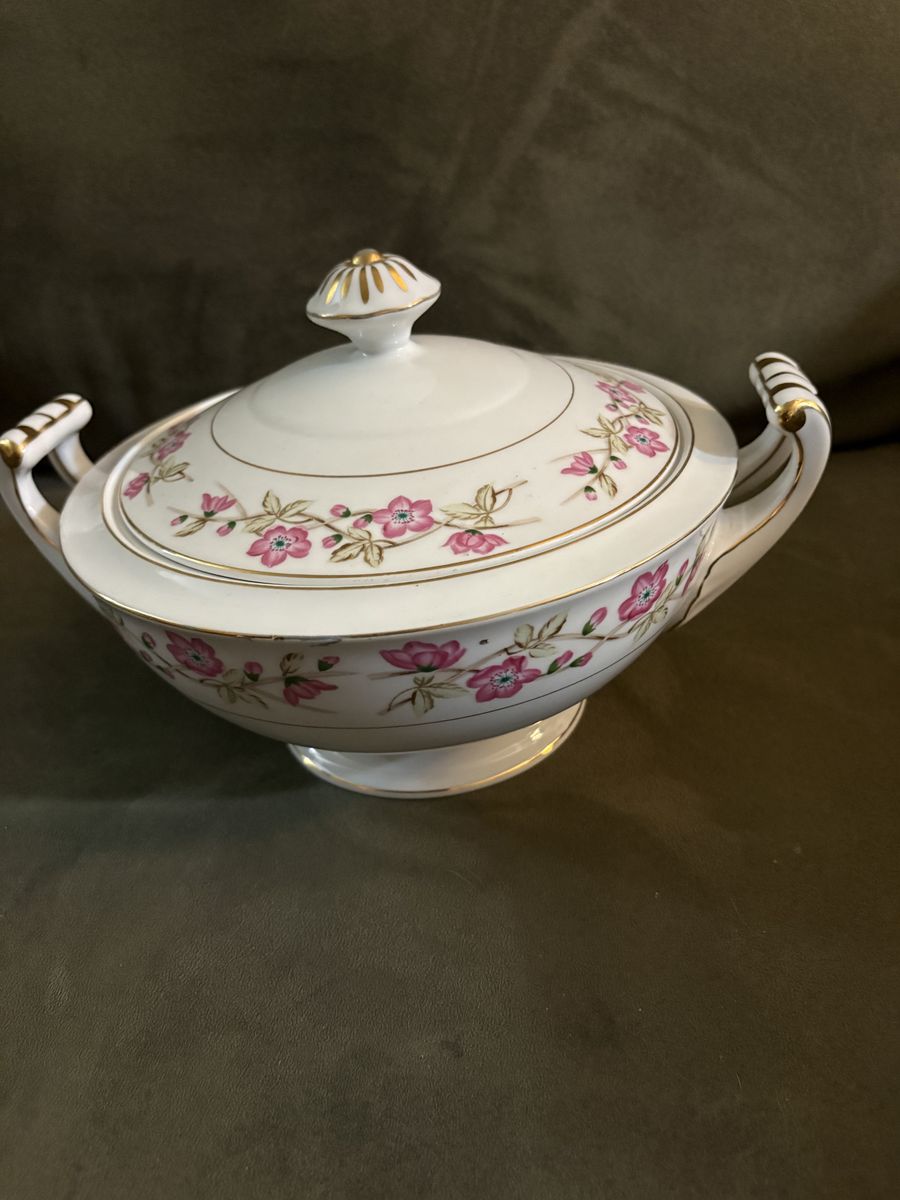 VenmoMixed Lot of Valmont China Briar Rose Series. -1 dinner plate -1 salad plate -2 saucers ( 1 saucer has 2 little chips, see pics) -1 bowl -5 dessert bowls -10 teacups (2 cups have a chip, 1 has chip on top edge and the other is on the bottom edge, see pics) -1 lg serving bowls with handles & a lid (this serving bowl has flaw where the paint has come off and it’s a silver ish black underneath, it’s right on the front top edge, see pic)