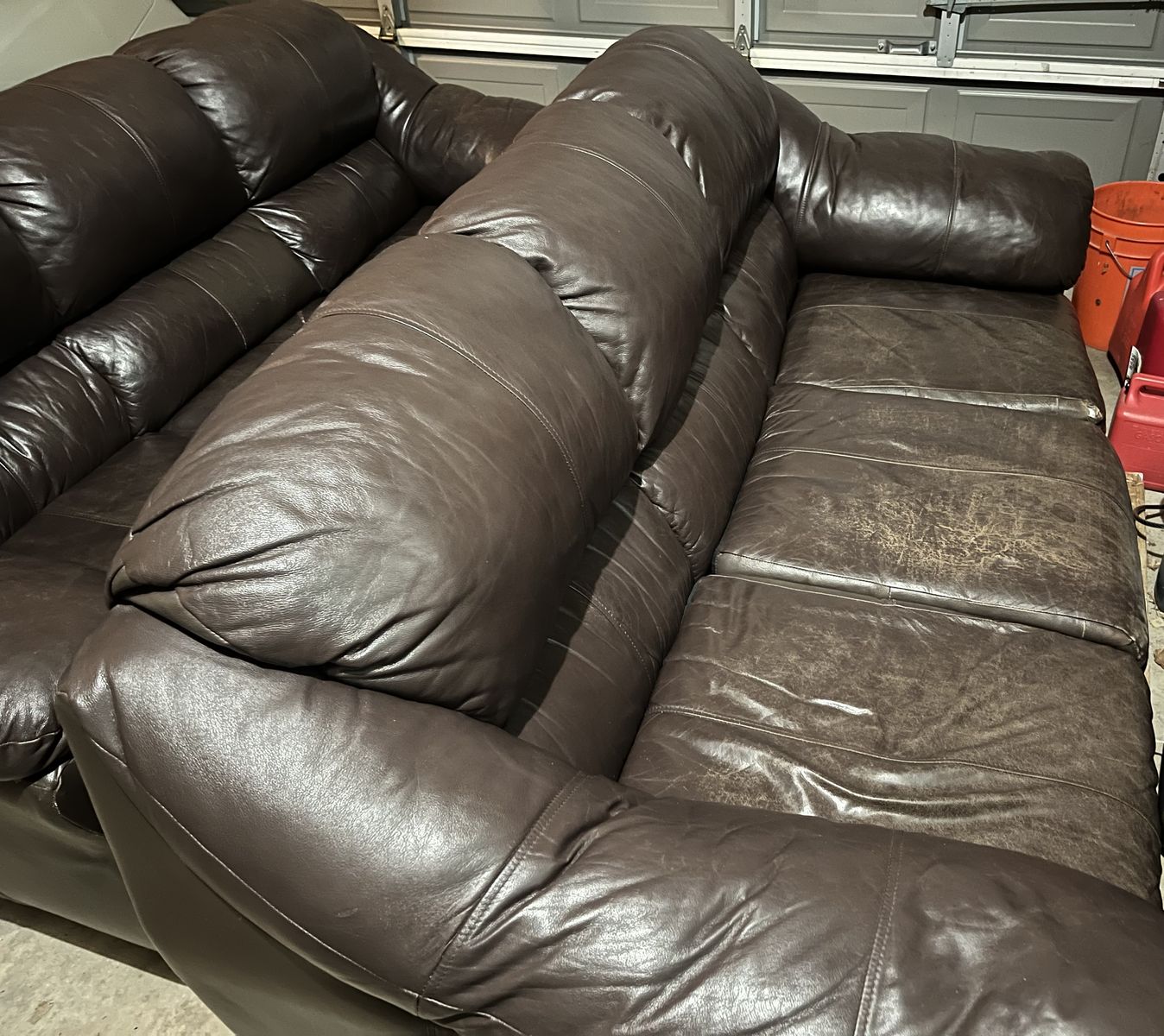 2 Brown leather couches $50 obo. One of the cushions is well worn with a small hole. Pick up in West Point