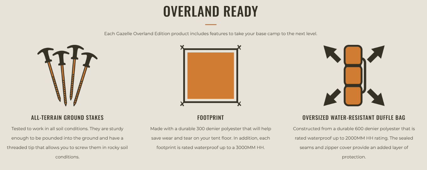 • OVERLAND-READY UPGRADES – Includes a 300D Oxford footprint for extra floor protection, All-Terrain Stakes for challenging terrain, oversized water-resistant duffle bag with taped seams, and a removable rain fly for added weather protection.