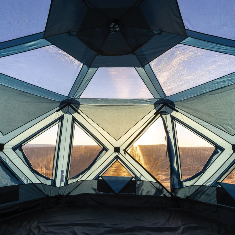 The 6-sided design provides 123 sq. ft. of interior space and 85” center height, comfortably accommodating up to seven campers with extra room for gear. Fifteen oversized TriTech mesh windows maximize airflow while keeping bugs out, creating a nearly panoramic gazebo-like experience.