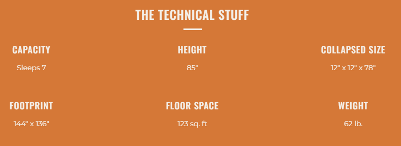 • SPACIOUS 6-SIDED DESIGN – With 123 sq. ft. of floor space and 85” center height, the T-Hex comfortably sleeps up to seven people and provides ample room for gear, creating a nearly gazebo-like camping experience.