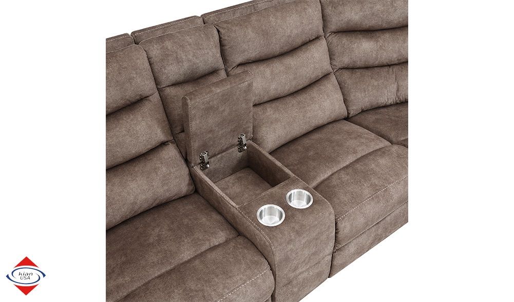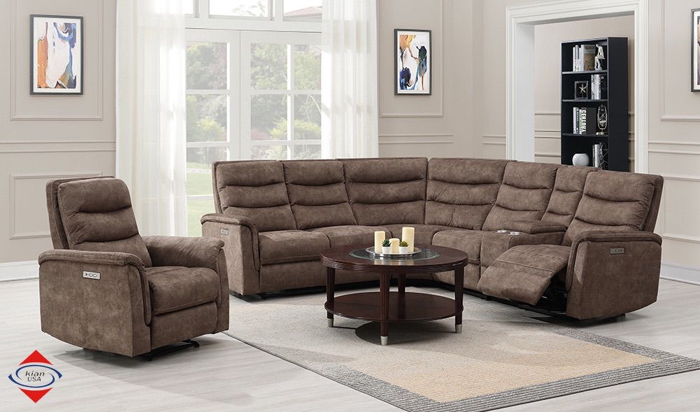 ApplePayThis beautiful sectional has 6 pieces, 3 of which are power motion recliners. USB port on each side. Stainless steel cupholders. Compartment for storage. Polished microfiber. In the color Cafe.