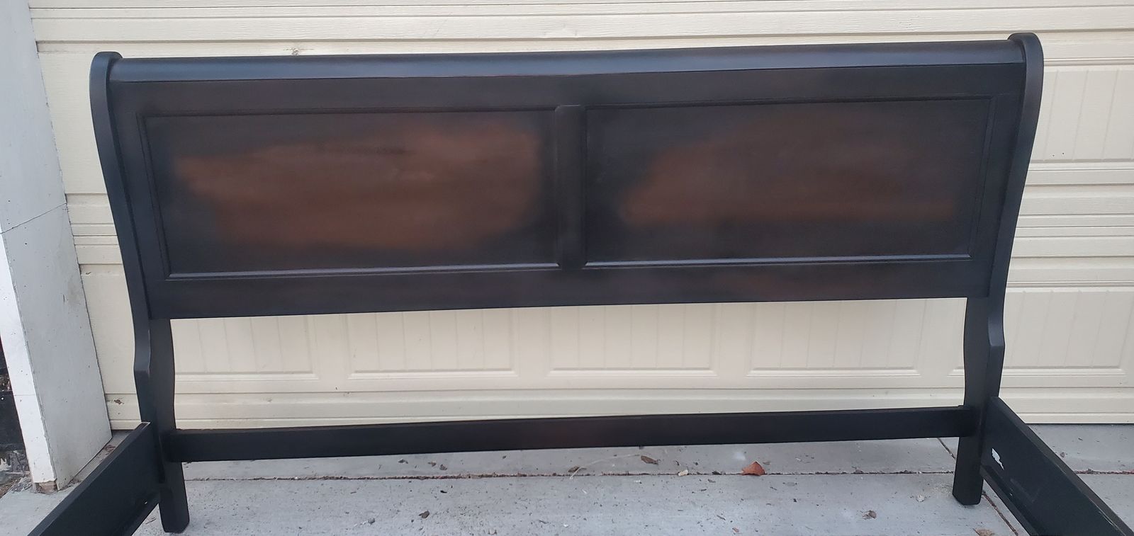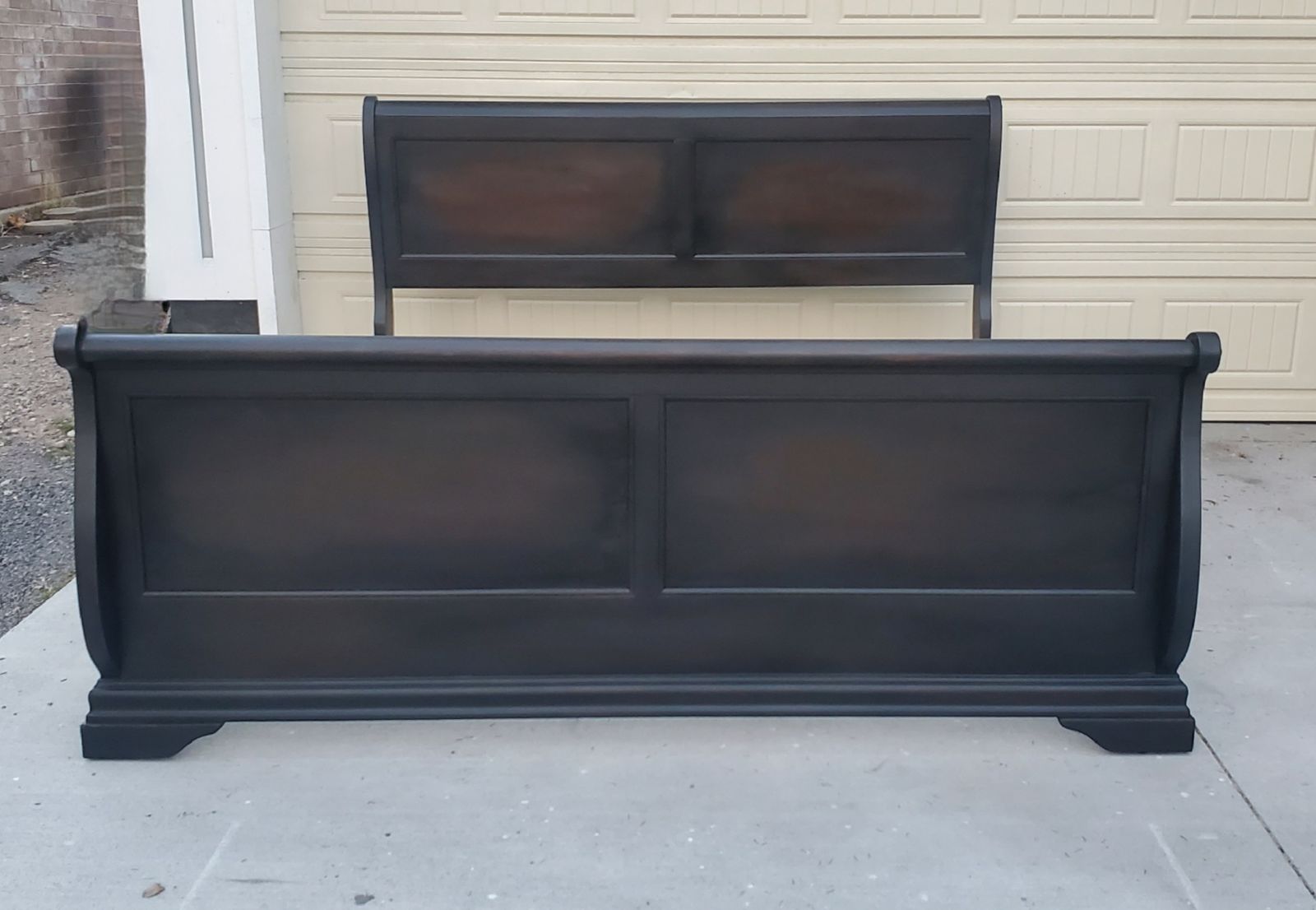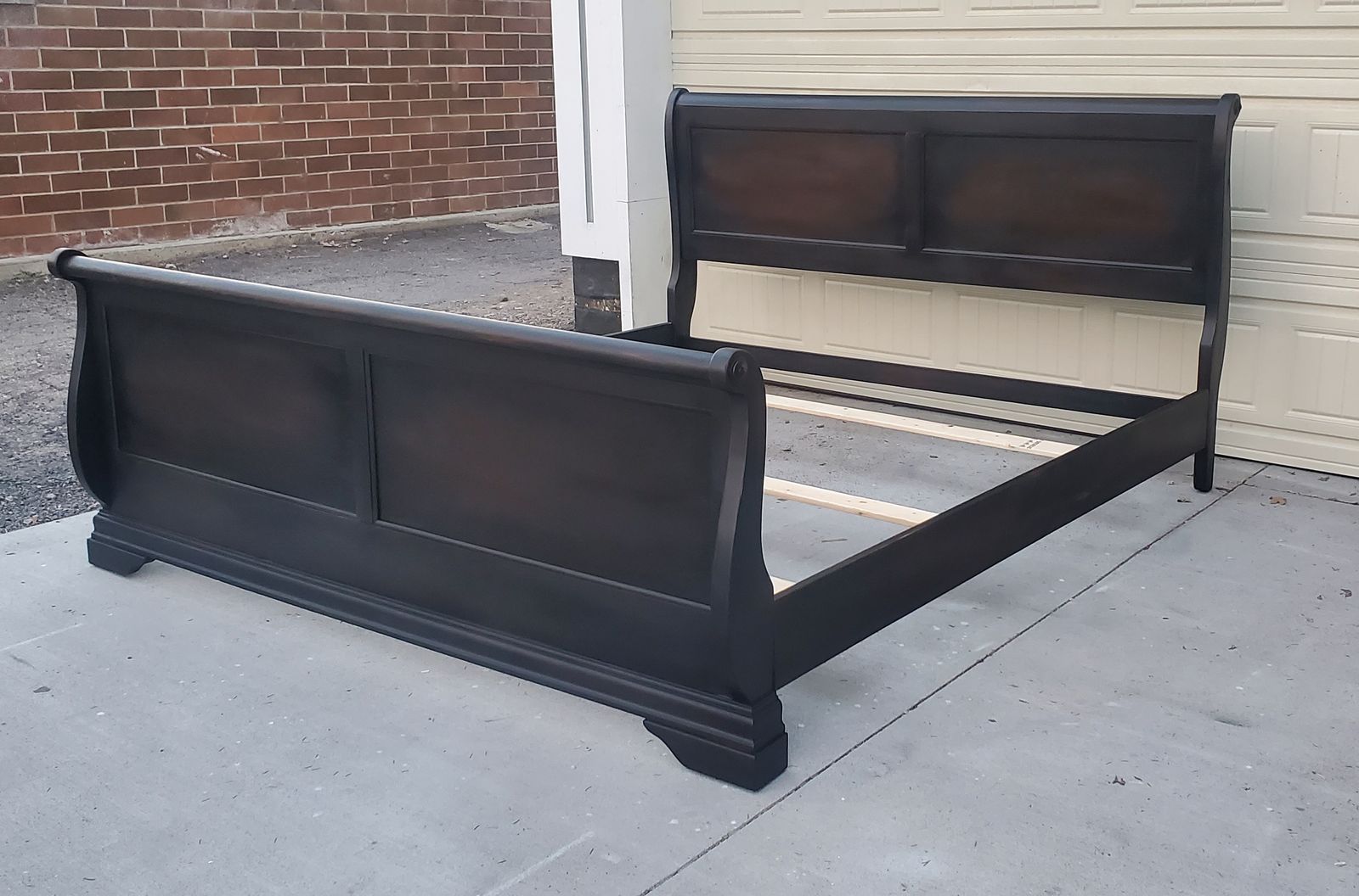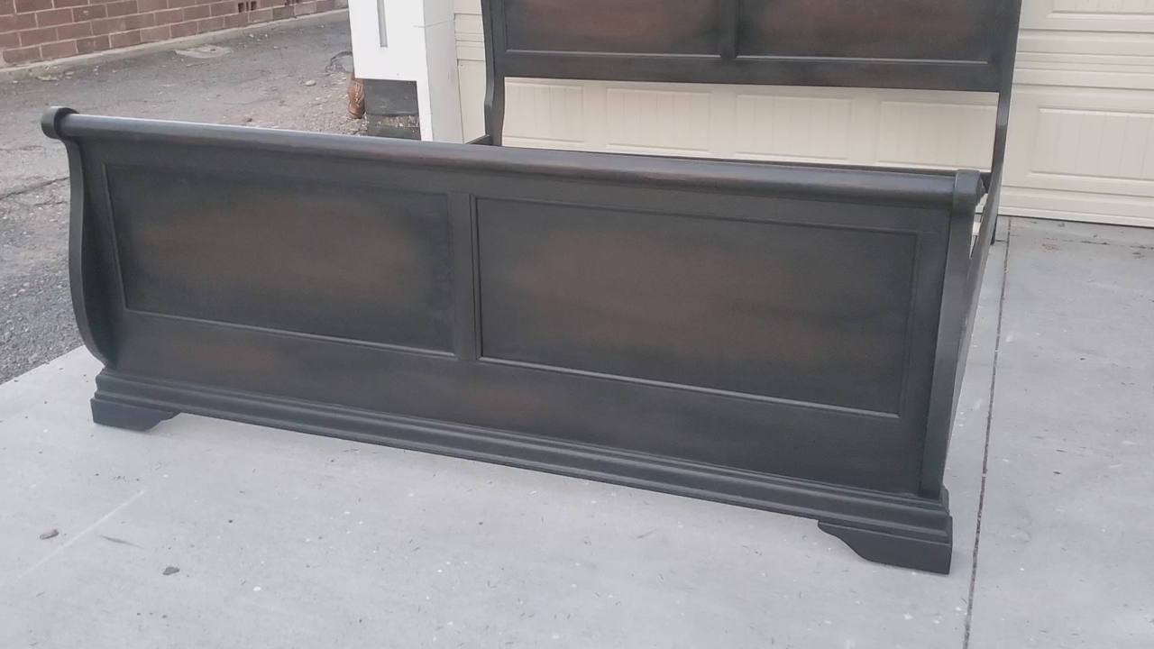 This striking, versatile king sleigh bed has recently been made better than new with an artistically painted, matte black enamel paint technique that allows areas of the woodgrain/brown undertones to show beneath, which gives it a blackish-brownish hue in the right light. It can coordinate with whatever style that you are in the mood for decorating with this year! Change your mood? Switch it out! It's easy to set up, and includes 3 wood support slats.