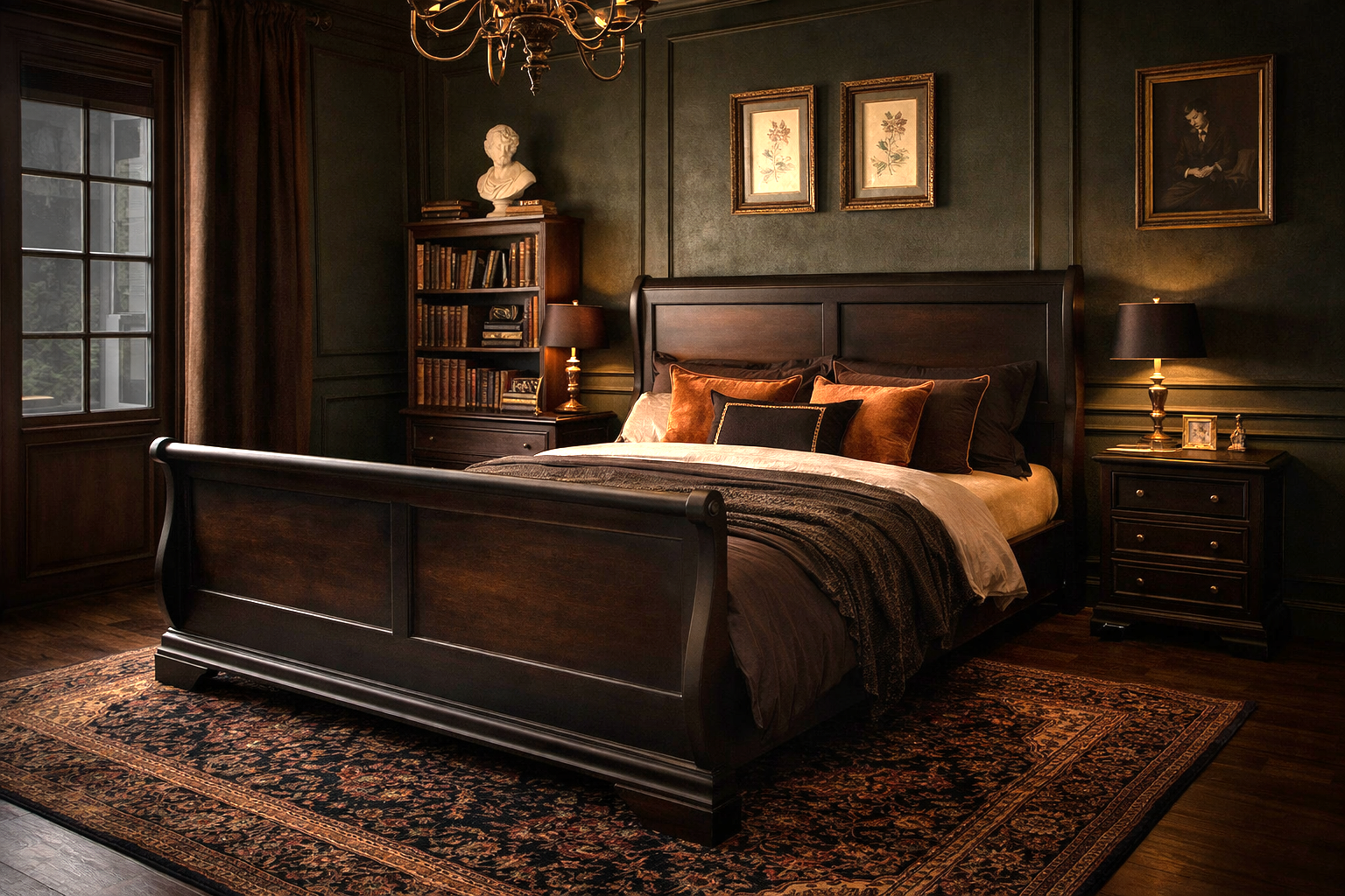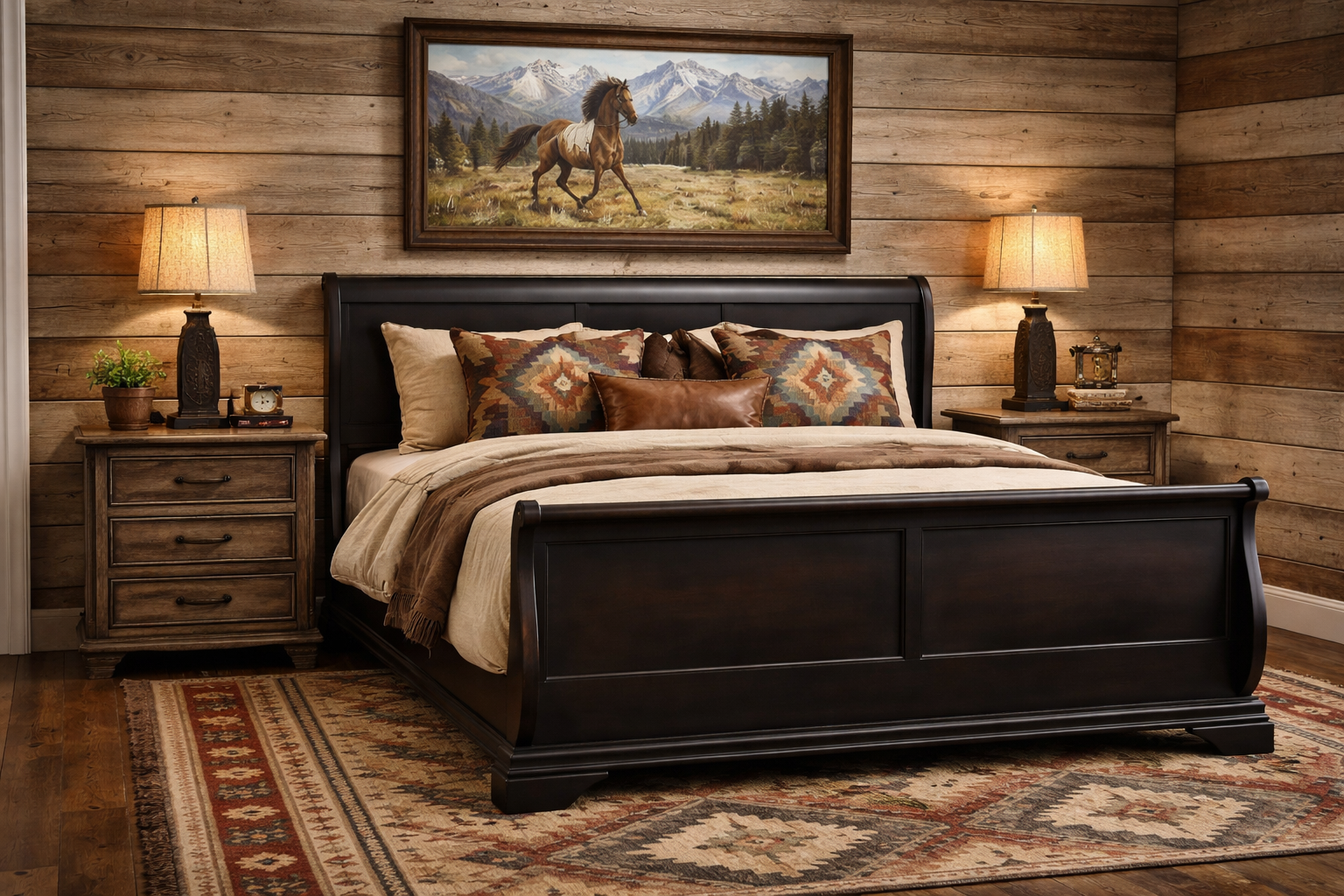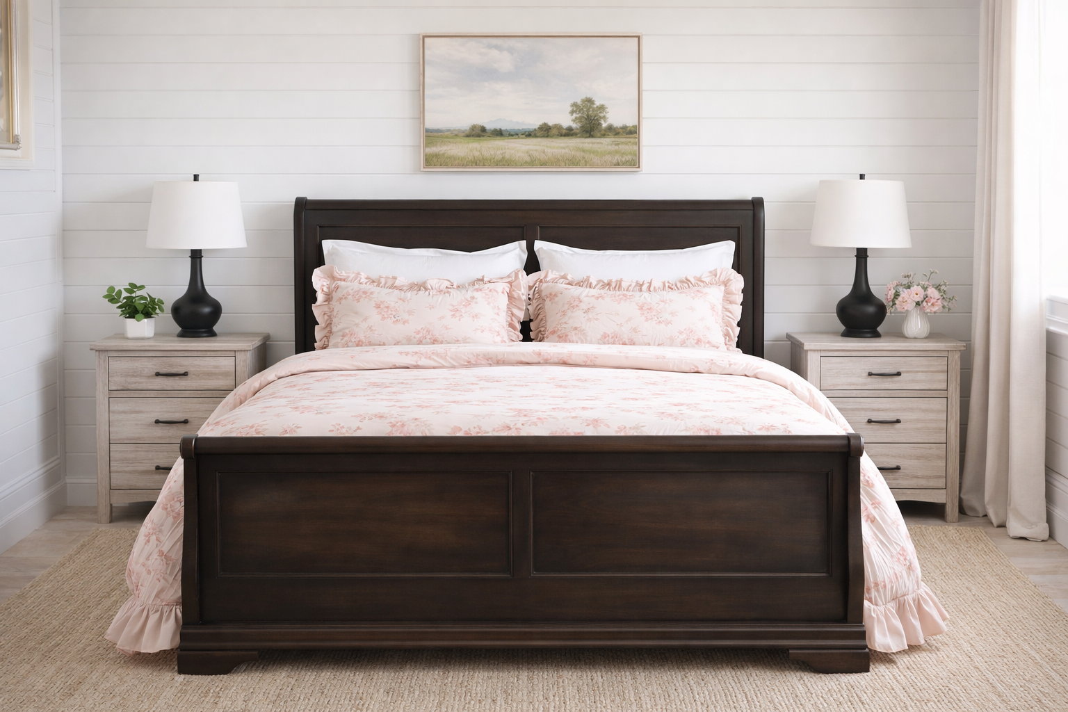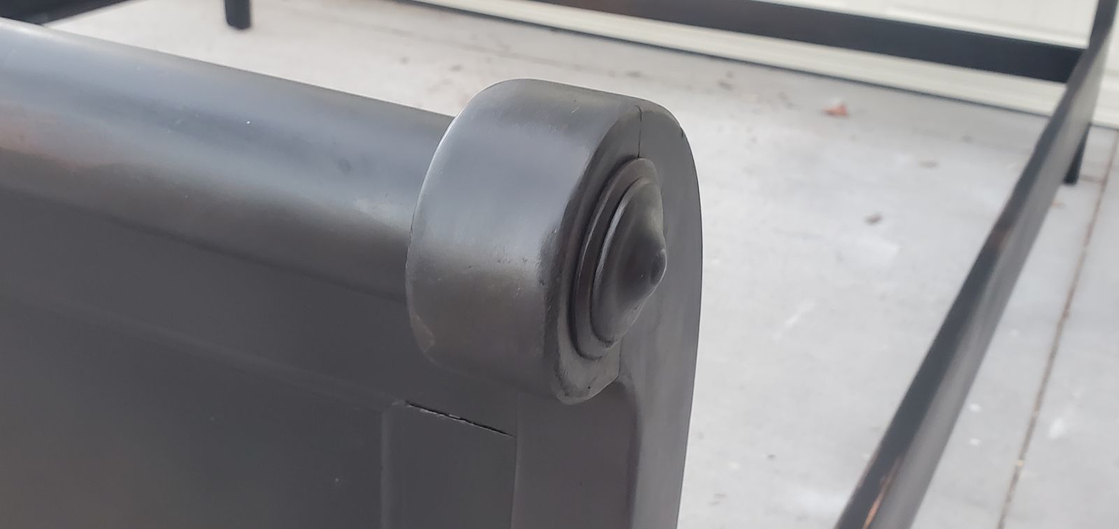 This striking, versatile king sleigh bed has recently been made better than new with an artistically painted, matte black enamel paint technique that allows areas of the woodgrain/brown undertones to show beneath, which gives it a blackish-brownish hue in the right light. It can coordinate with whatever style that you are in the mood for decorating with this year! Change your mood? Switch it out! It's easy to set up, and includes 3 wood support slats.