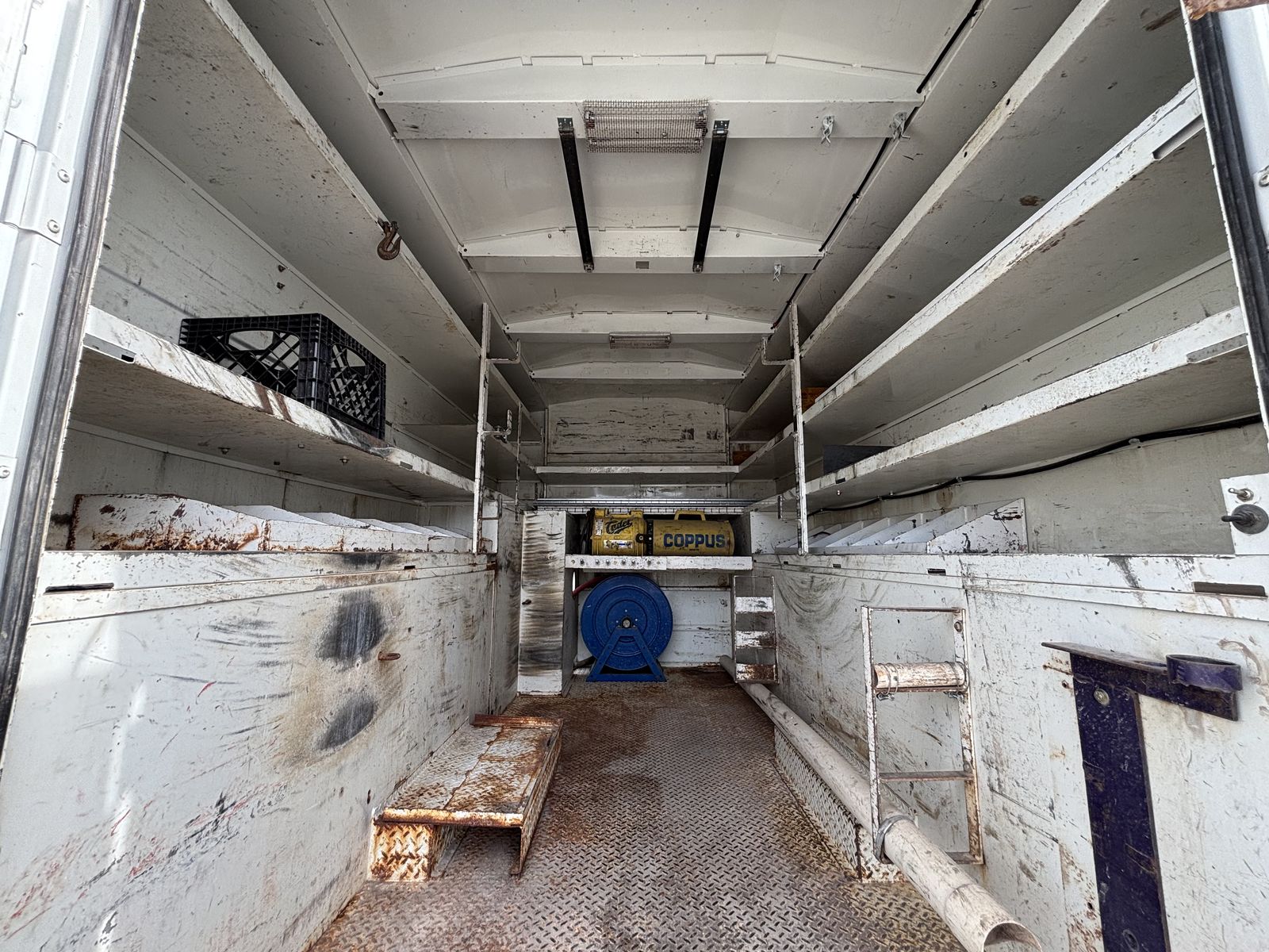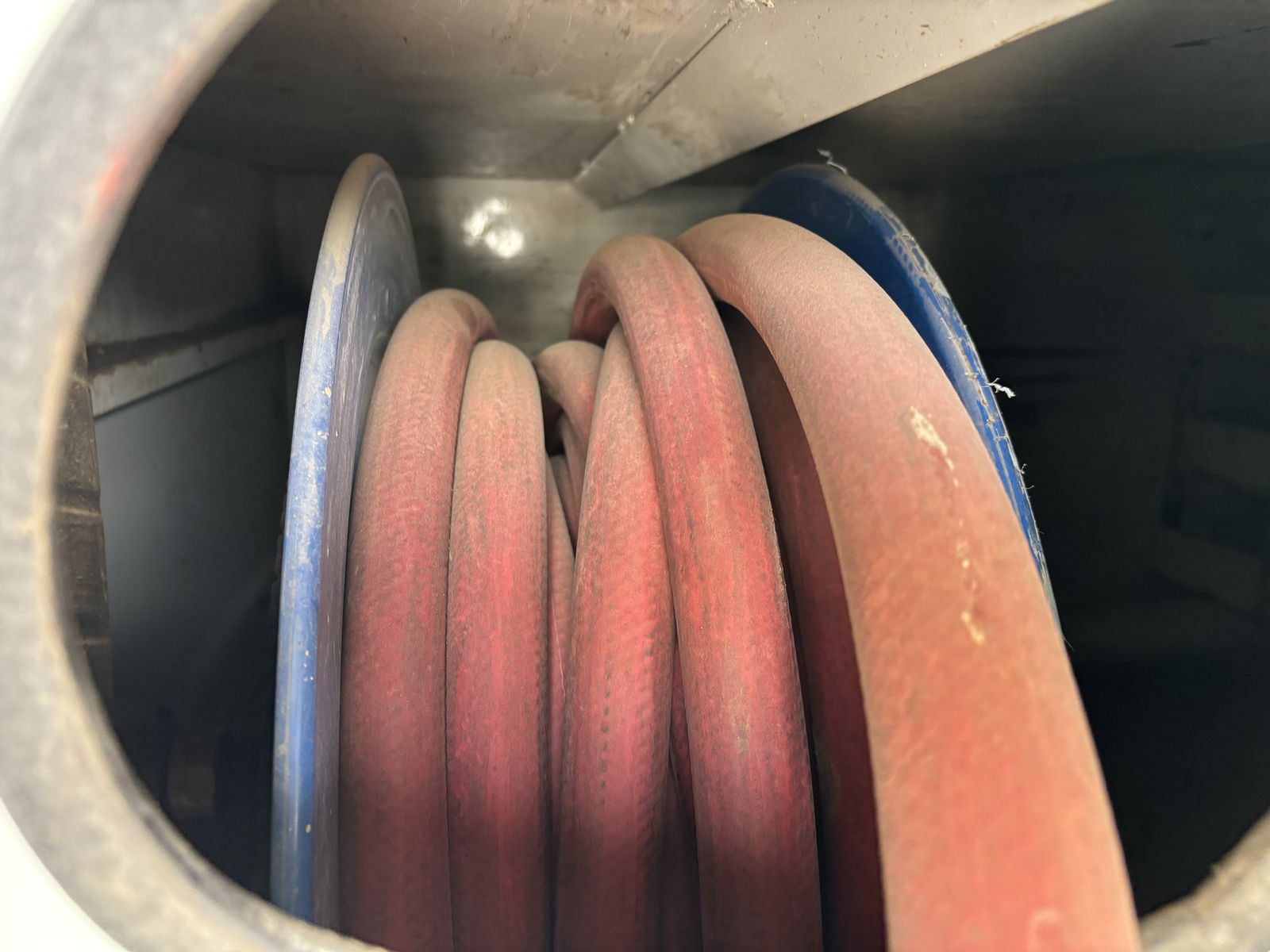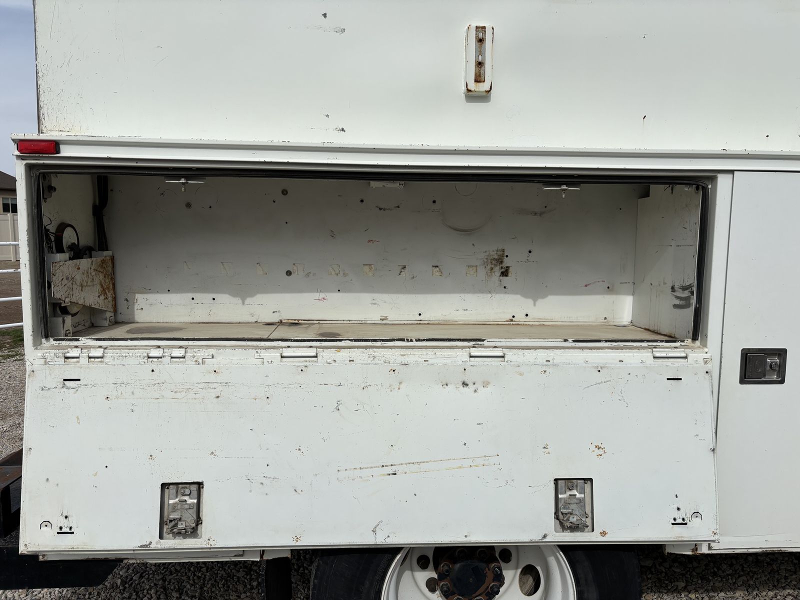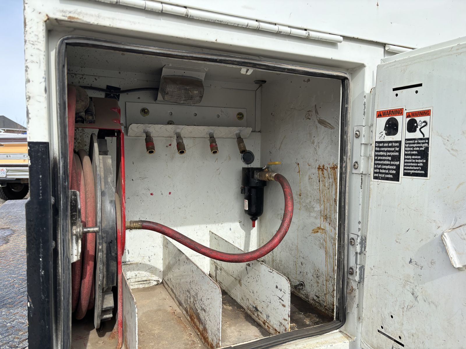 -VanAir compressor (PTO driven) •I have oil and a filter for an oil change for the compressor. •Two hose reels one on each side 1” and 3/8” the 1” has a power reel. -Tank holder for torch -Comes with a Copus Cadet blower with power hook ups on each side of the truck to operate the blower. -backup alarms -strobes -full lighting in all bins and box -Both seats have air ride
