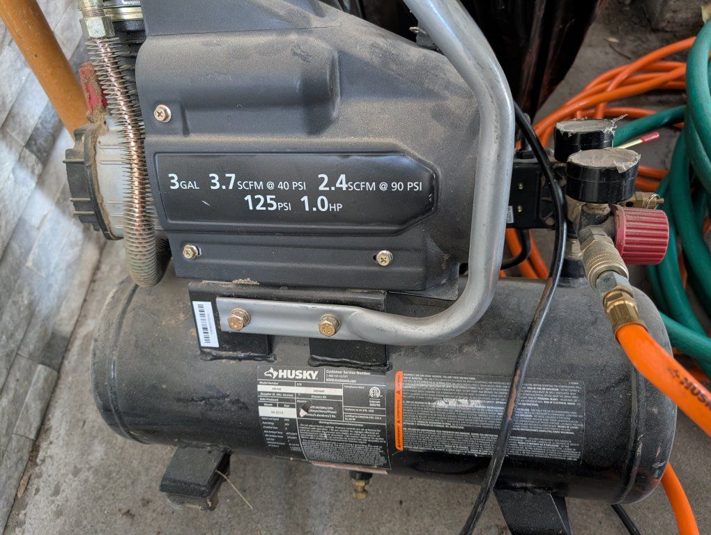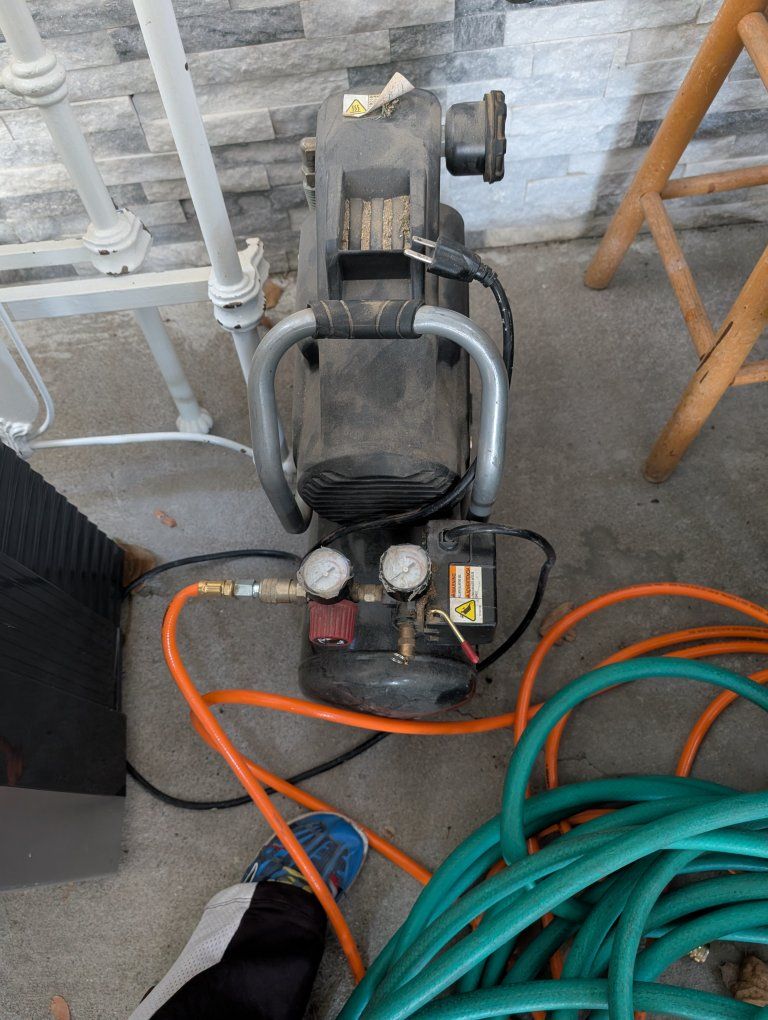 Venmo3 Gal. 150 PSI Portable Electric Oil-Free Horizontal Hotdog Air Compressor with Rubber Wheels and 1-Quick Coupler. I'm good condition and works great, normal wear and tear. comes with hose and accessories. asking $50