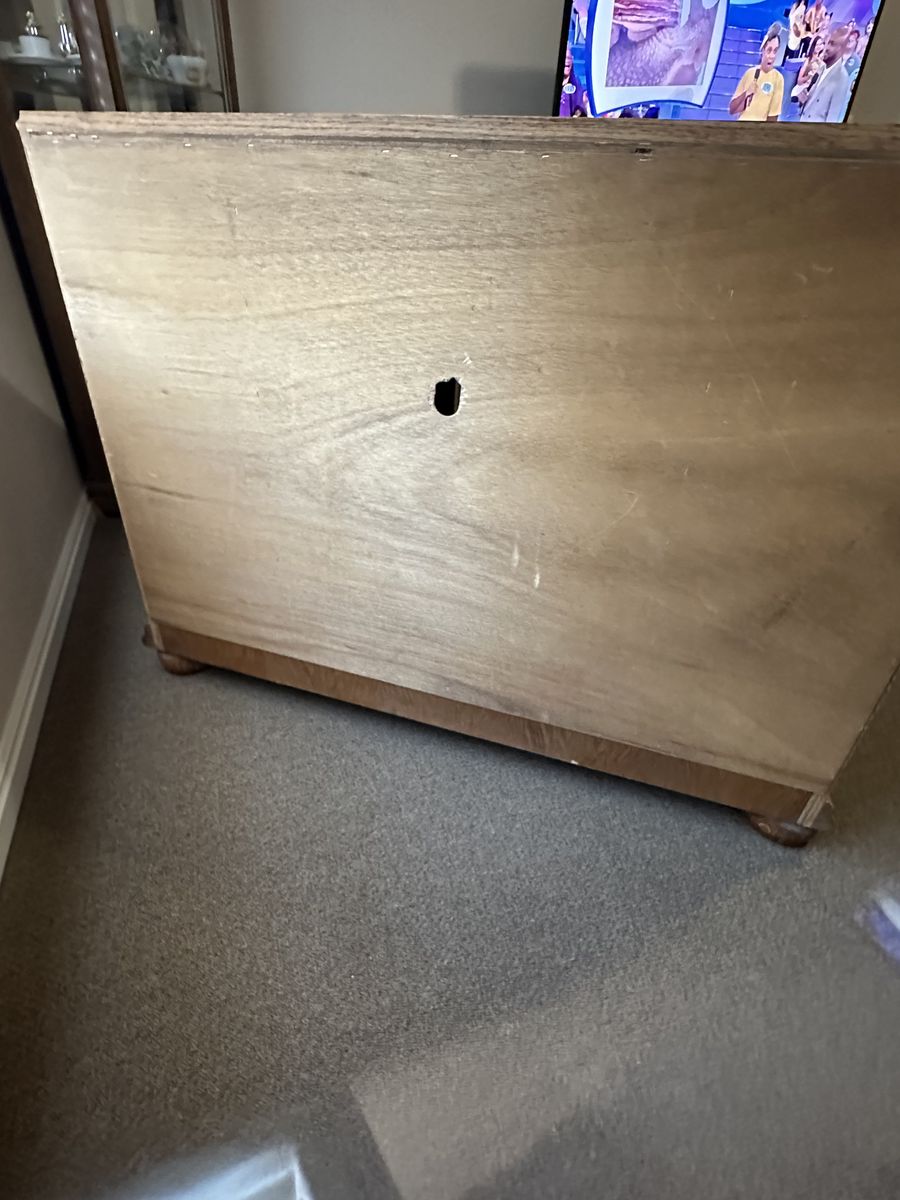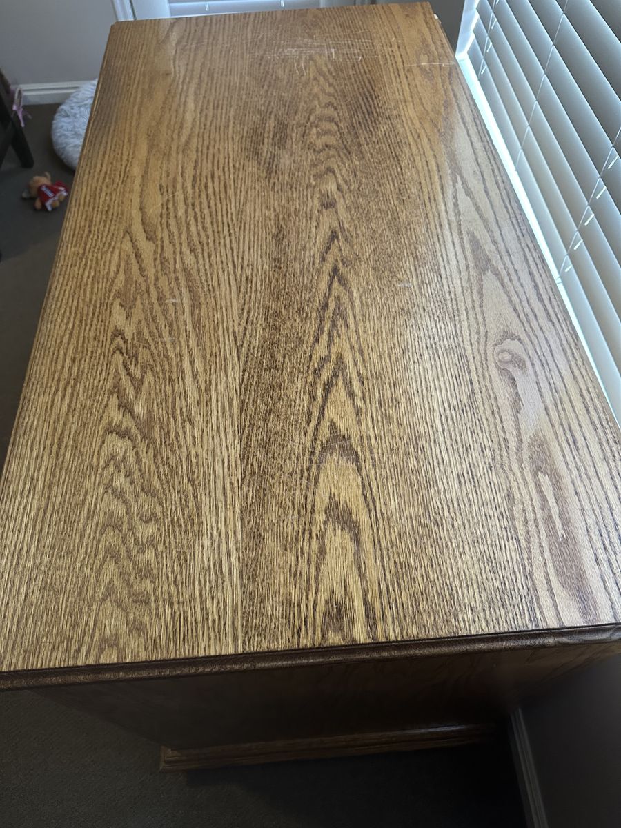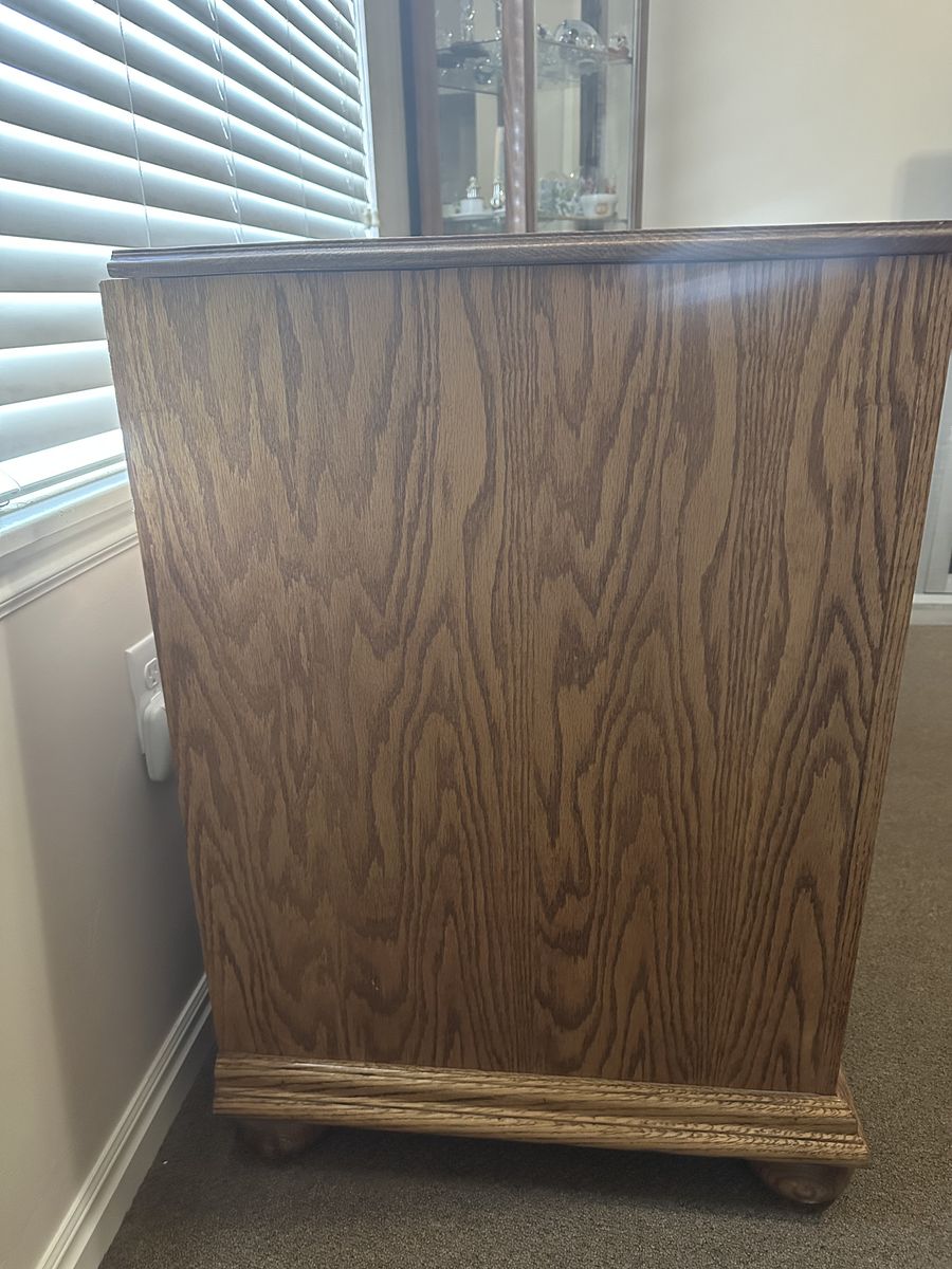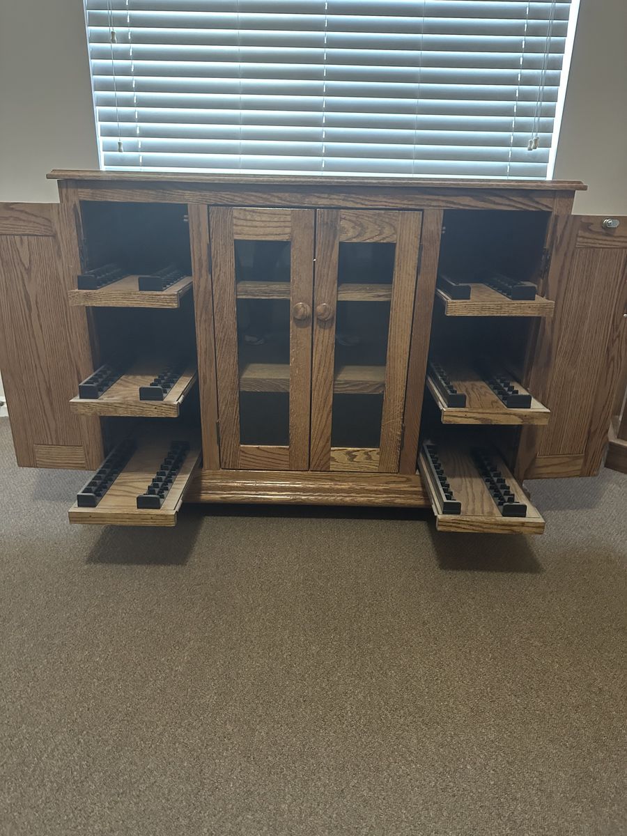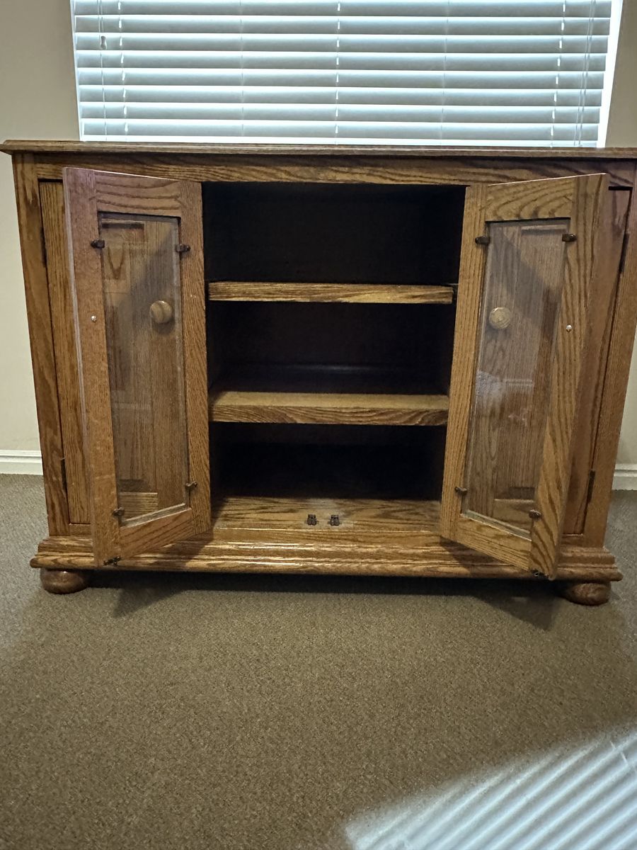 This beautiful vintage cabinet is solid oak. It measures 48"W x 24"D x 35"H. There are two adjustable shelves behind the glass doors. Each side has three pull-out shelves with brackets for vhs tapes. It is in great condition with the exception of a few scratches on top.