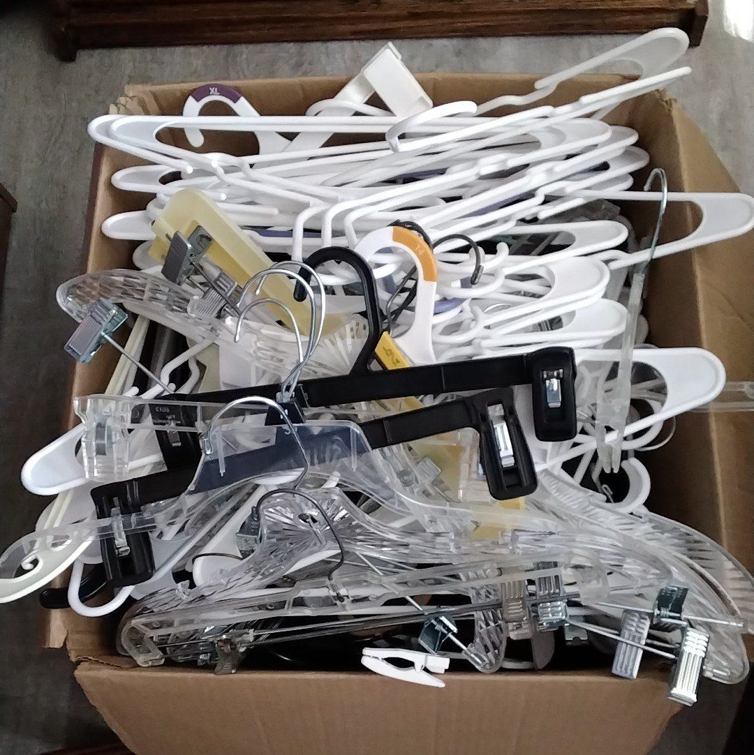 VenmoBox of assorted clothes hangers. Skirt, pants, white, black, metal, plastic. There're clean and in good shape.
