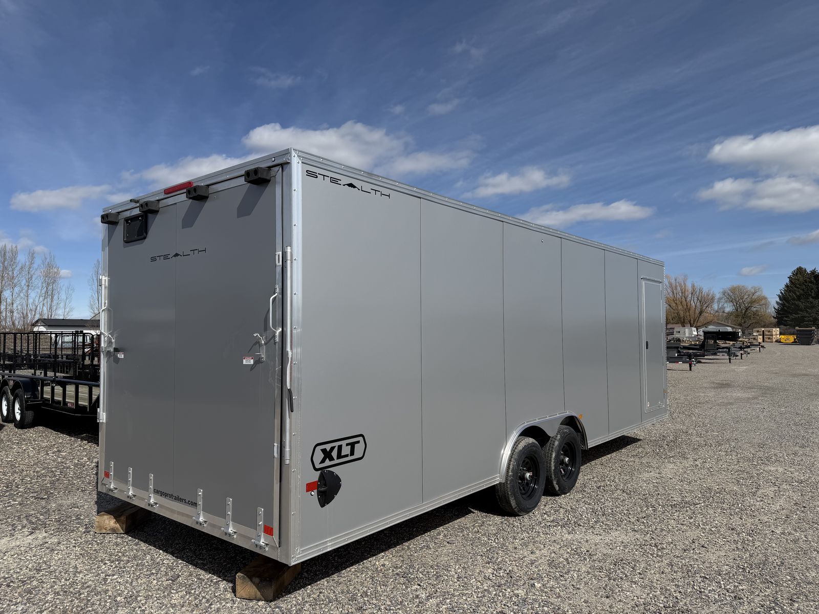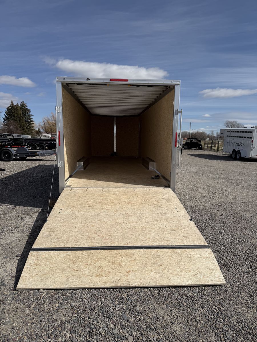 (2)5200lbs Leaf Spring Axles V-Nose Front 7' Tall Interior Height (4) Interior D-Rings Beaver Tail Ramp Rear Door .078 Exterior Sheeting RV Side Door on Curb Side
