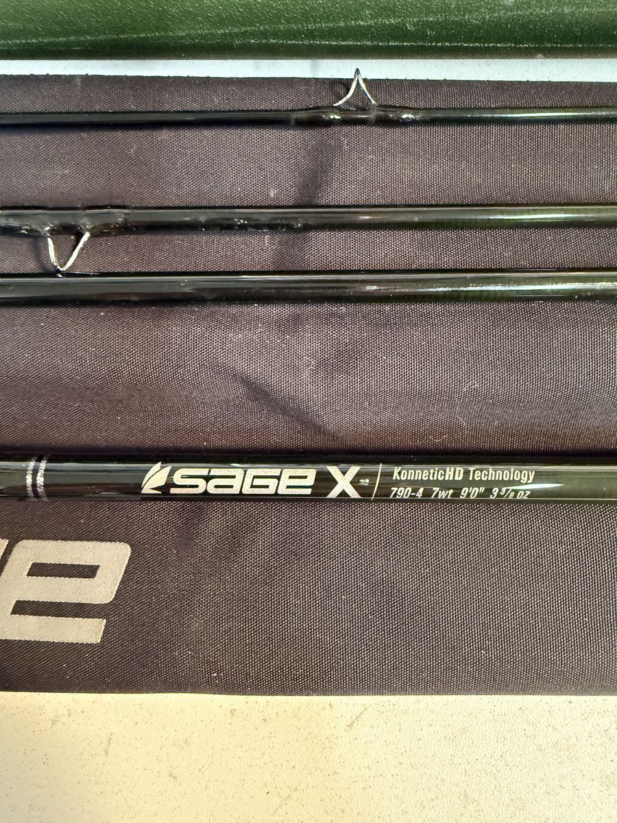 NEAR NEW, TOP OF THE LINE SAGE X FLY ROD, 9FT, 7WT, 4 PIECE