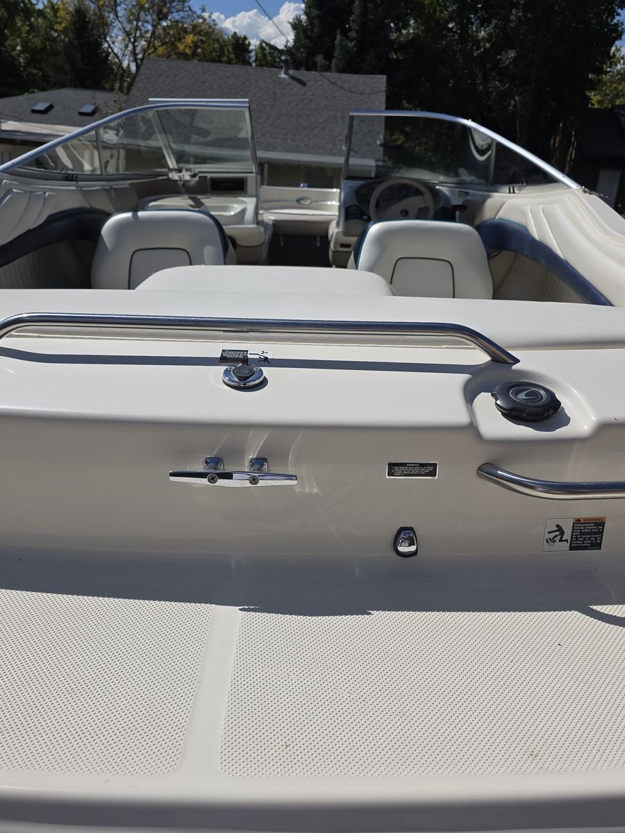· Extras: Bimini top, swim platform ladder, depth finder, AM/FM stereo, rear-view mirror