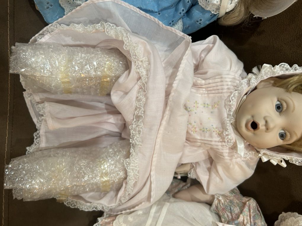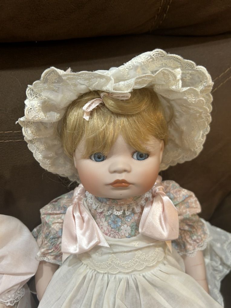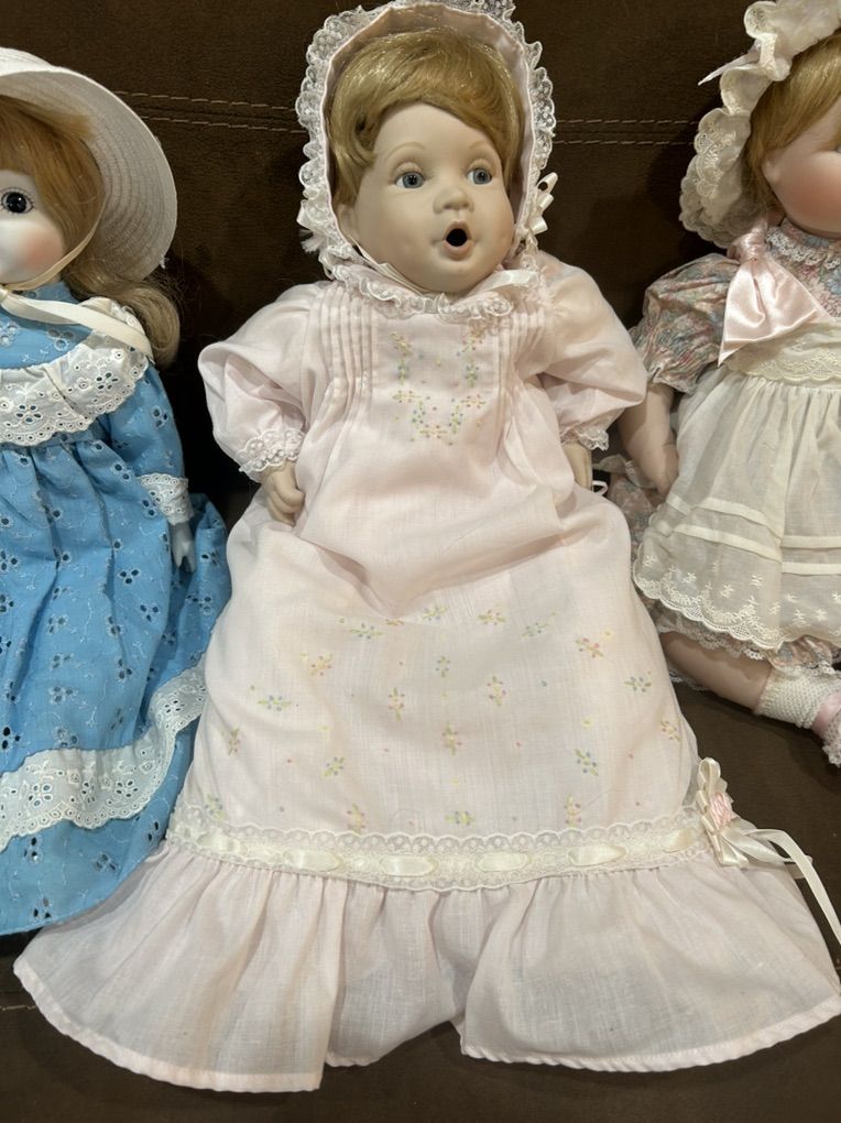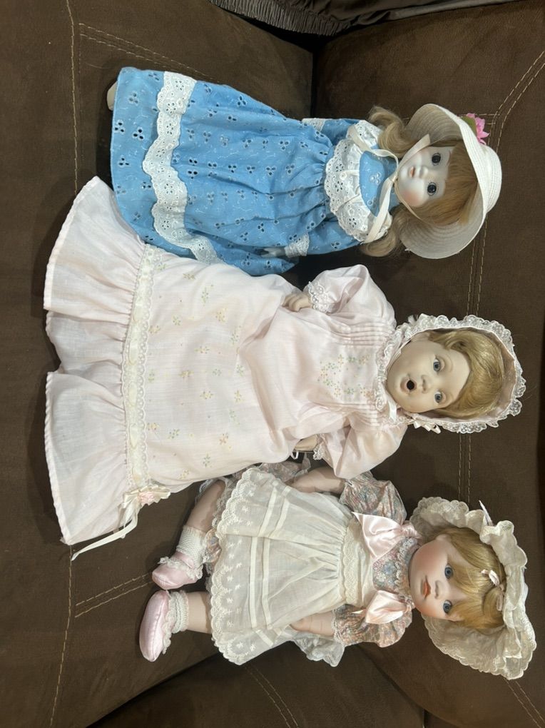 Fools for Collectors. One doll still has bubble wrap on her legs. Has been in curio and never played with z will sell all three for $40.00 total. Really cute and cared for. OBO