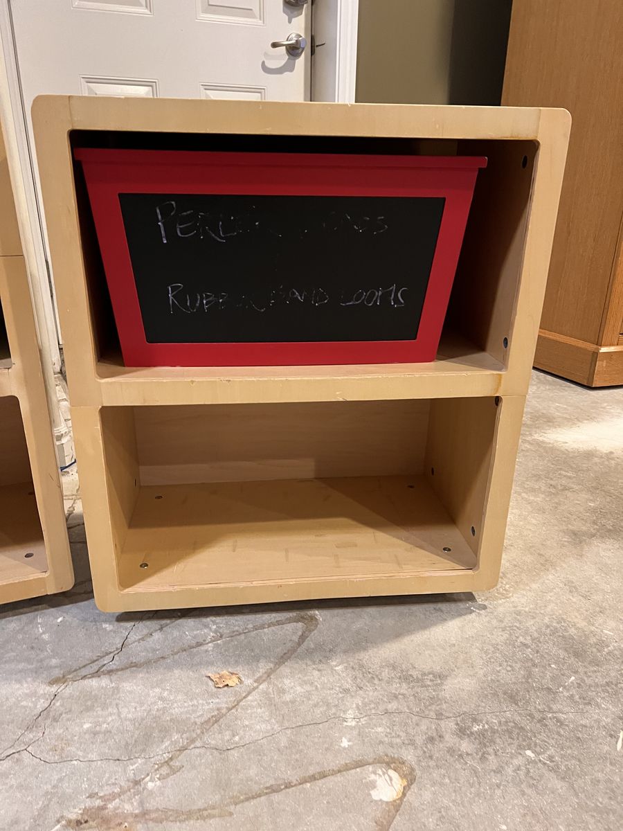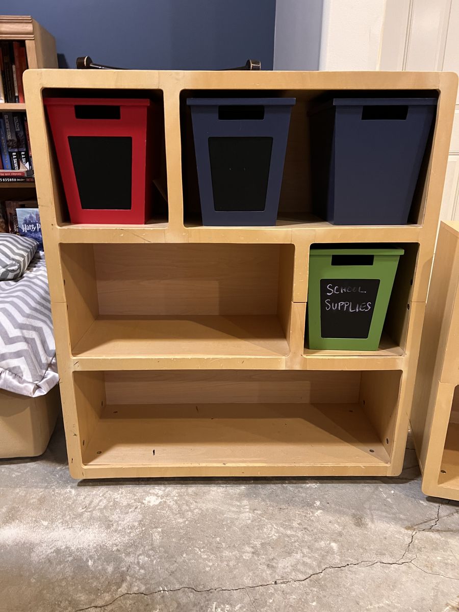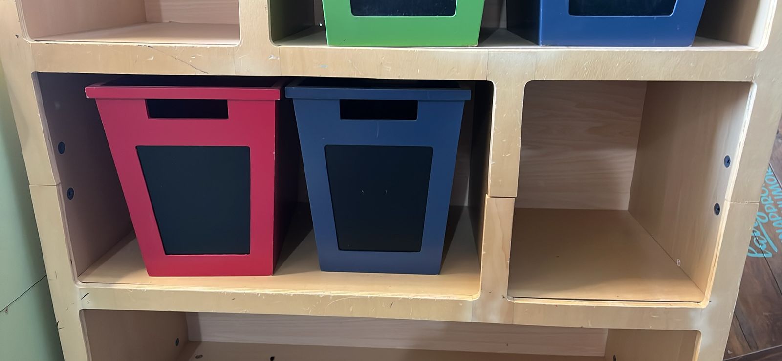 Comes with 4 small bins and 1 large bin that have chalkboard front