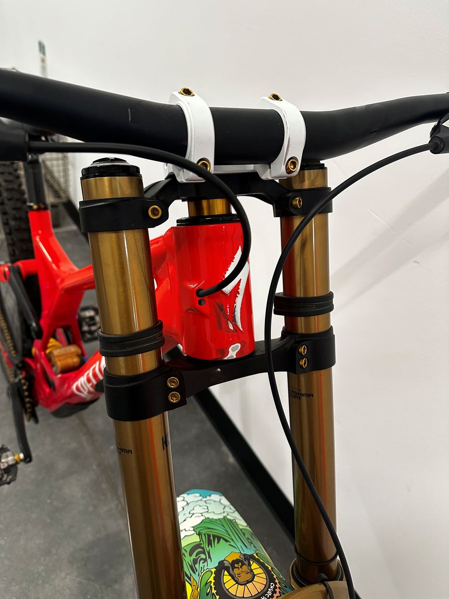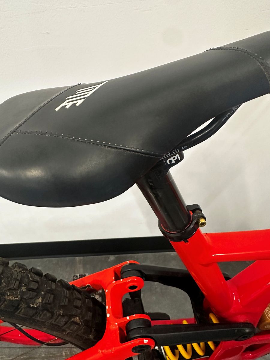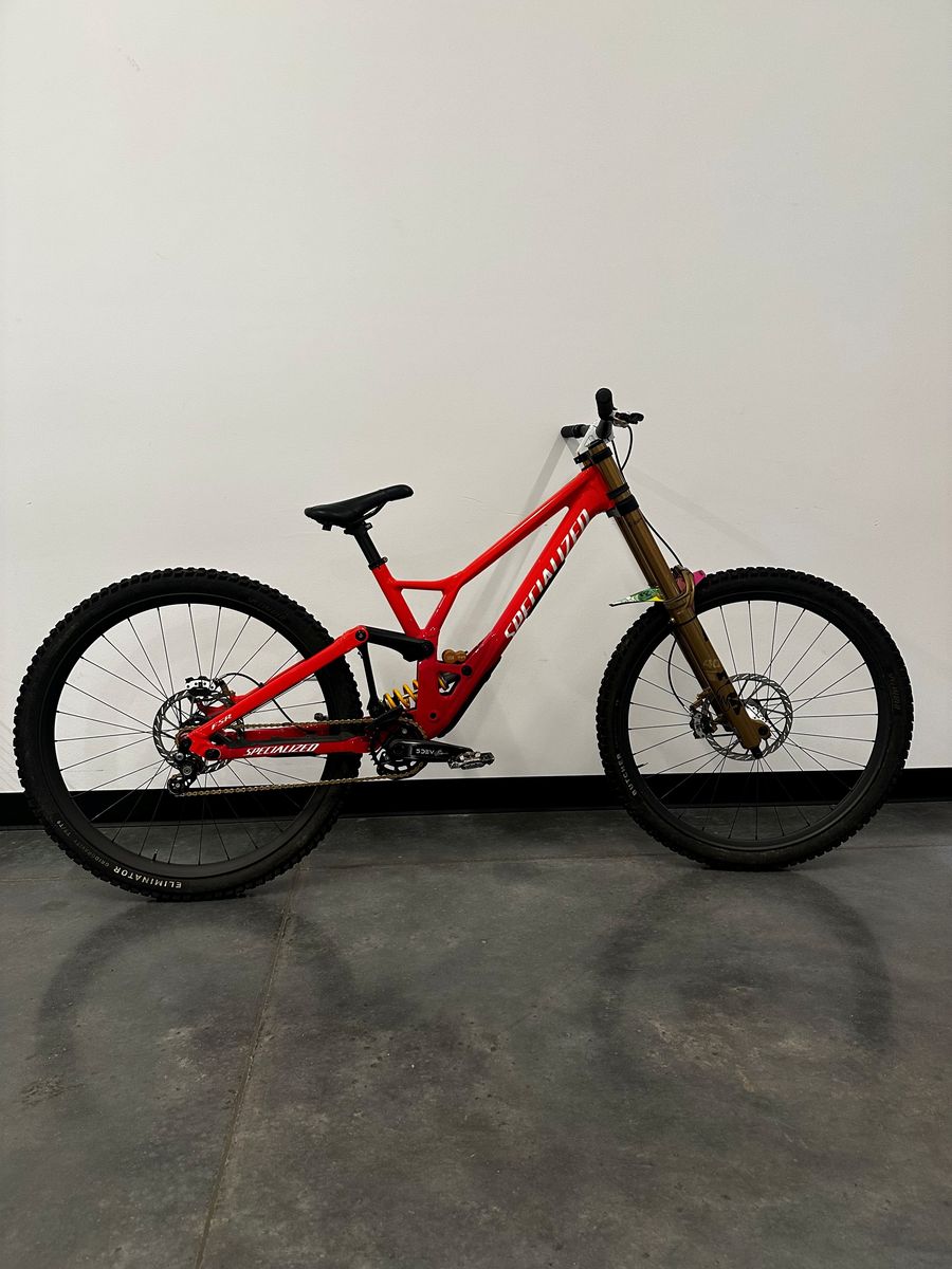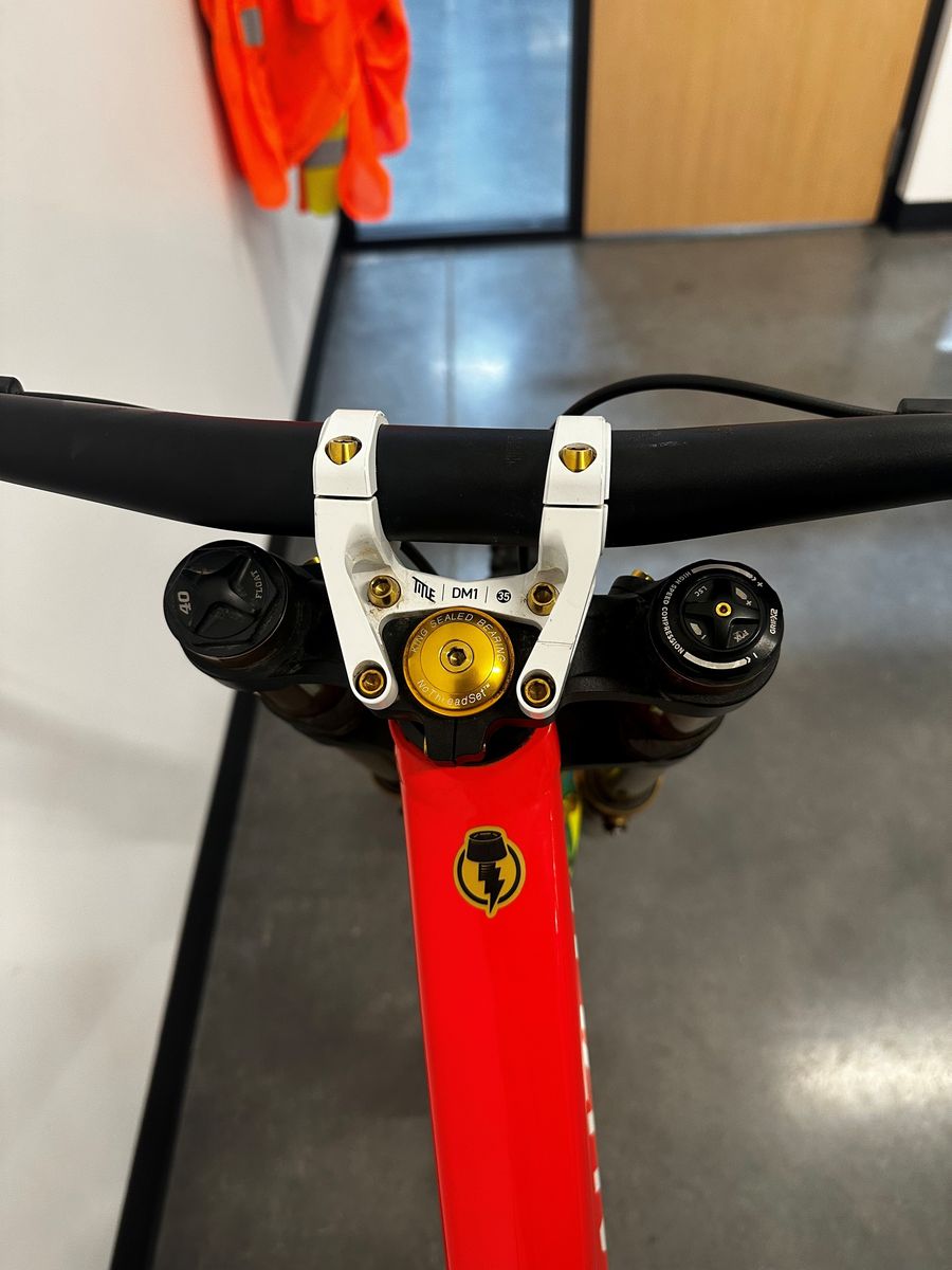 Custom built Demo with all the best parts made for bike parks. Singlespeed setup with SBC one chain tensior, Fox 40 (anniversary edition), Carbon wheels, 5dev cranks/chainring, Title stem/seat/seatpost, Sram Maven Ultimate brakes, Freedom coast gold CNC'd brake adapters, Ohlins TTX coil and gold titanium Betterbolts throughout. Slight wear near the headtube from a previous brake I had on the bike that would rub (in pictures).