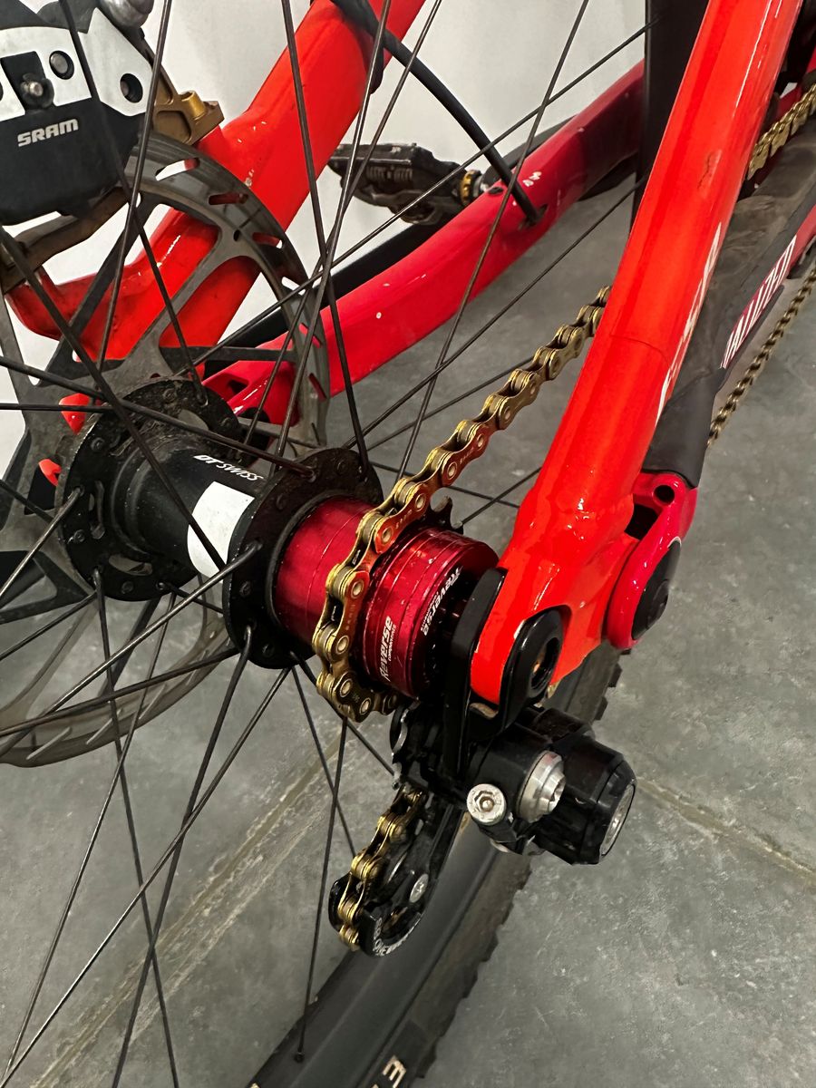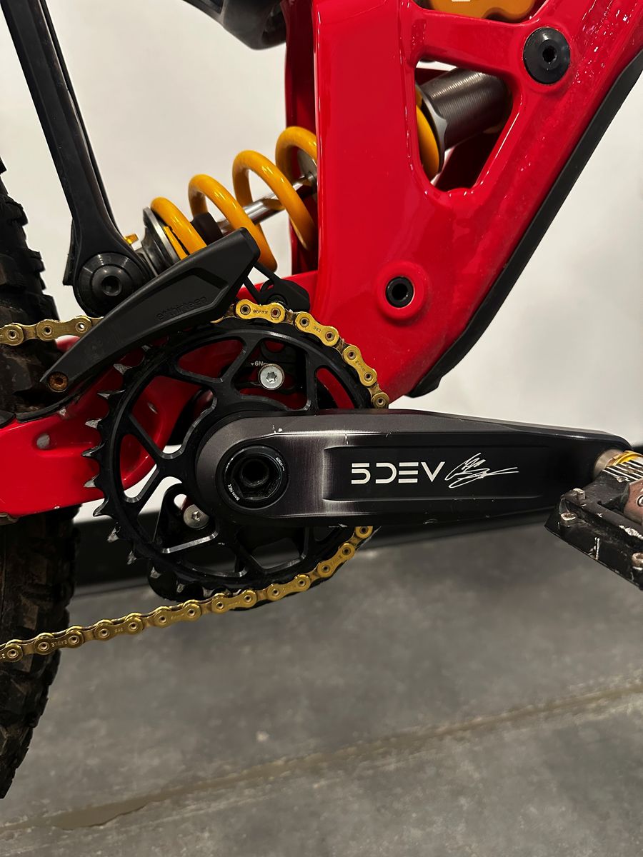 Drivetrain: SRAM XX1 gold chain, 5Dev 160mm cranks, 32t 5Dev chainring, Reverse SS setup, and SBC chain tensior
