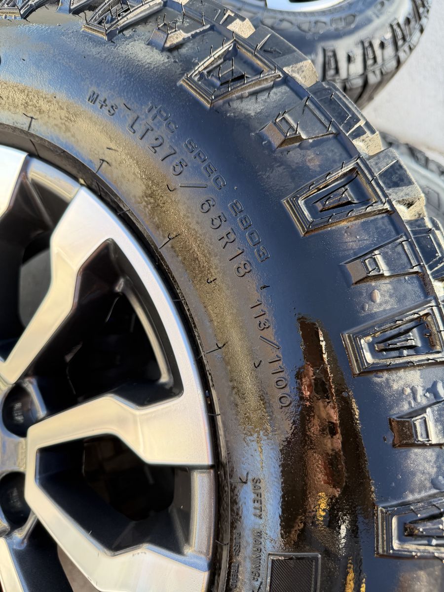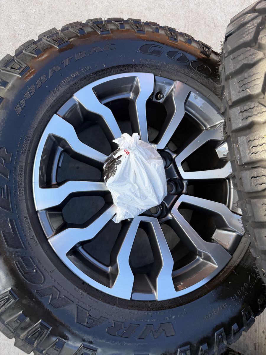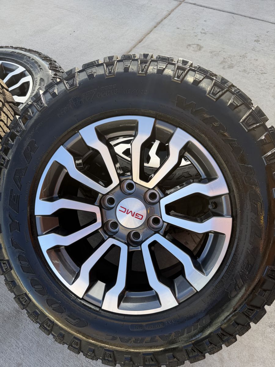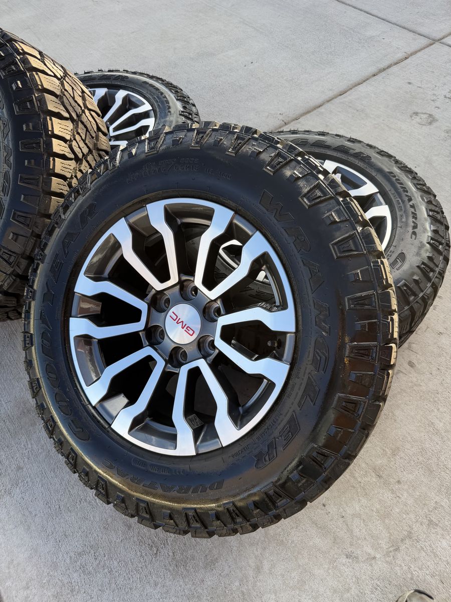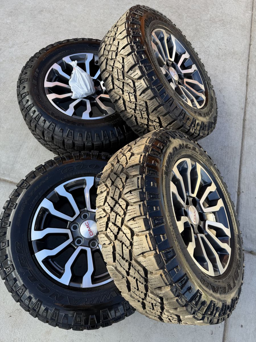 Selling my 2024 GMC sierra AT4 wheels and tires in like new condition tires are 275/65r18 Goodyear wrangler duratrac 6x5.5 lug pattern