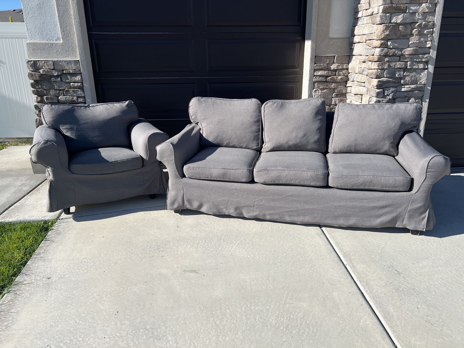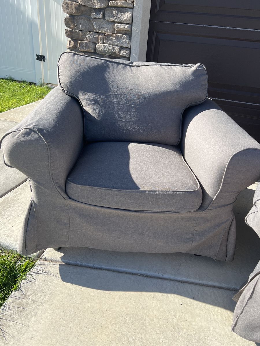 VenmoPottery Barn Basic Sofa and IKEA sofa chair. Very old, but a great starter set. Bought matching covers online. Covers are a bit worn, but cute, clean, and comfy.