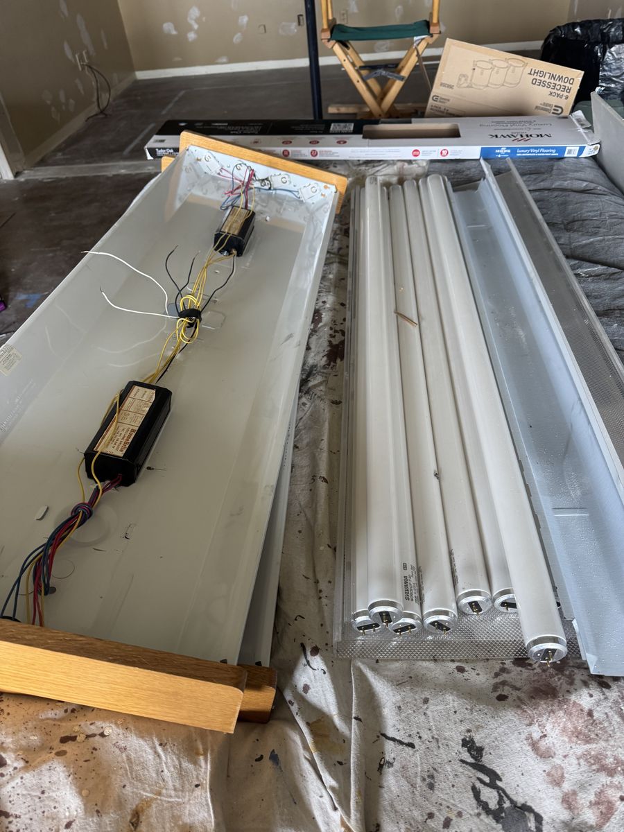 VenmoPrice for 2 florescent lights 49 inches x 16 inches. Flush mount with wraparound design. Oak in color. Includes florescent tubes as well. Perfect for garage or basement or anywhere you want to light up a space.