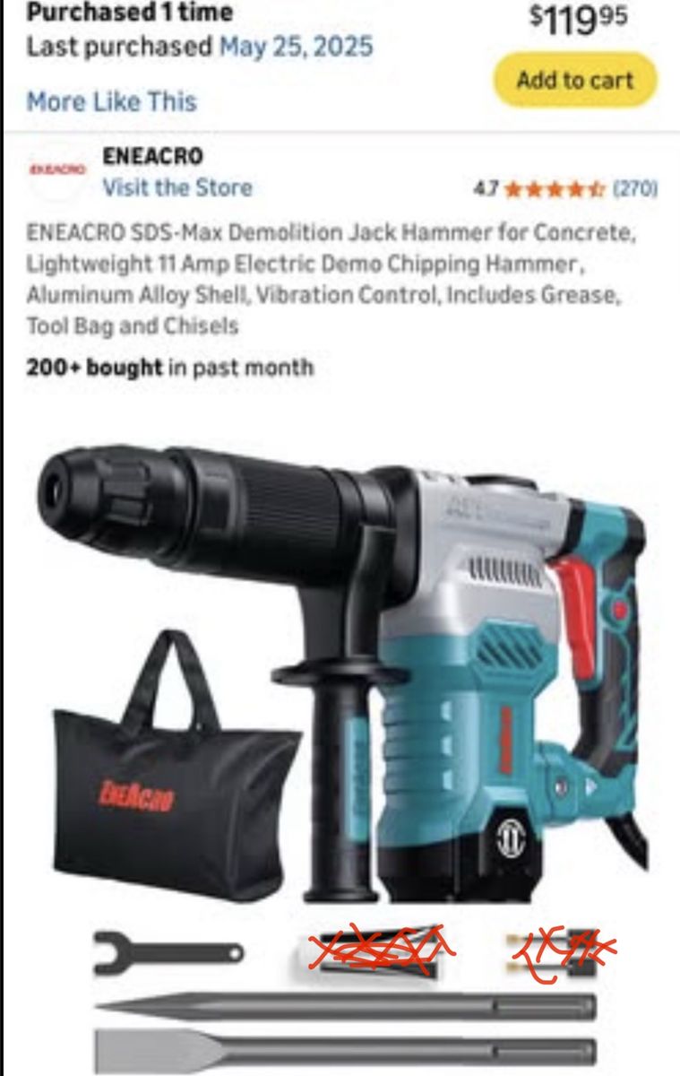VenmoENEACRO SDS-Max Demolition Jack Hammer for Concrete, Lightweight. 11 Amp Electric Demo Chipping Hammer, Aluminum Alloy Shell, Vibration Control. Tool Bag and Chisels. Plus: Firecore FS18626 3-in Wide SDS Max Scaling Chisel, Compatible with SDS Max Hammers (3 X 12)