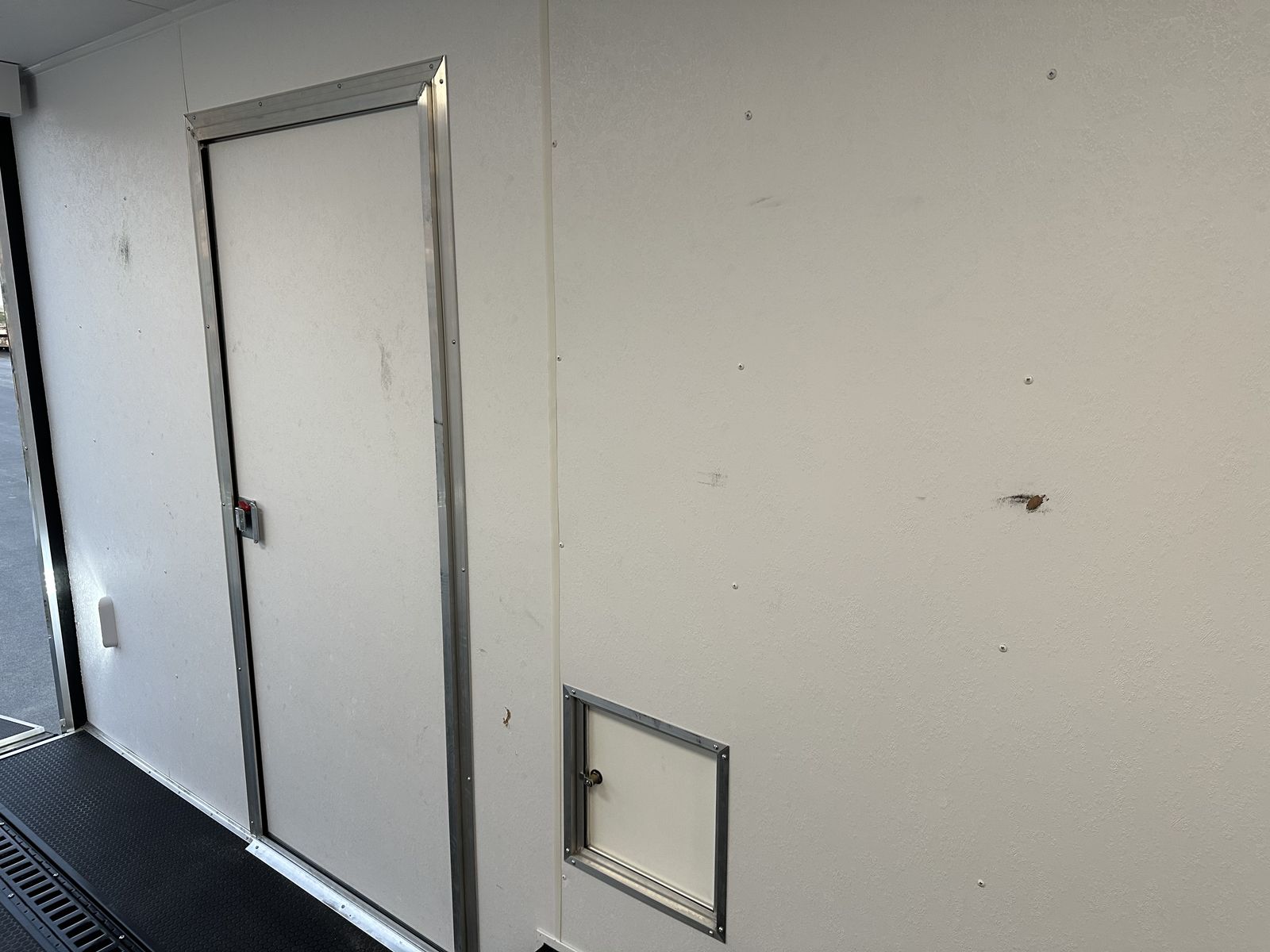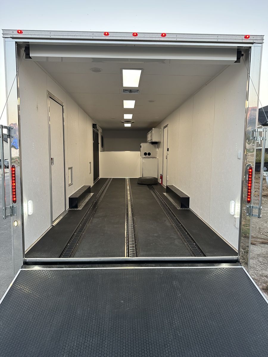 The interior has factory-installed recessed floor E-track along with upgraded rubber TPO coin flooring on the floor, riser, and ramp for durability and traction. It features a premium LED light package, 12V loading lamps, and four interior 110-volt outlets, one of which is GFI.